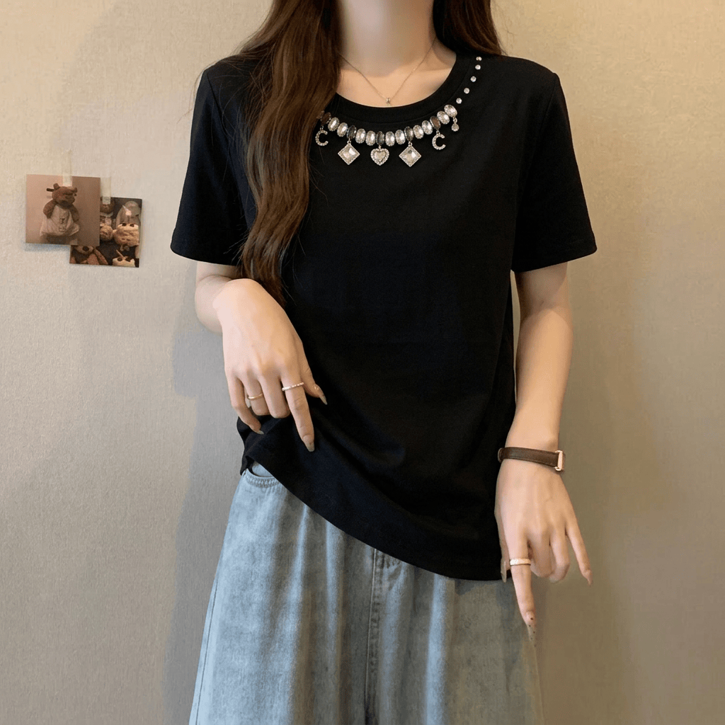 BY18138# 欧货重工镶钻短袖纯棉T恤女夏季大码胖mm显瘦宽松设计感上衣 服裝批發女裝批發服飾貨源
