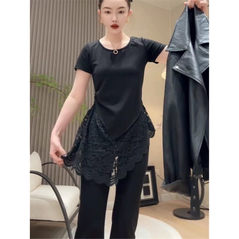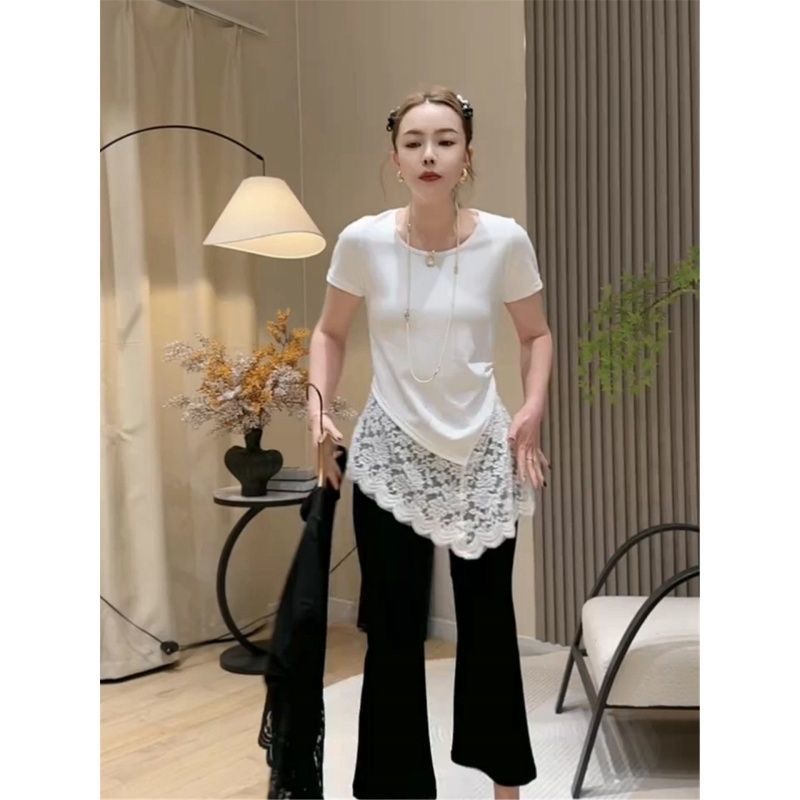 BY18183# 纯棉大码欧货蕾丝拼接短袖t恤女春夏新款宽松显瘦时尚上衣女 服裝批發女裝批發服飾貨源