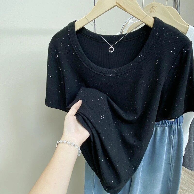 BY18199# 大码胖mm200斤小众韩系亮片设计正肩圆领短袖t恤女夏遮肉休闲上衣 服裝批發女裝批發服飾貨源