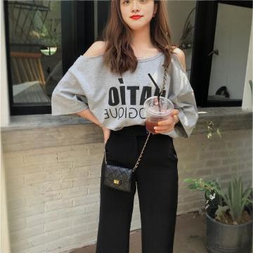 BY18217# 胖MM纯欲风一字领吊带露肩短袖T恤女300斤大码设计感宽松遮肚上衣 服裝批發女裝批發服飾貨源