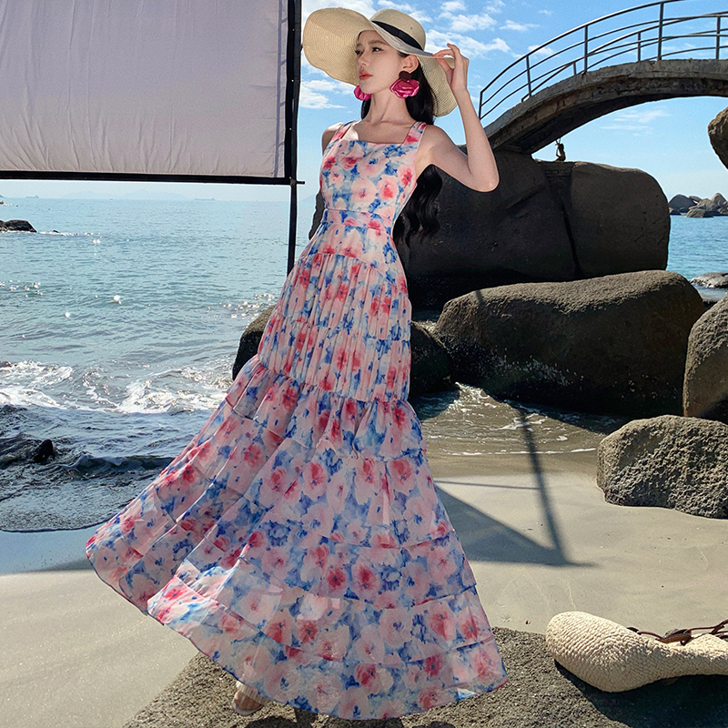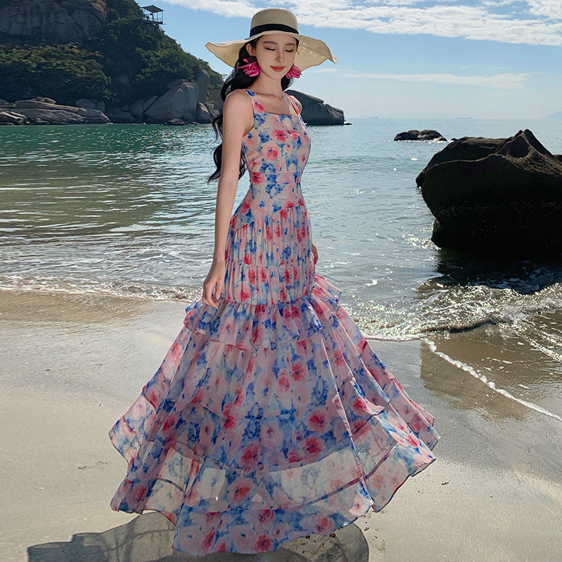 BY18275# 度假法式吊带连衣裙气质绝美碎花蛋糕裙长裙夏季新款女 服裝批發女裝批發服飾貨源
