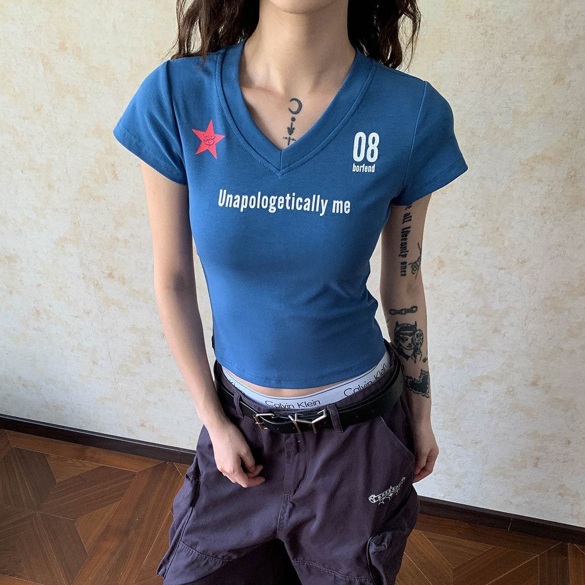 BY18366# 美式复古辣妹棉质短袖T恤夏季新款创意字母印花修身显瘦短款上衣 服裝批發女裝批發服飾貨源