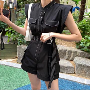 BY18422# 韩国chic夏季新款法式小众复古明线设计工装式连体裤女设计感短裤 服裝批發女裝批發服飾貨源