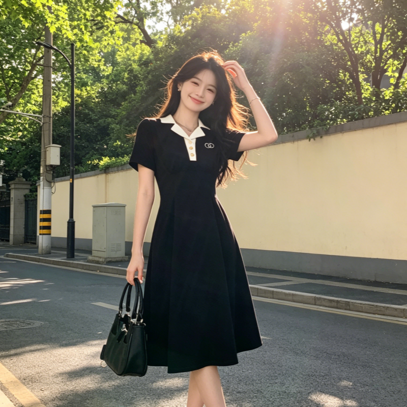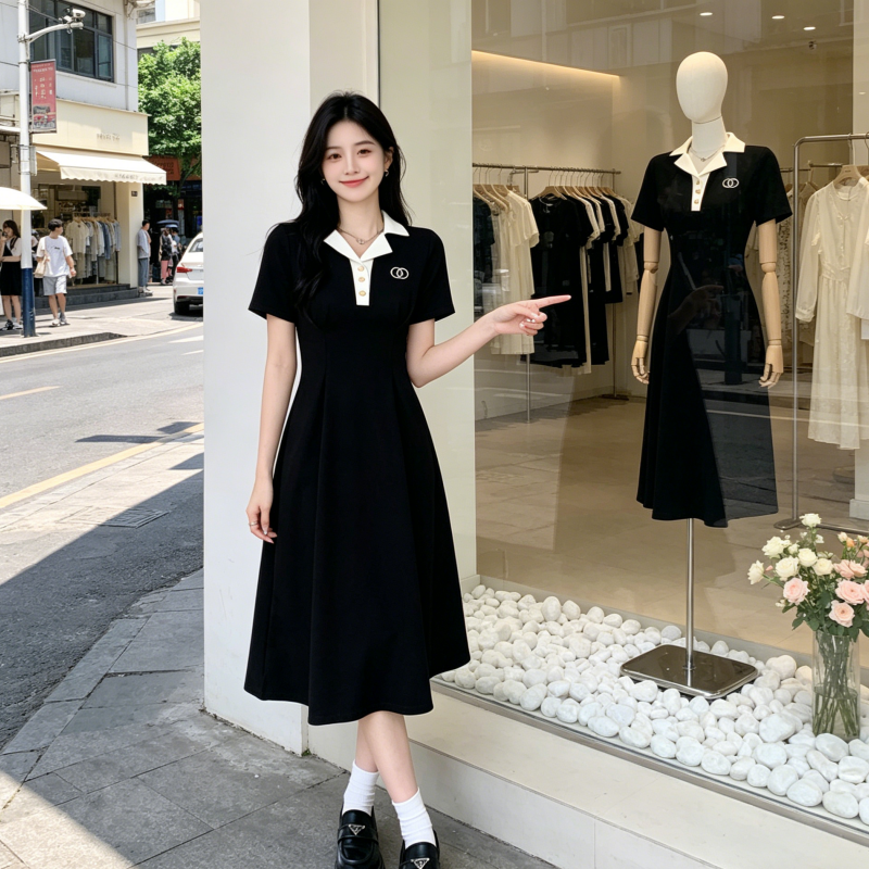 BY18460# 大码学院风收腰显瘦polo连衣裙女夏季新款胖MM梨形身材黑色长裙子 服裝批發女裝批發服飾貨源
