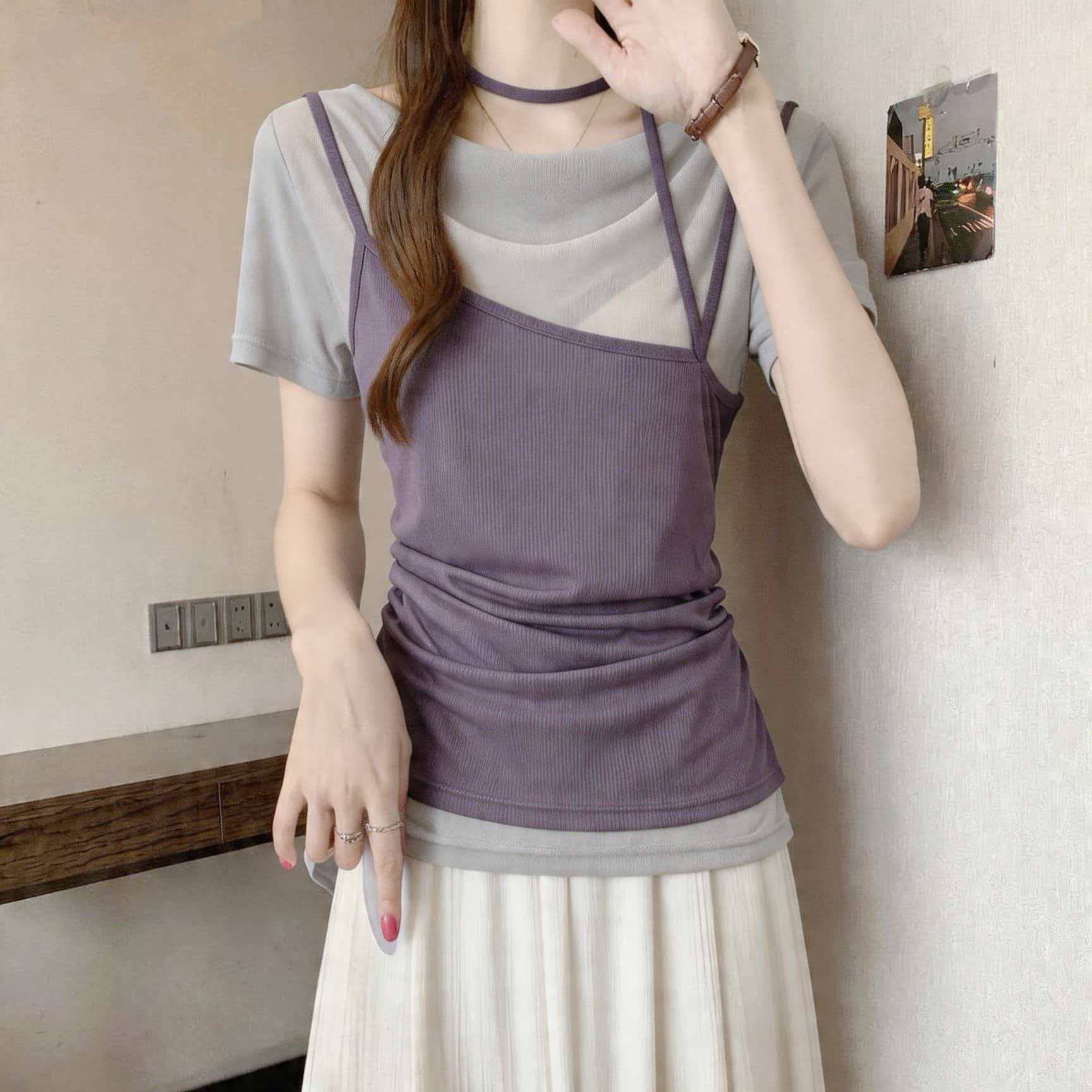 BY18478# 胖MM高级感气质荡领假两件短袖夏季新款修身显瘦正肩上衣 服裝批發女裝批發服飾貨源