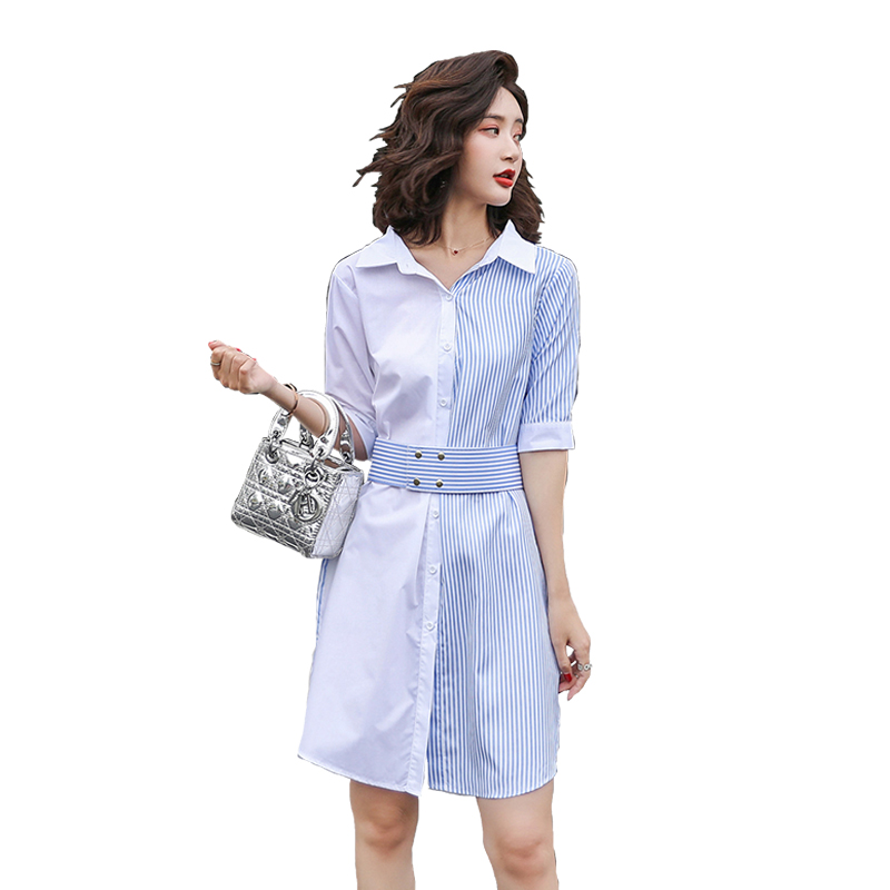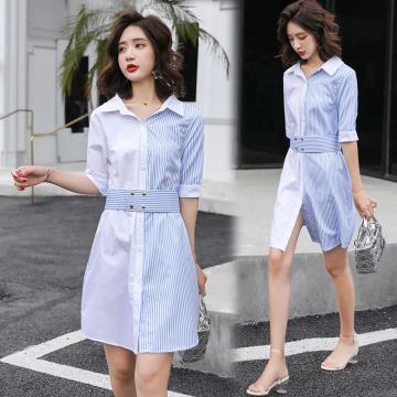 BY18565# 春夏新款韩版修身V领条纹衬衣连衣裙女中长款撞色拼接衬衫裙 服裝批發女裝批發服飾貨源