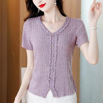 BY18722# 夏季新款温柔风V领木耳边短袖T恤女单排扣收腰显瘦洋气上衣 服裝批發女裝批發服飾貨源