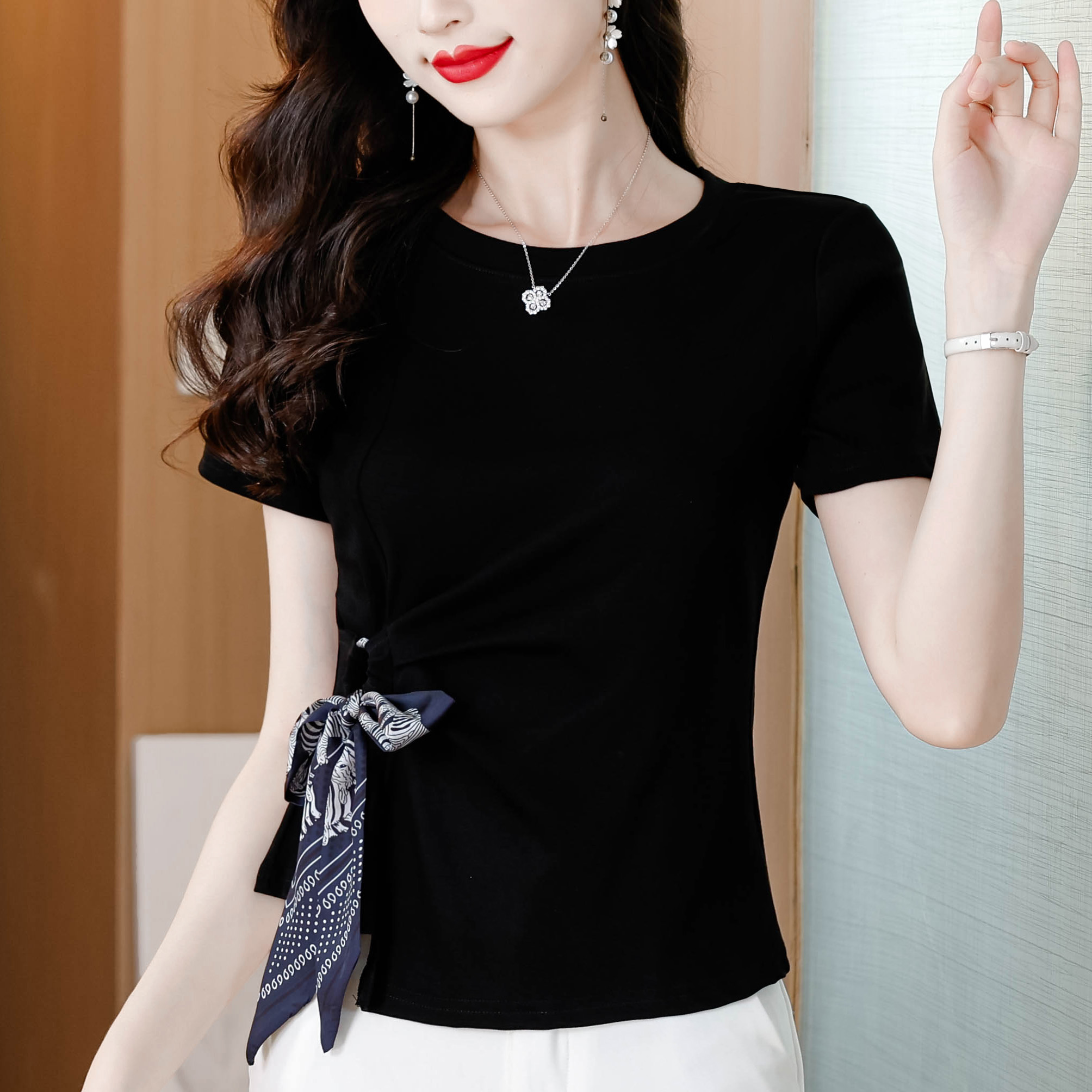 BY18724# 夏季新款圆领短袖T恤女设计感侧边绑带修身显瘦百搭洋气上衣 服裝批發女裝批發服飾貨源