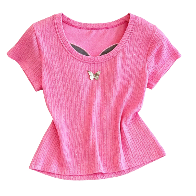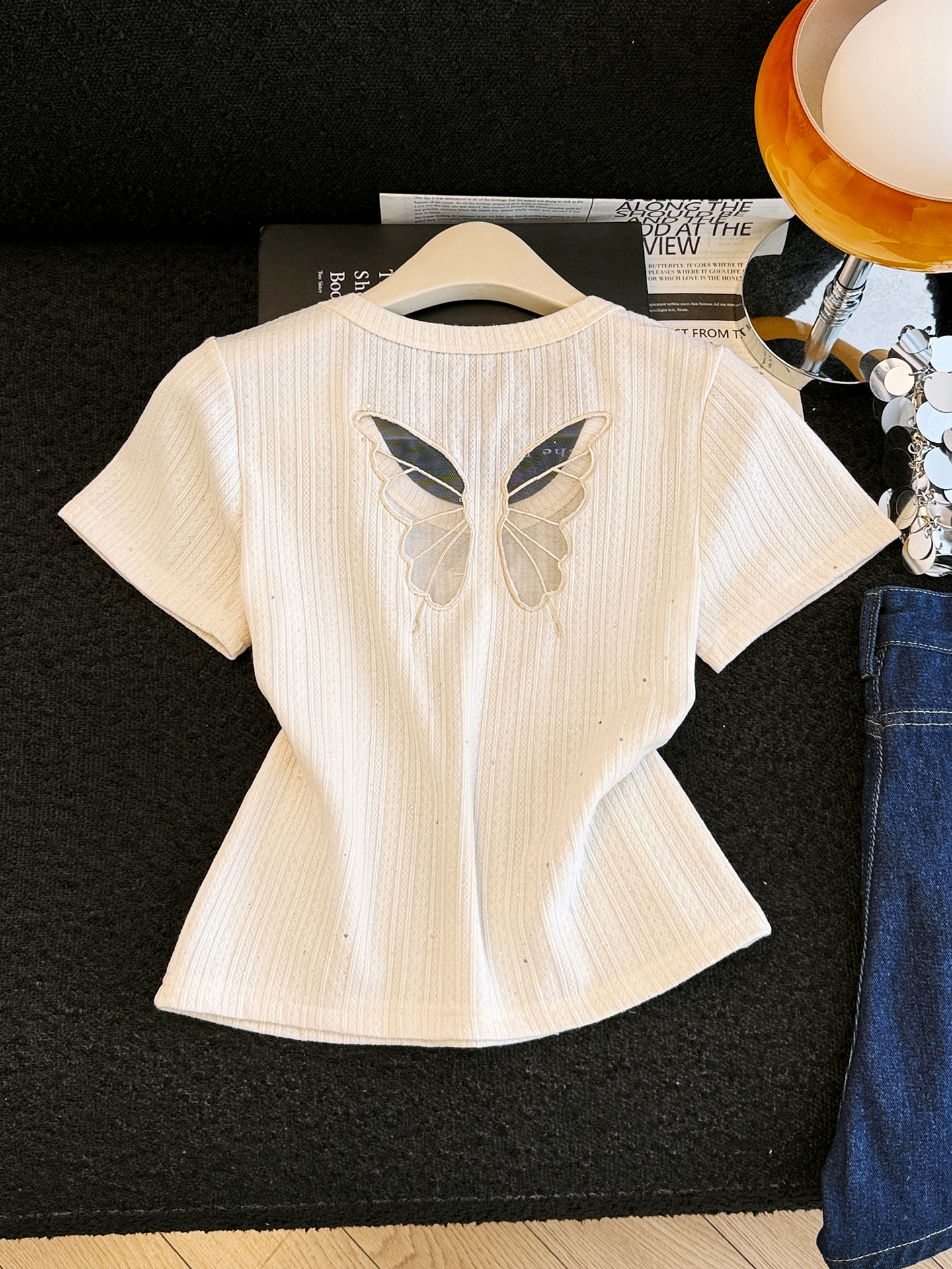 BY18726# 杏色圆领短袖T恤女夏新款镂空蝴蝶设计感显瘦体恤正肩短上衣 服裝批發女裝批發服飾貨源