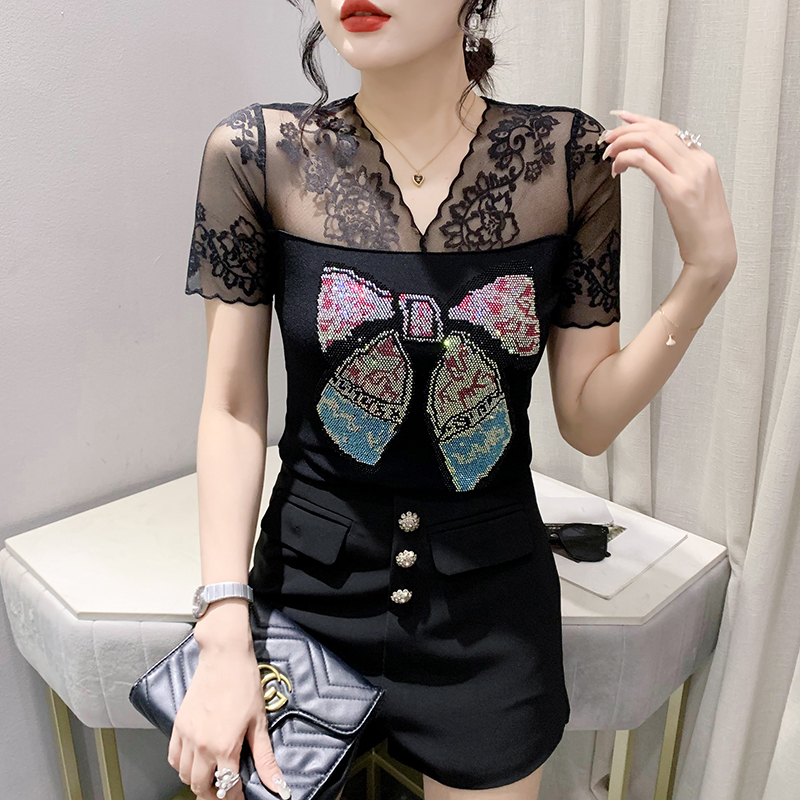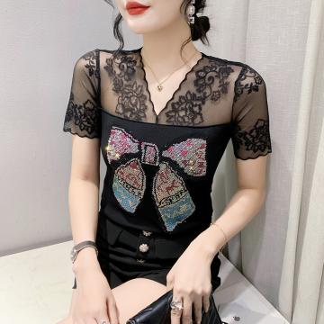 BY18747# 性感透视蕾丝镶钻双层冰丝网纱短袖气质女上衣百搭潮款 服裝批發女裝批發服飾貨源