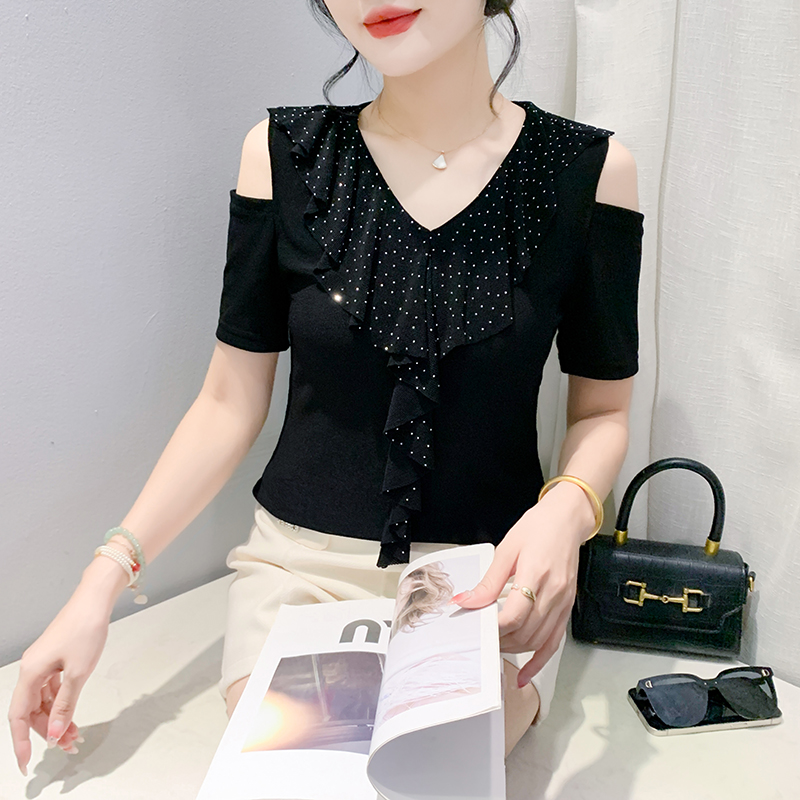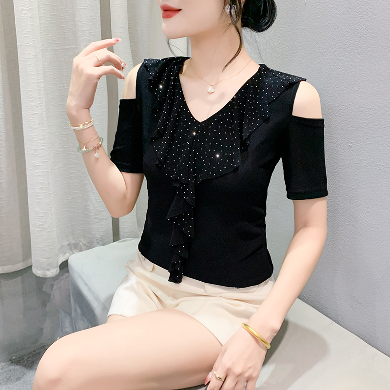 BY18749# 夏季韩版新款漏肩荷叶边镶钻设计感百搭女短袖上衣小衫 服裝批發女裝批發服飾貨源