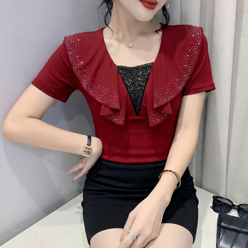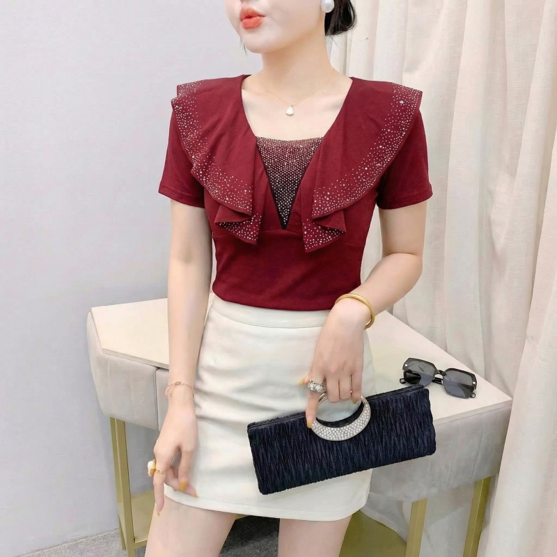 BY18750# 时尚设计感镶钻V领短袖T恤女夏季新款气质修身显瘦百搭上衣 服裝批發女裝批發服飾貨源