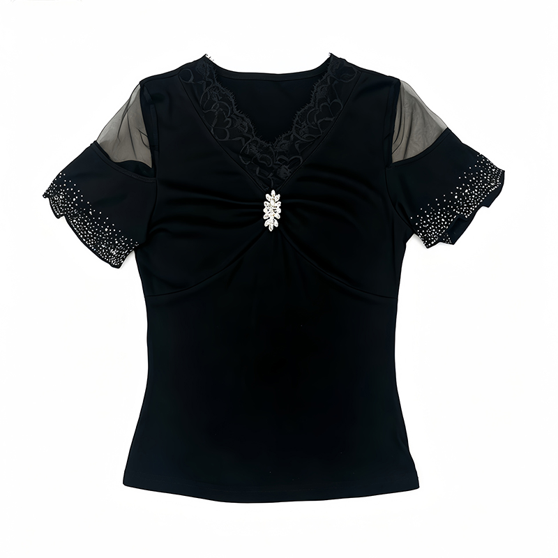 BY18752# 夏季女装新品性感V领蕾丝拼接镶钻显瘦短袖T恤上衣 服裝批發女裝批發服飾貨源