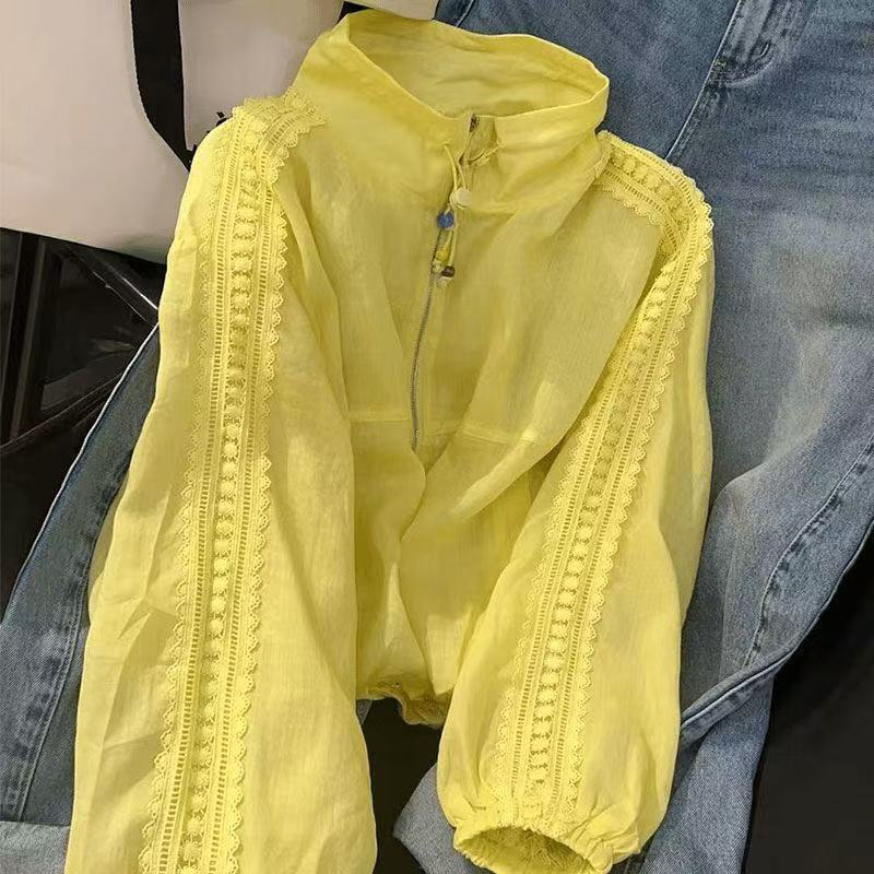BY18783# 欧货拼接蕾丝新款长袖立领防晒宽松衣女外套休闲春夏百搭上衣 服裝批發女裝批發服飾貨源
