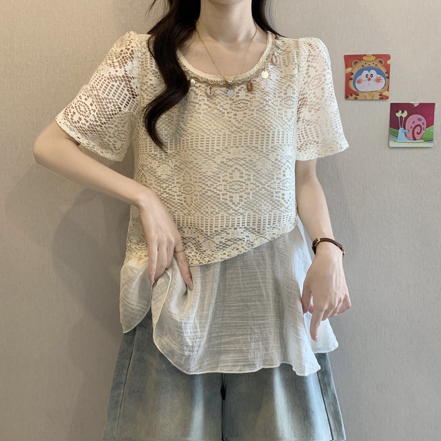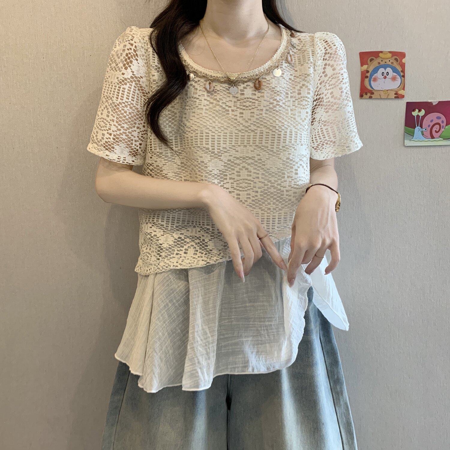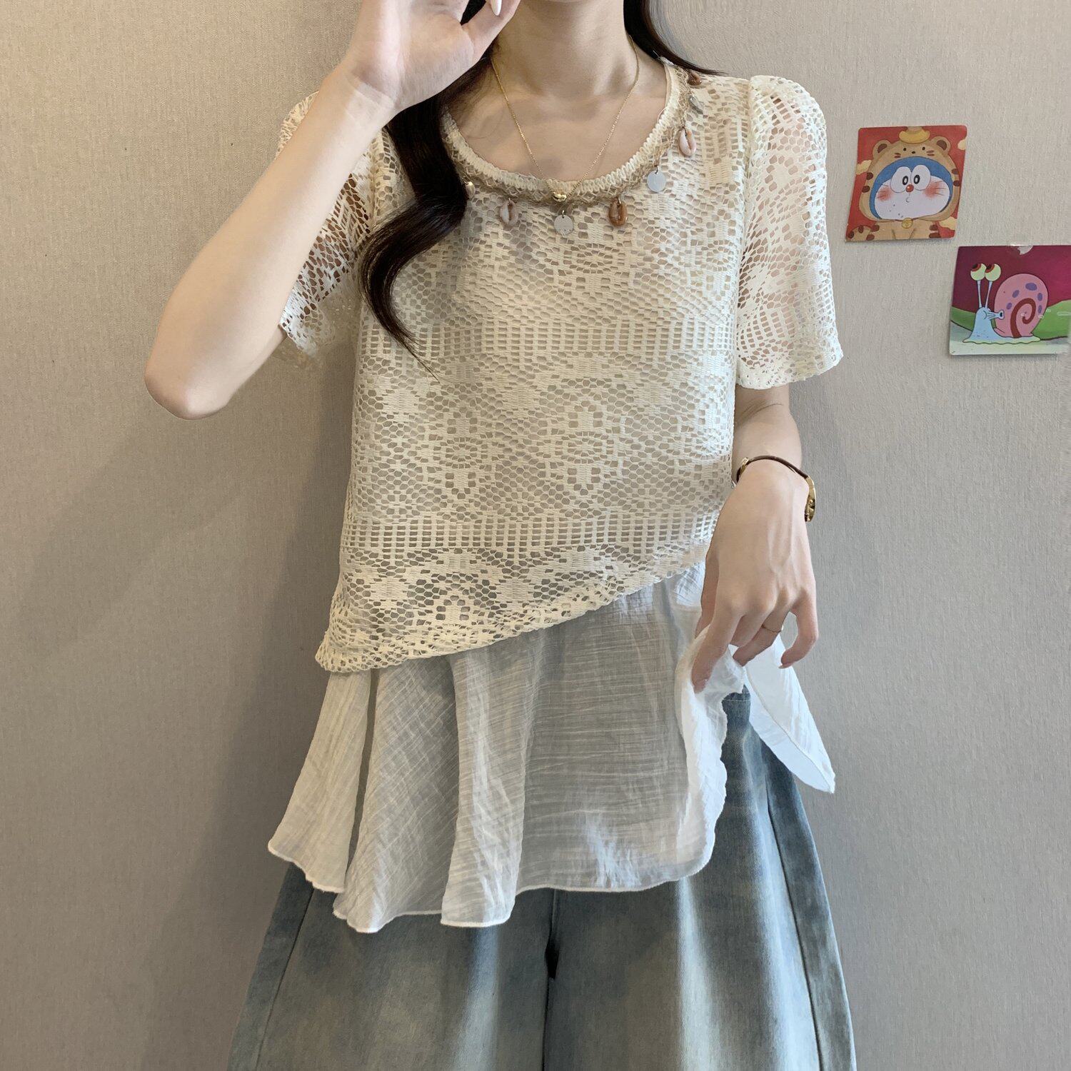 BY18852# 波嬉系钩花镂空短袖蕾丝衫上衣女夏季假两件遮肚衬衫 服裝批發女裝批發服飾貨源