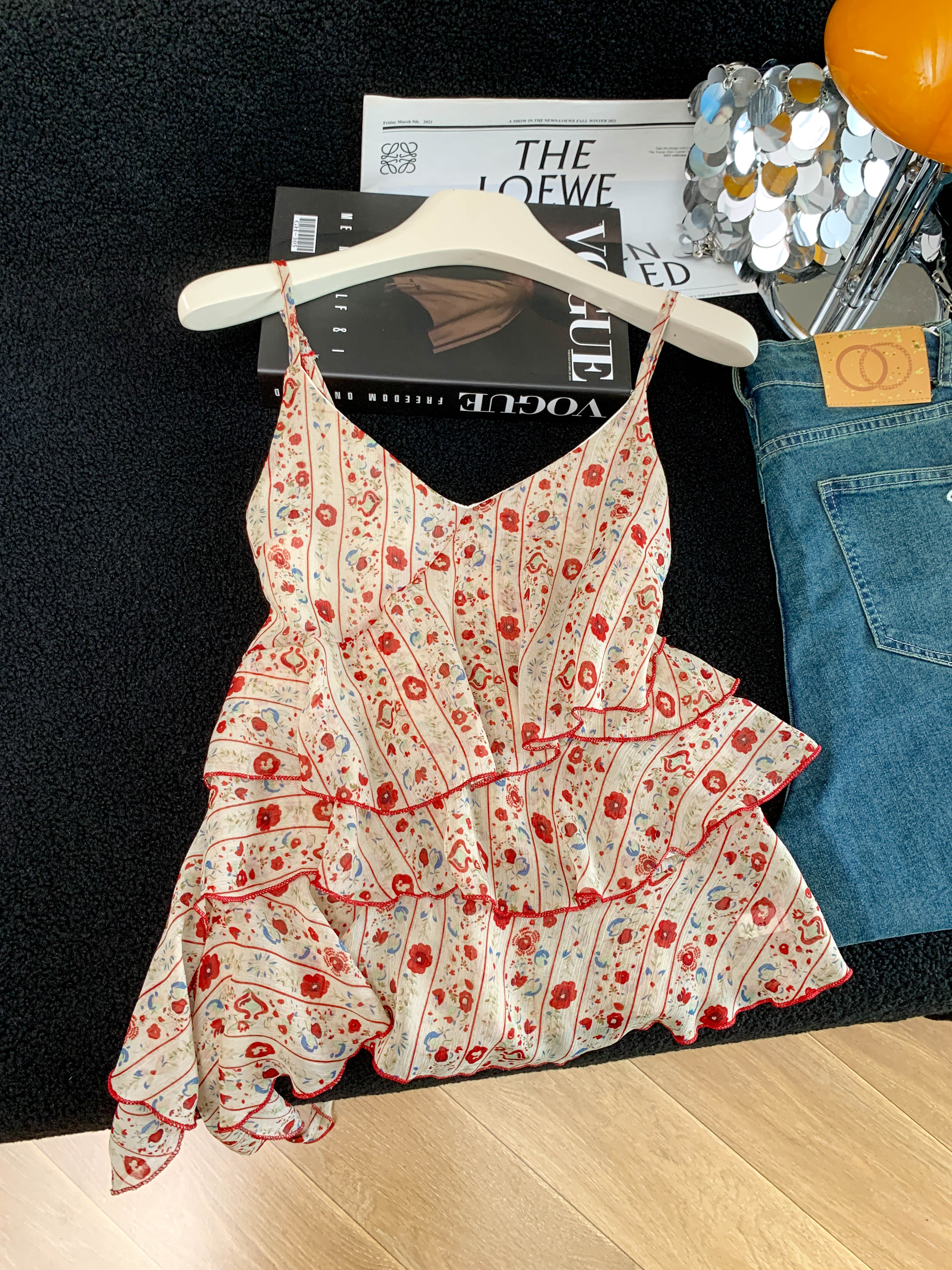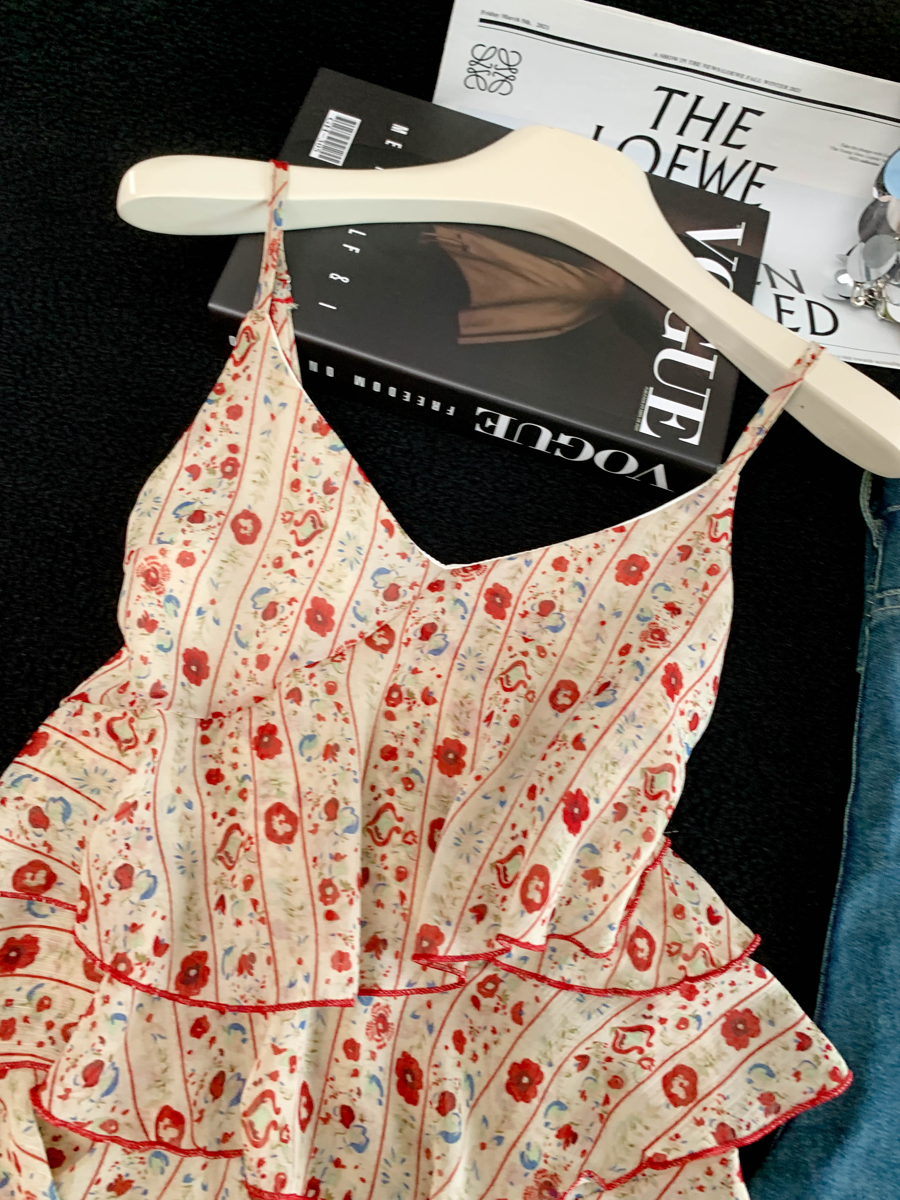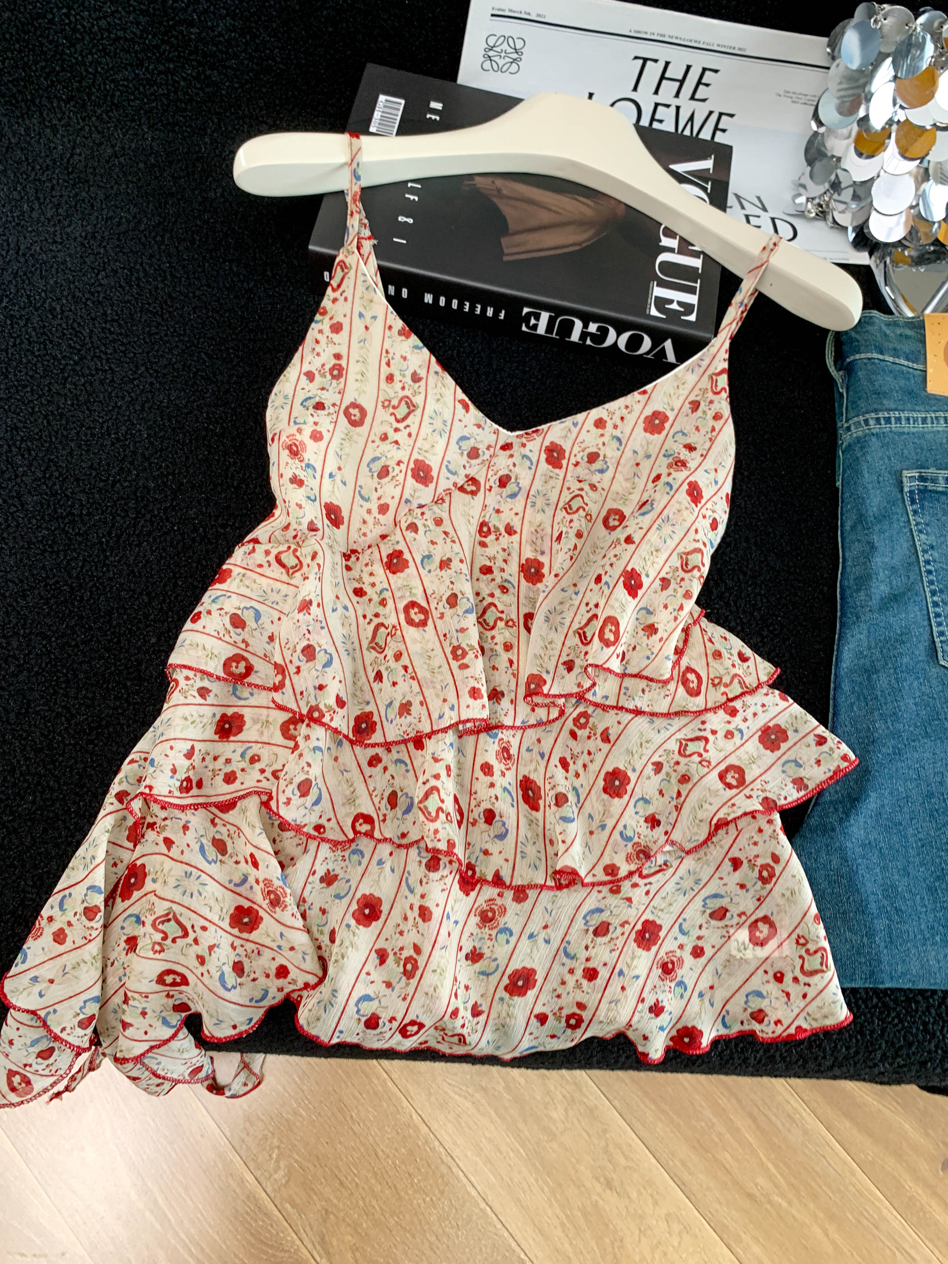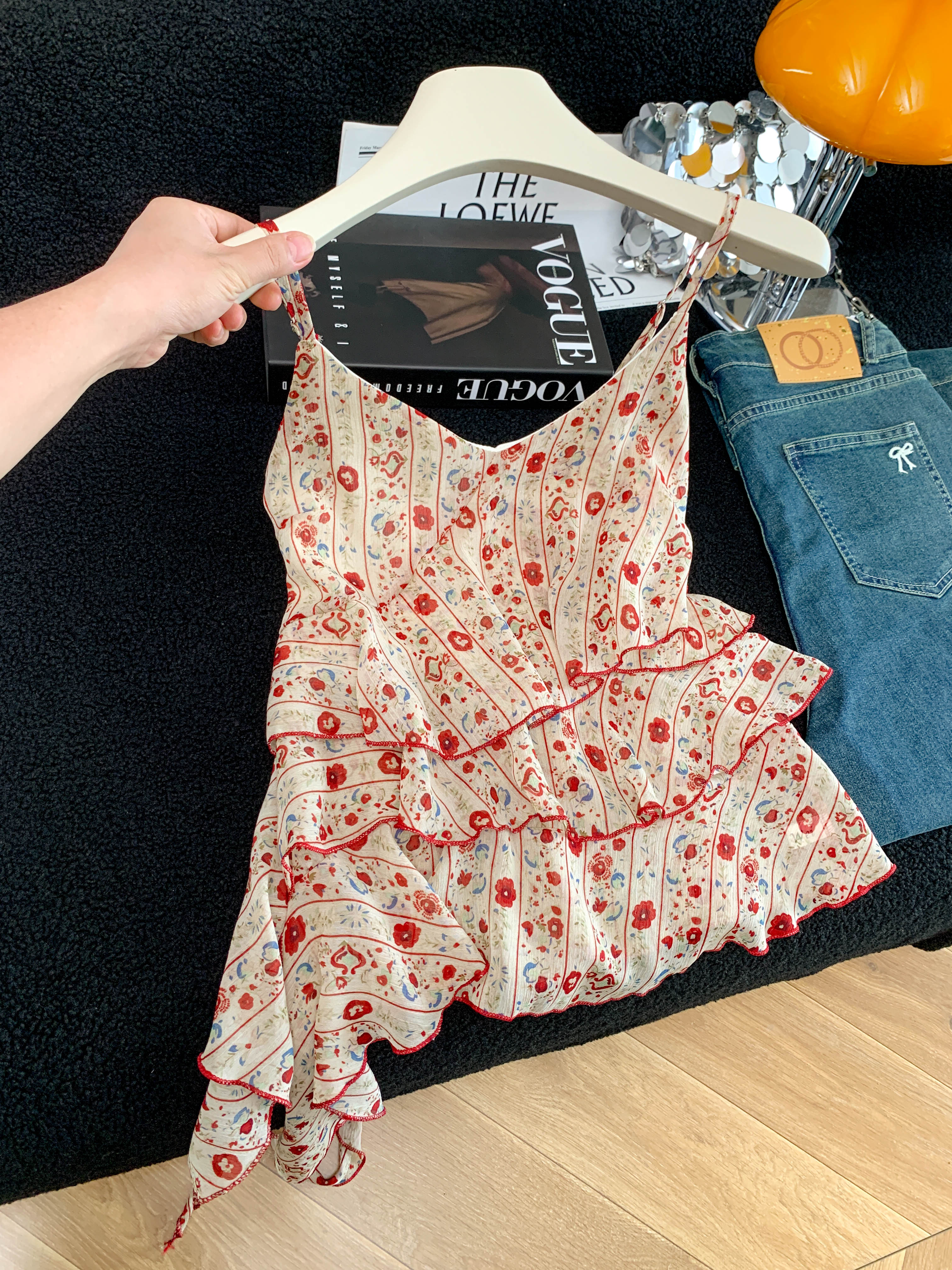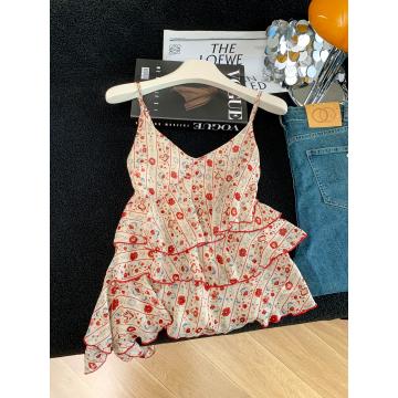 BY18919# 夏季新款温柔风荷叶边不规则法式碎花吊带上衣女 服裝批發女裝批發服飾貨源