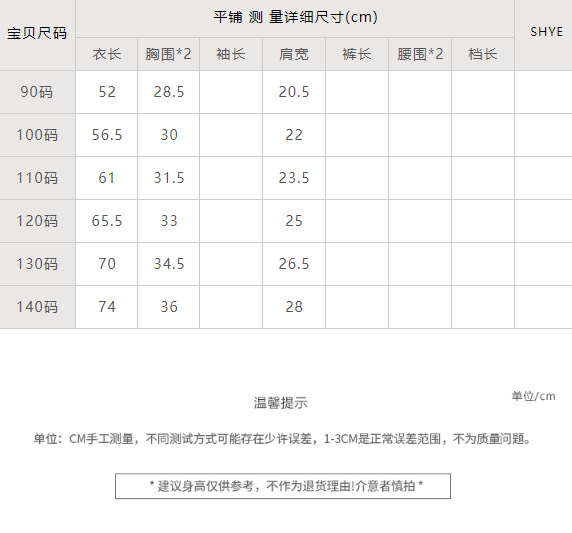 - 适合身高:90(建议身高80-85cm),100(建议身高85-95cm),110(建议身高95-105cm),120(建议身高105-115cm),130(建议身高115-125cm),140(建议身高125-135cm)