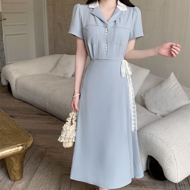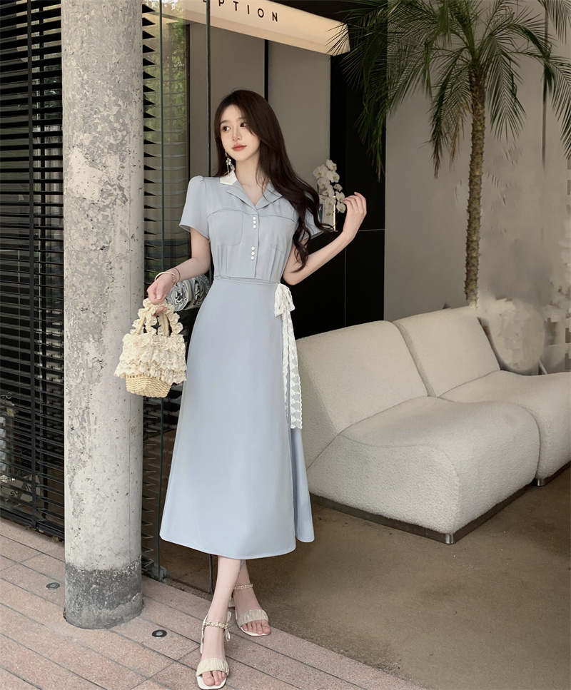 FA26131# 大码夏季新款通勤气质连衣裙女高腰显瘦蓝色长裙子 服裝批發女裝批發服飾貨源