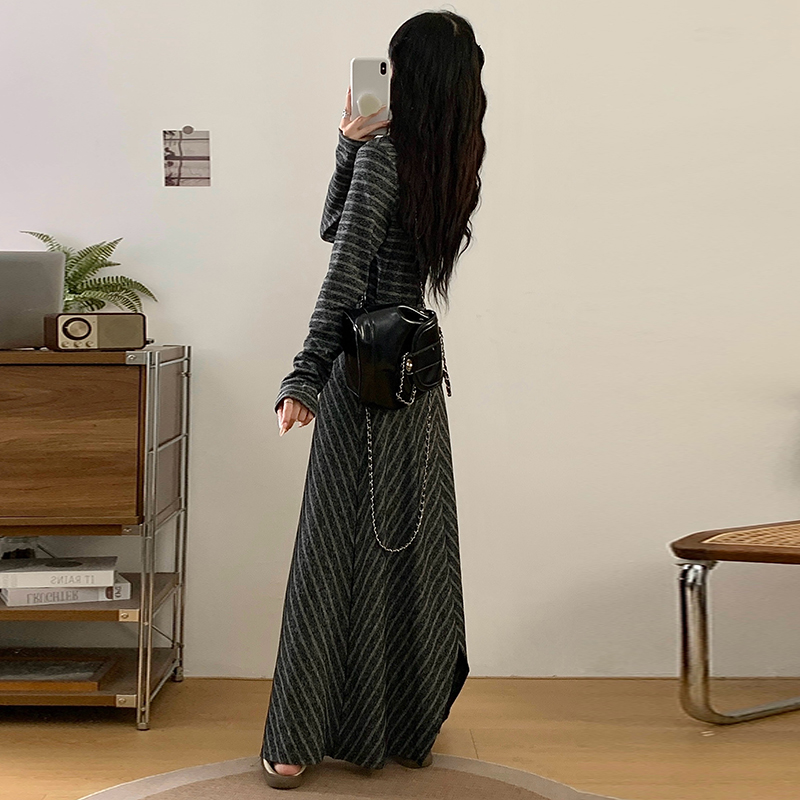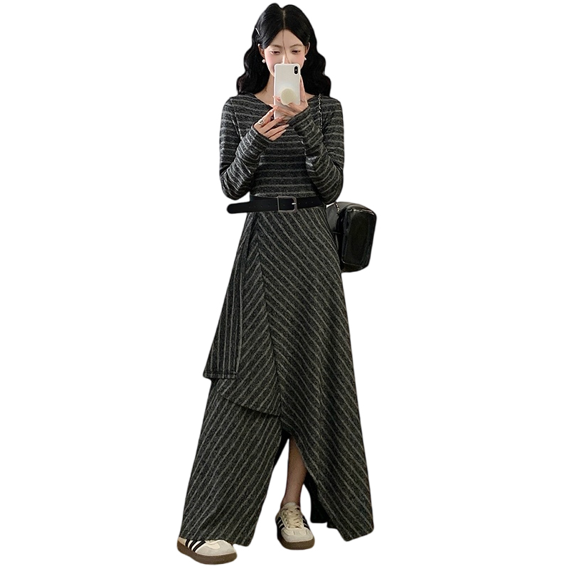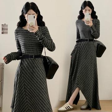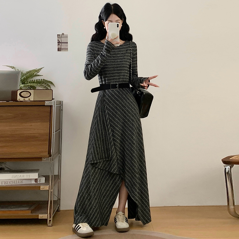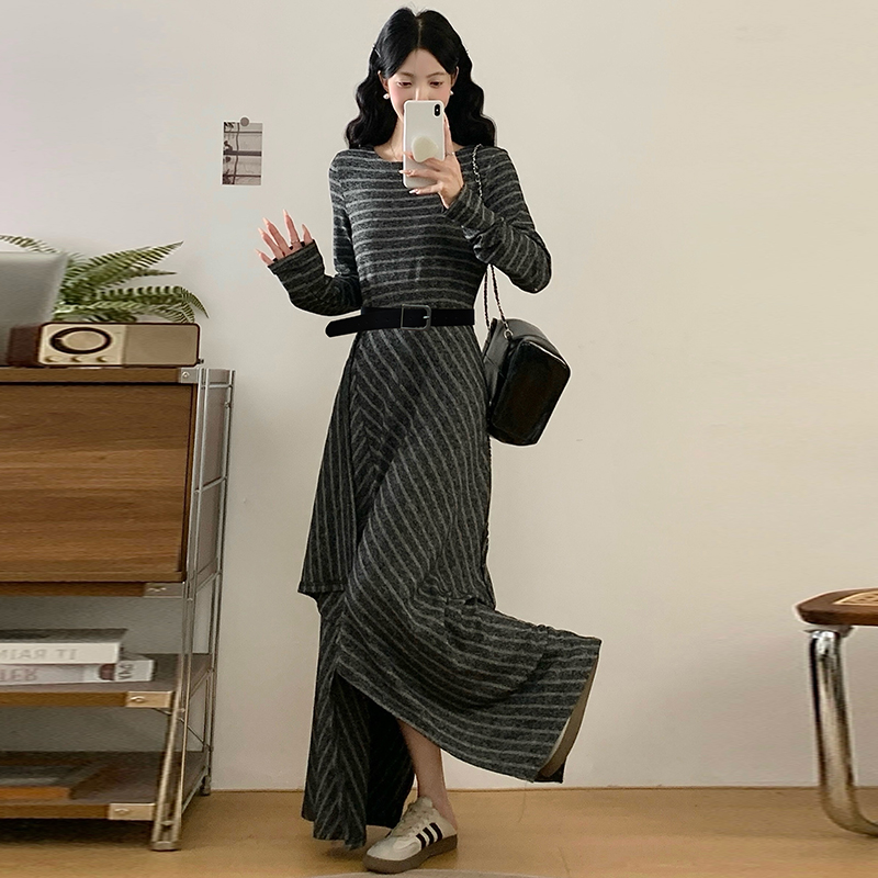 FA41993# 大码女装秋季新款胖mm韩版条纹减龄不规则下摆长款连衣裙 服裝批發女裝批發服飾貨源