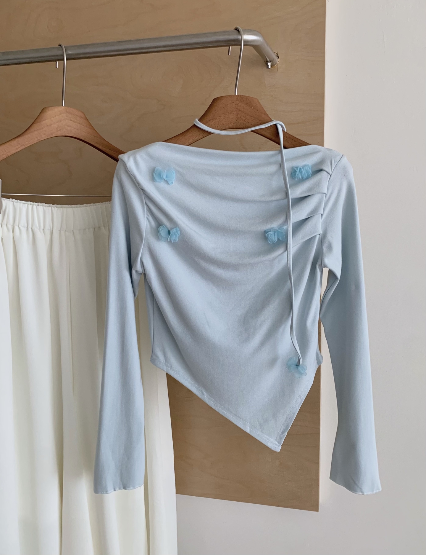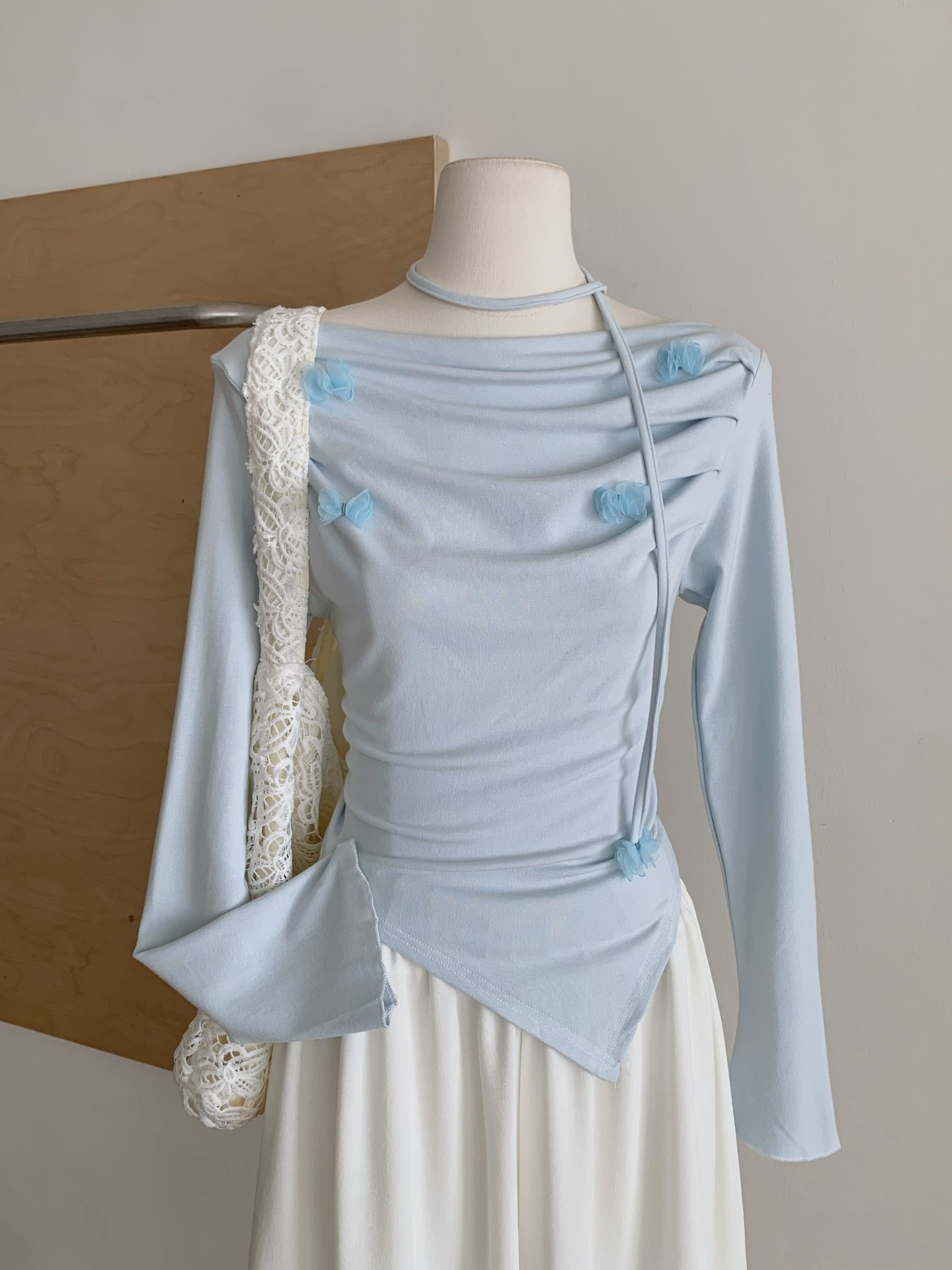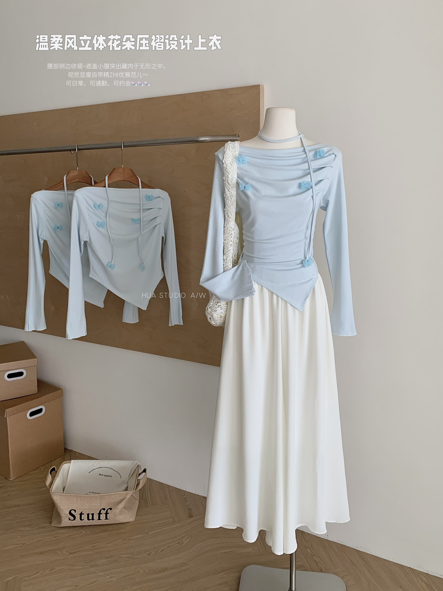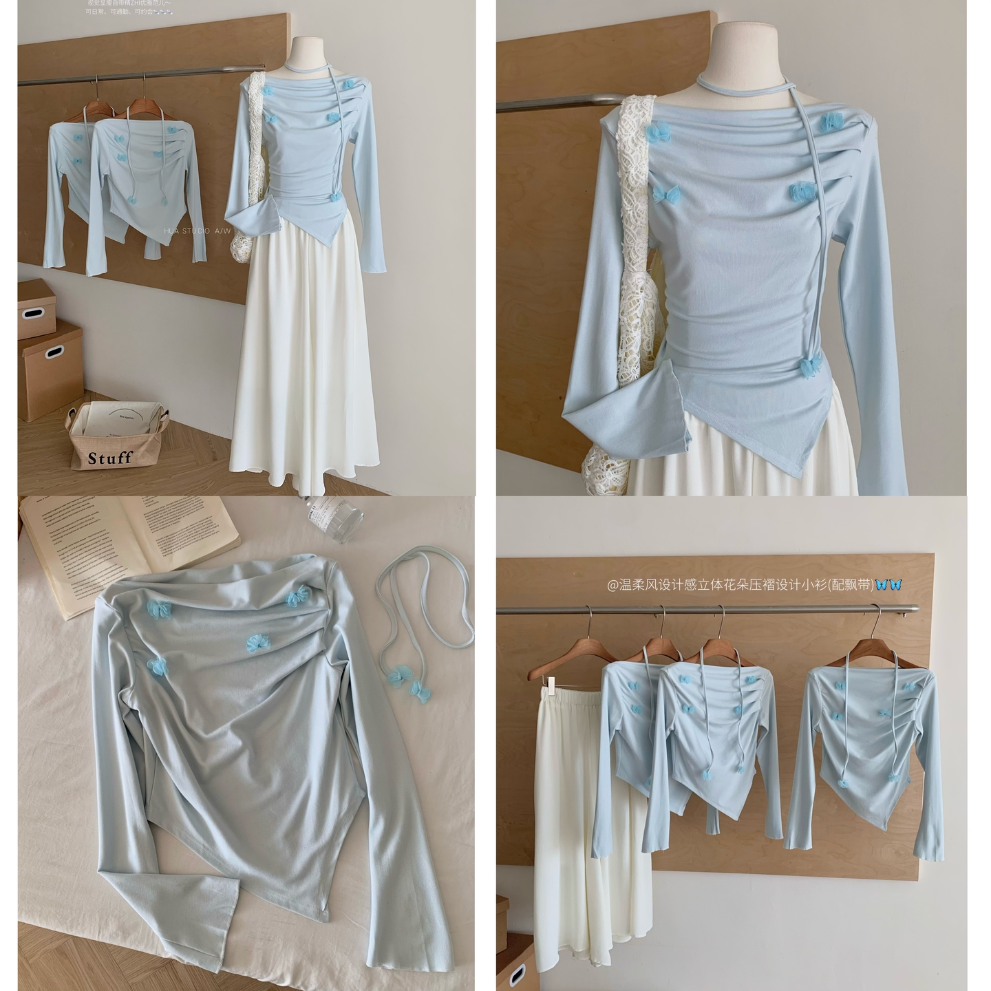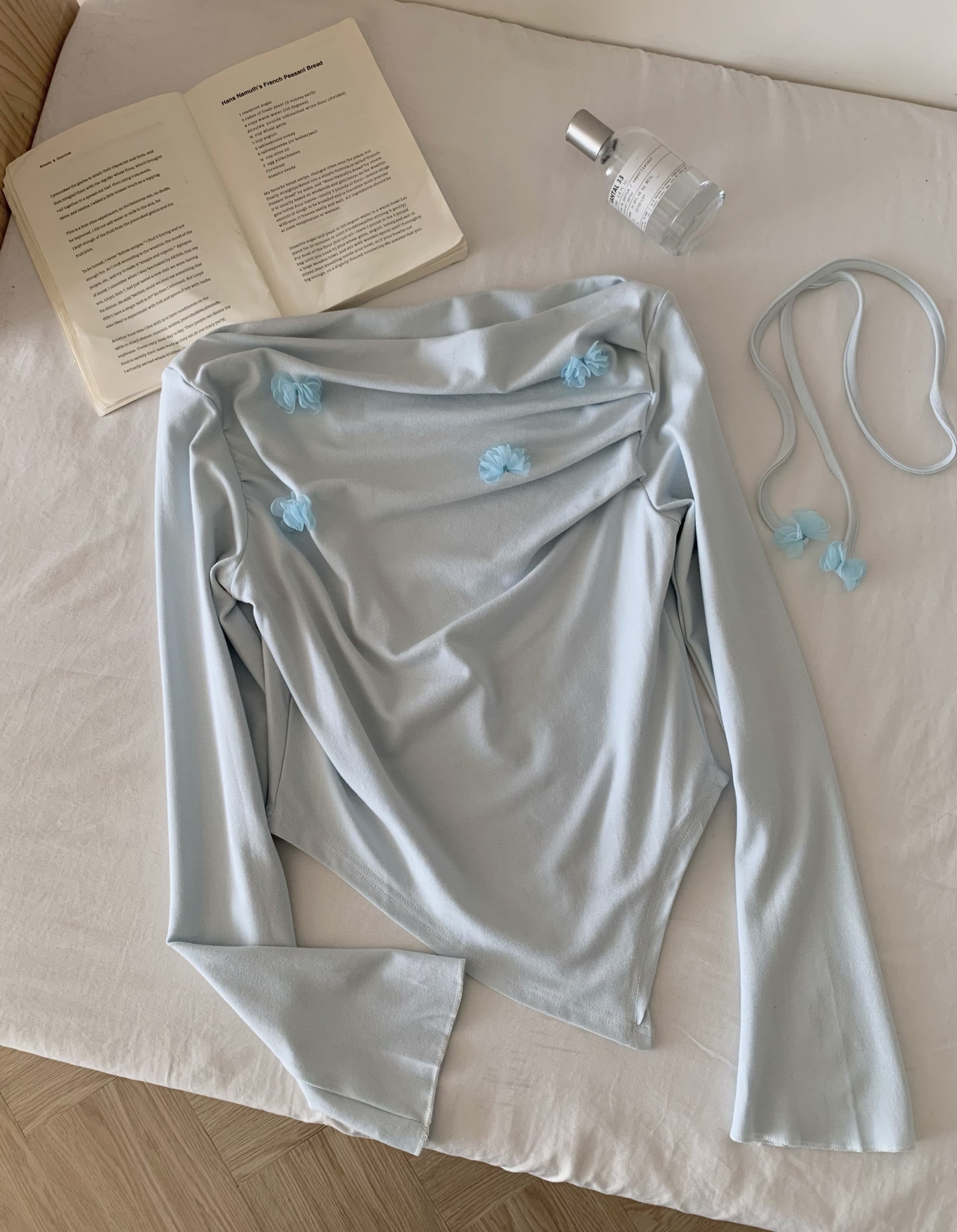 FA42013# 韩系打褶斜领露肩立体花朵T恤女秋季新款显瘦性感个性小众上衣 服裝批發女裝批發服飾貨源