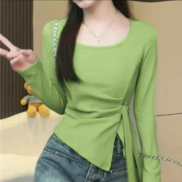 FA42018# 设计感收腰褶皱长袖上衣夏装时尚减龄修身打底衫 服裝批發女裝批發服飾貨源