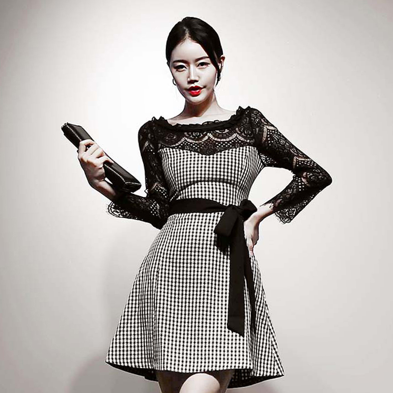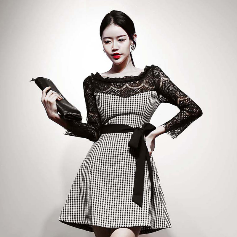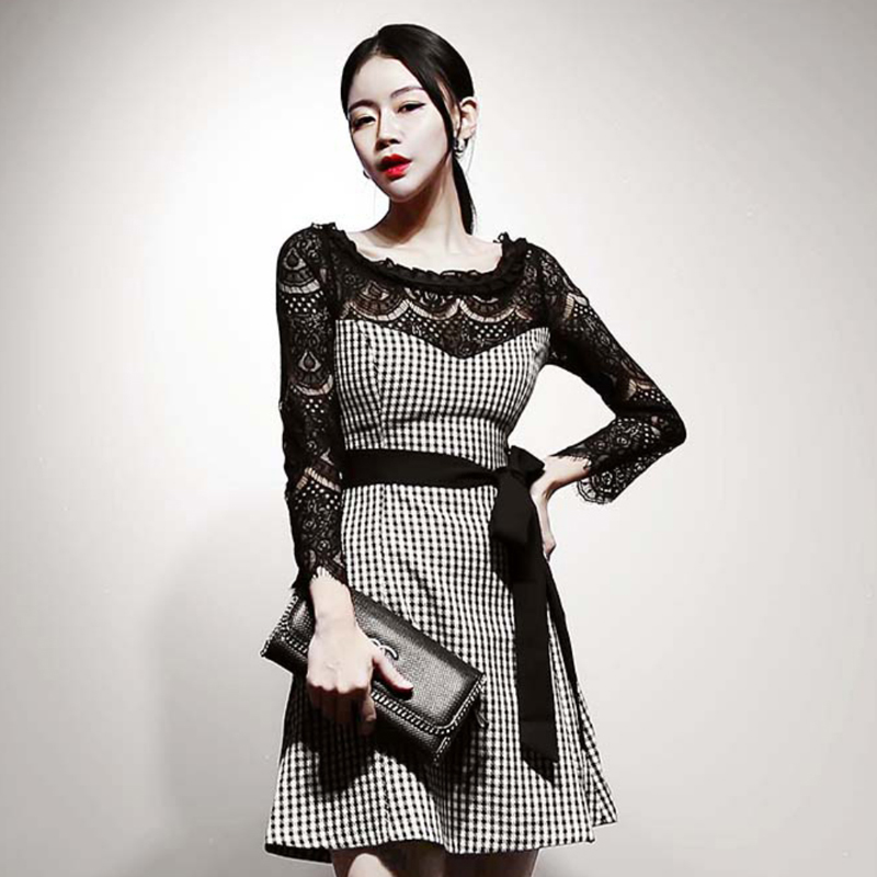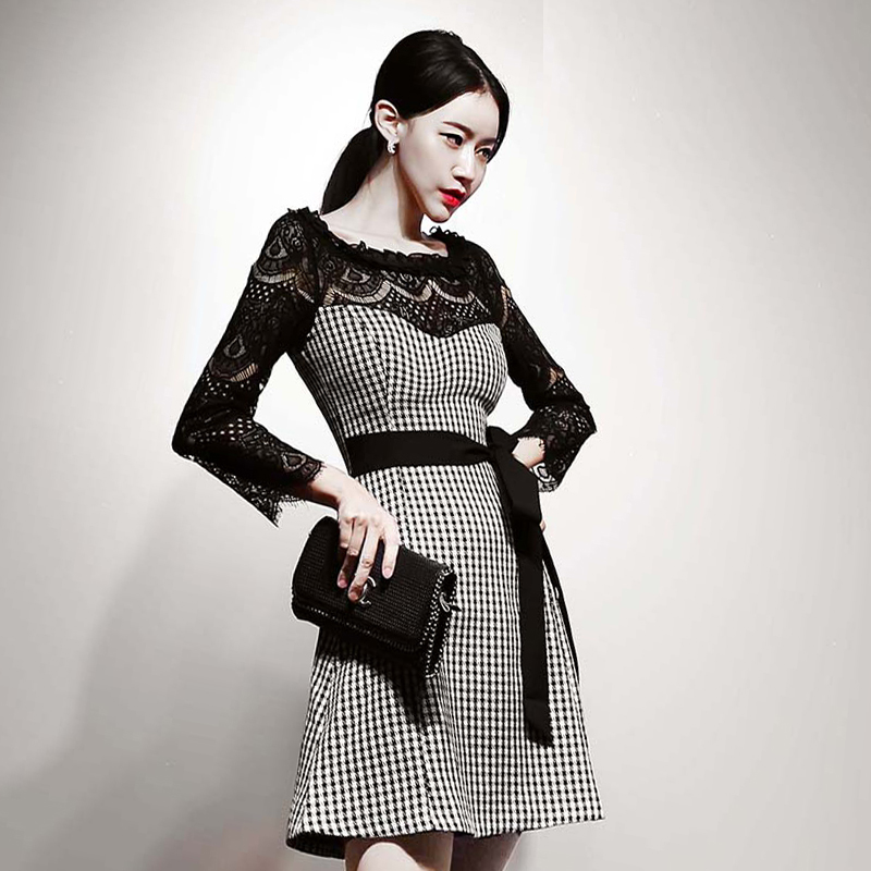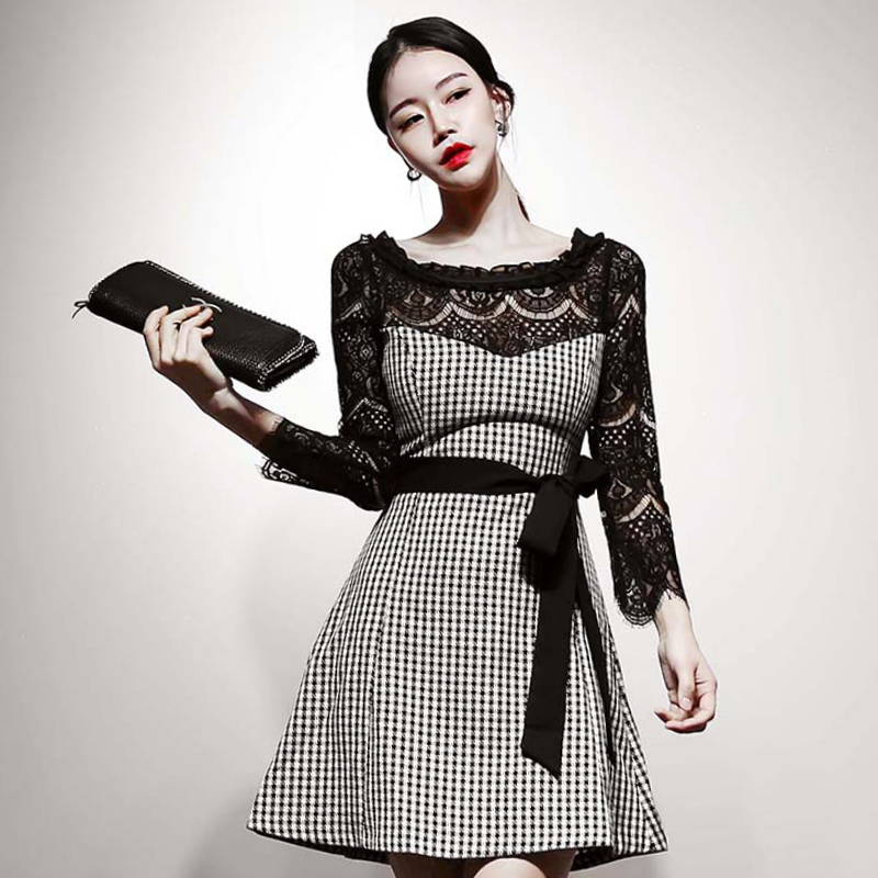 FA42035# 复古优雅风蕾丝拼接千鸟格连衣裙收腰系带显瘦气质名媛小黑裙 服裝批發女裝批發服飾貨源