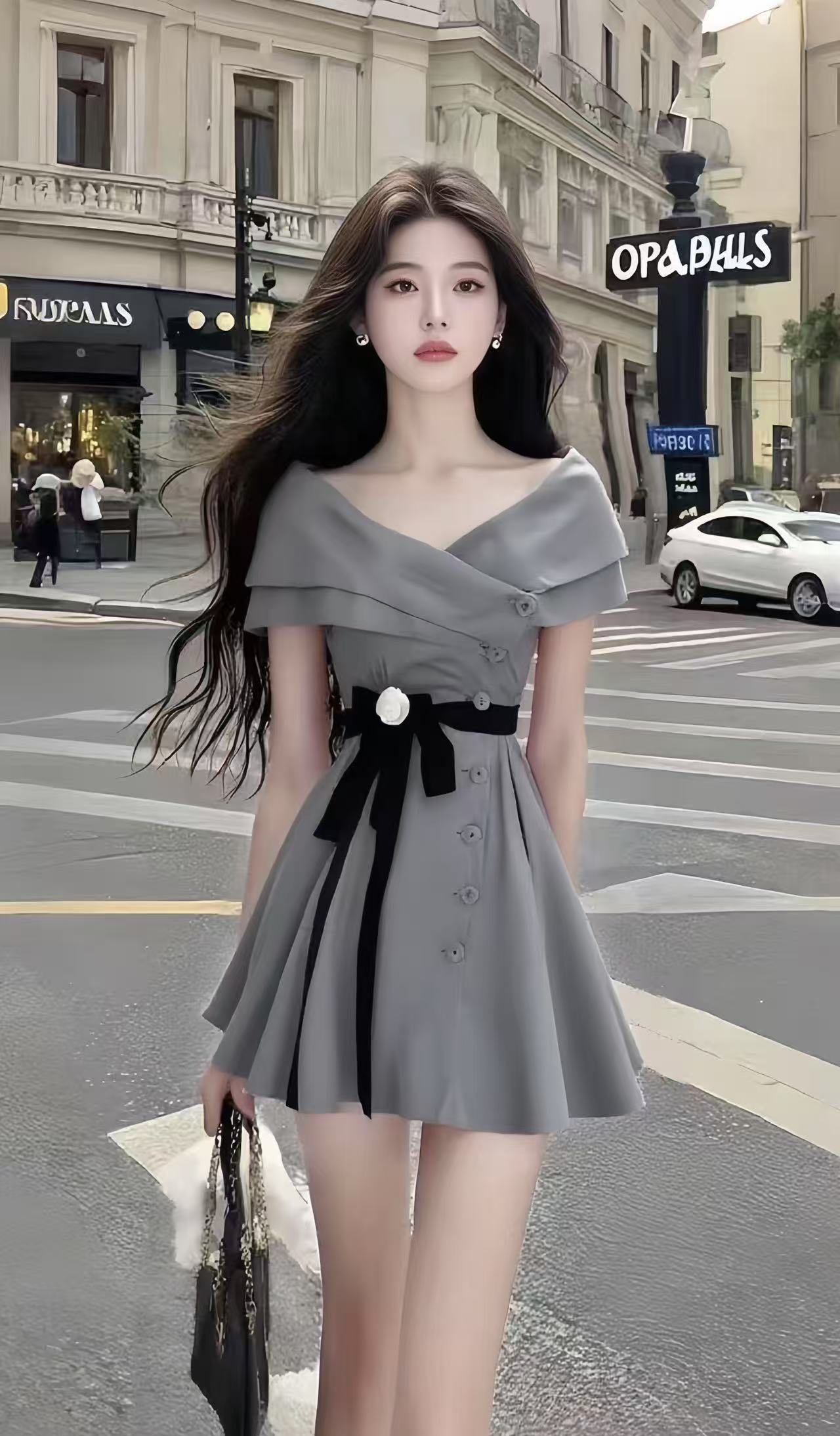 FA42391# 轻奢时尚高端大气温柔风灰色低领短袖修身收腰设计感系带连衣裙女 服裝批發女裝批發服飾貨源