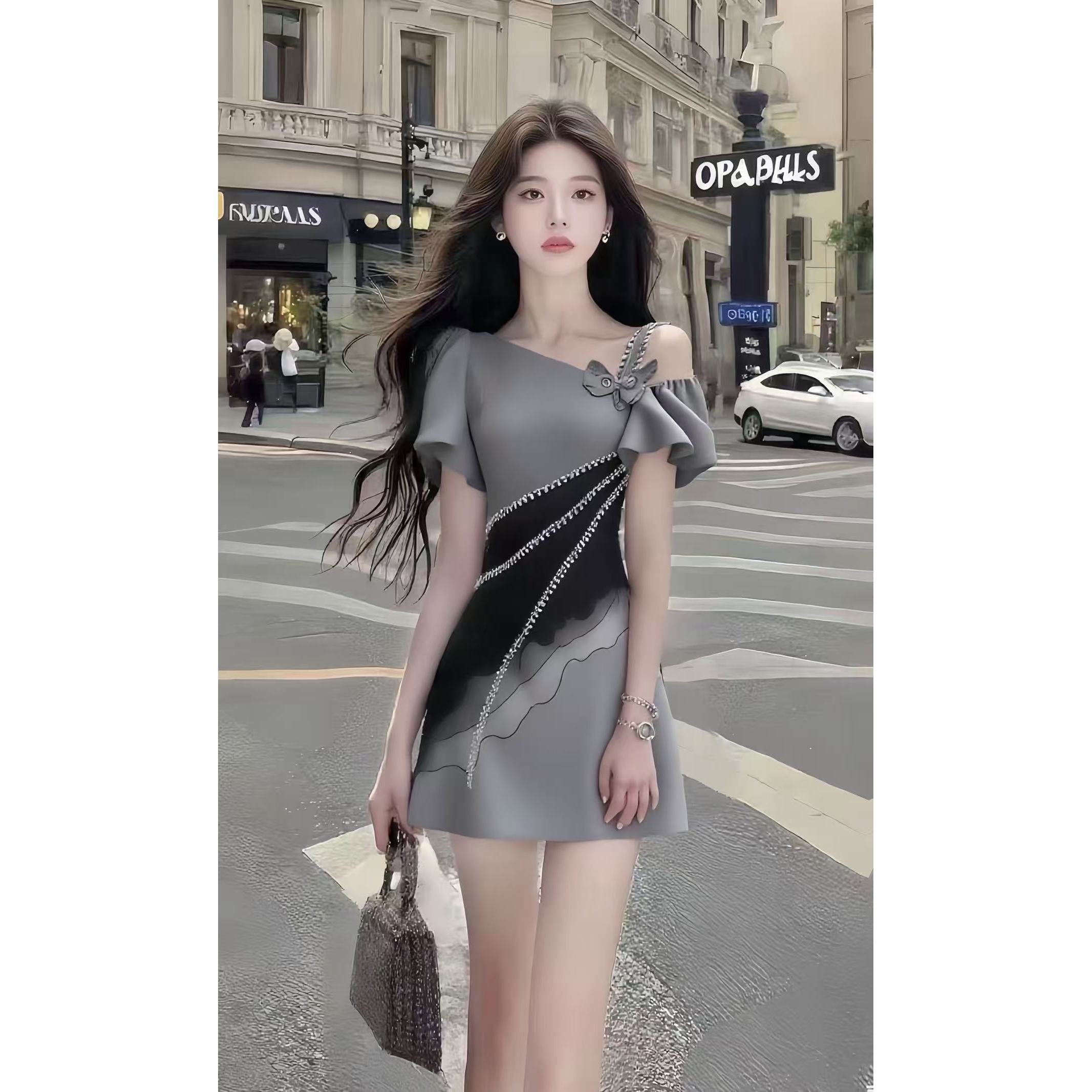FA42395# 法式温柔甜美风时尚高端大气氛围感灰色斜领短袖收腰拼接连衣裙女 服裝批發女裝批發服飾貨源