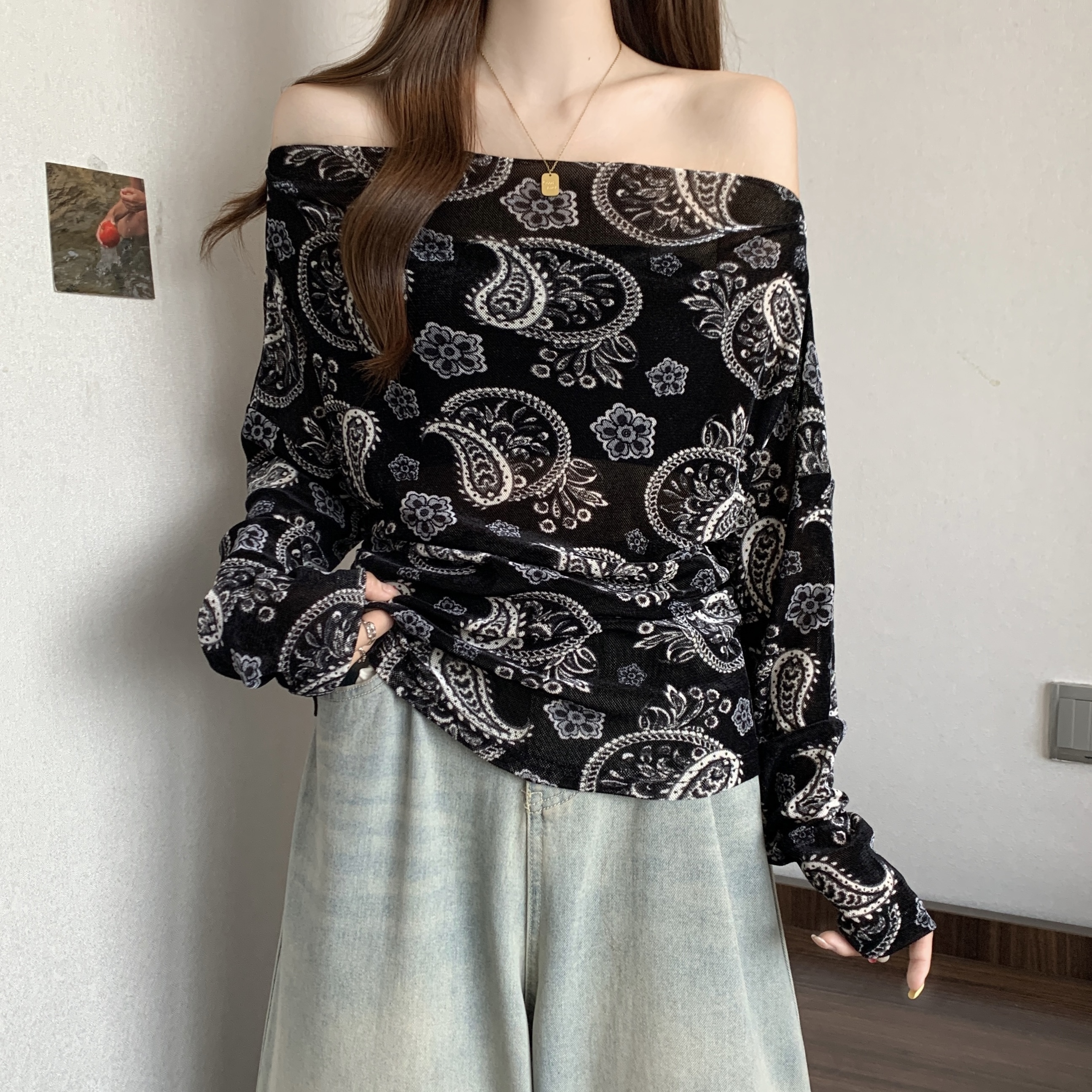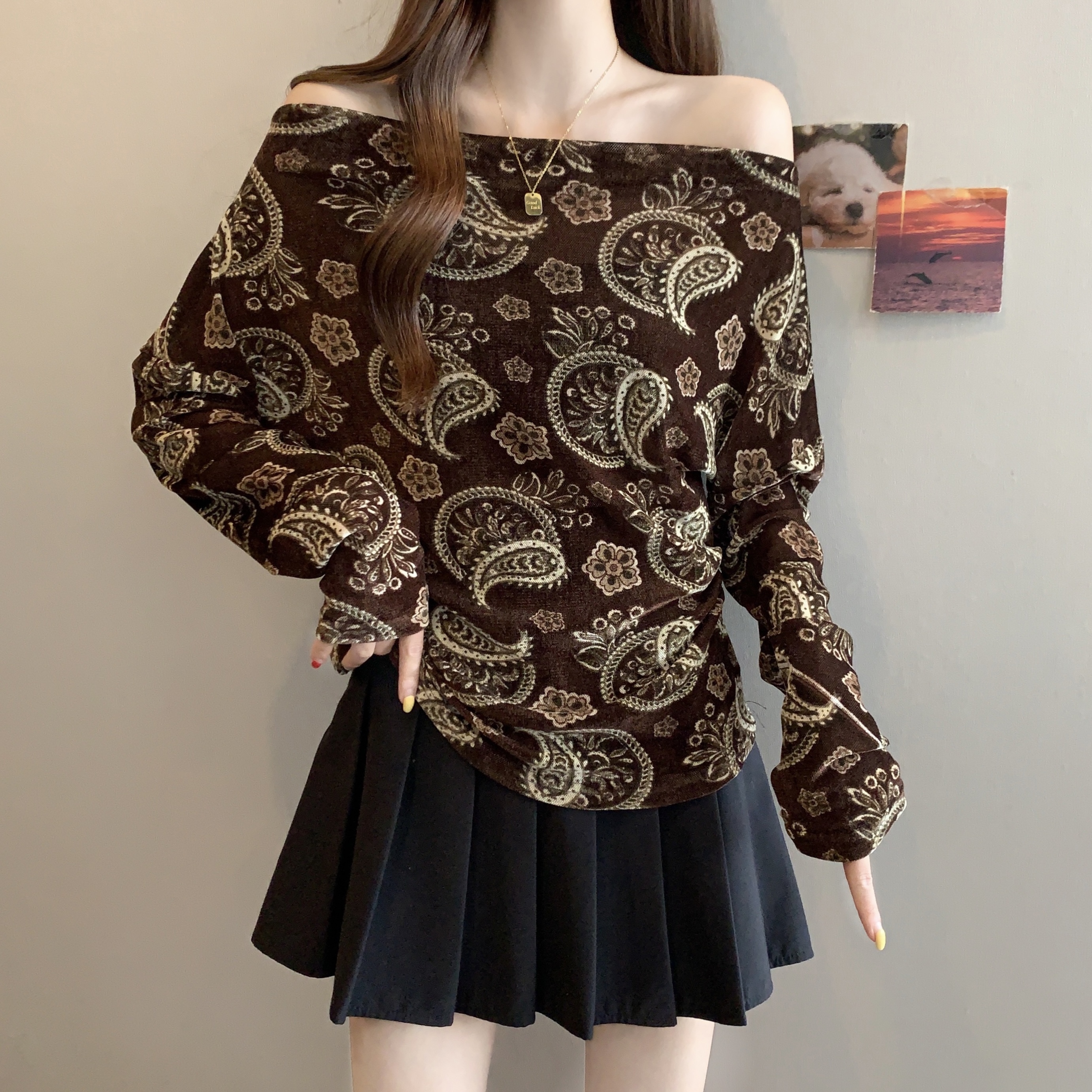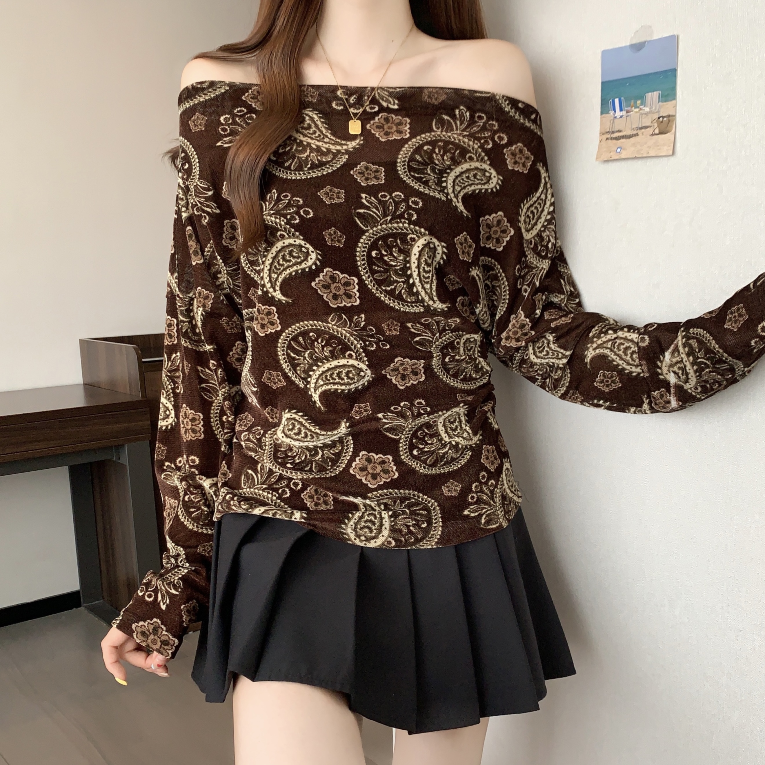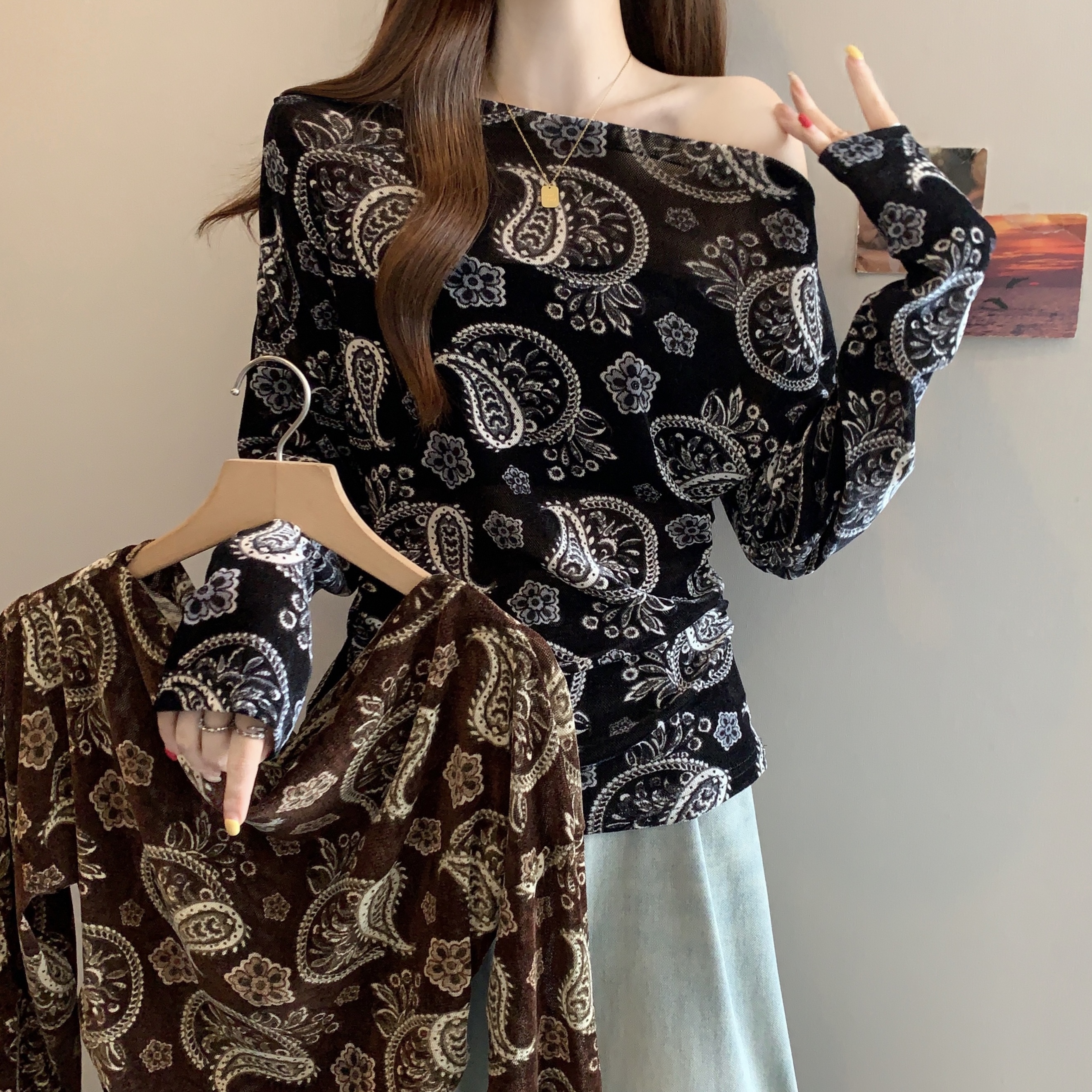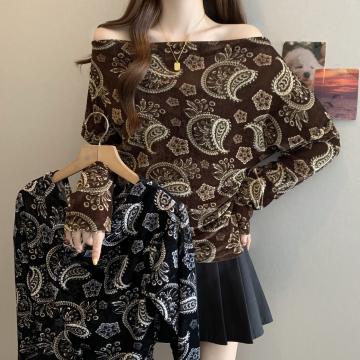 FA42522# 大码MM秋新款优雅腰果花斜肩长袖小衫女上衣衬衫 服裝批發女裝批發服飾貨源