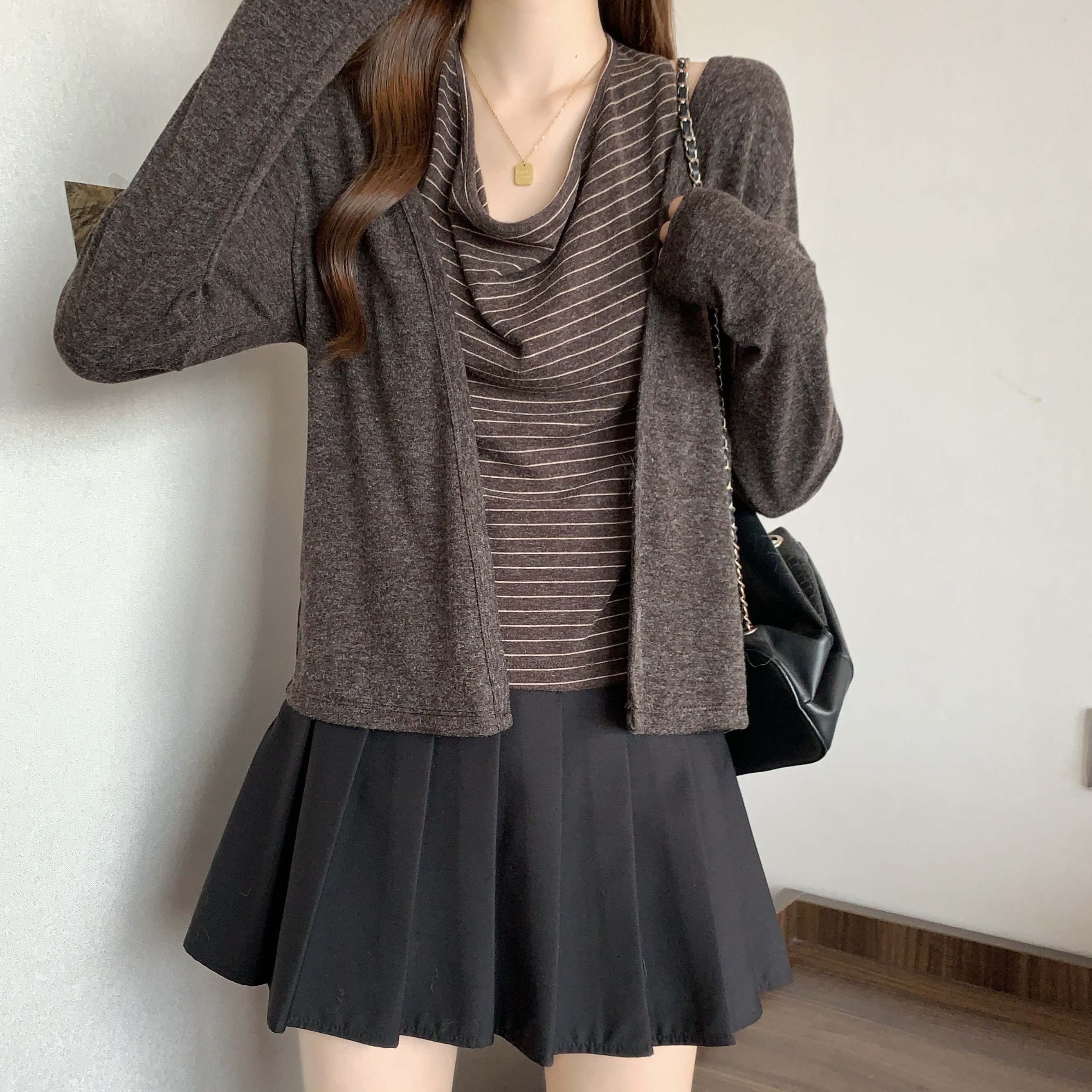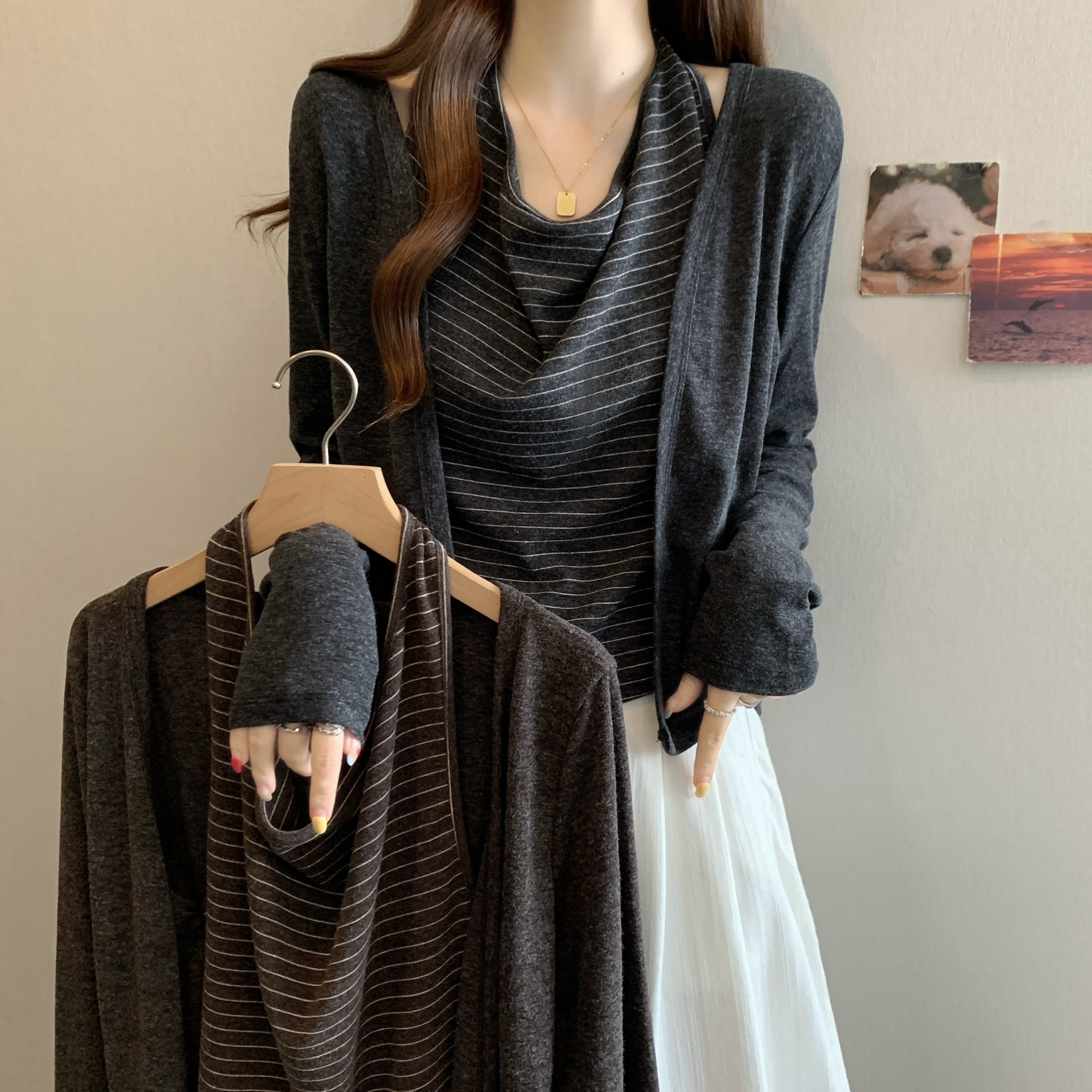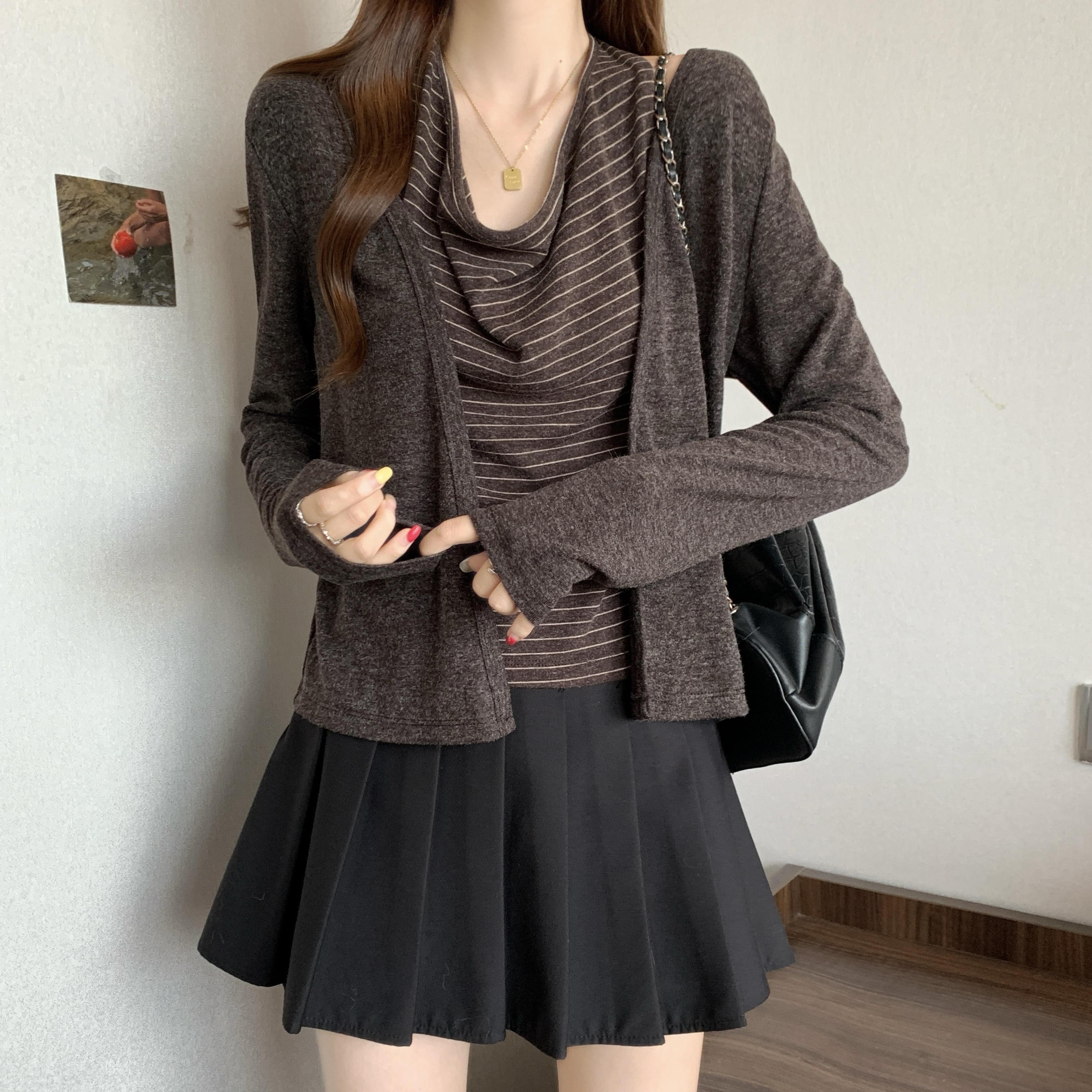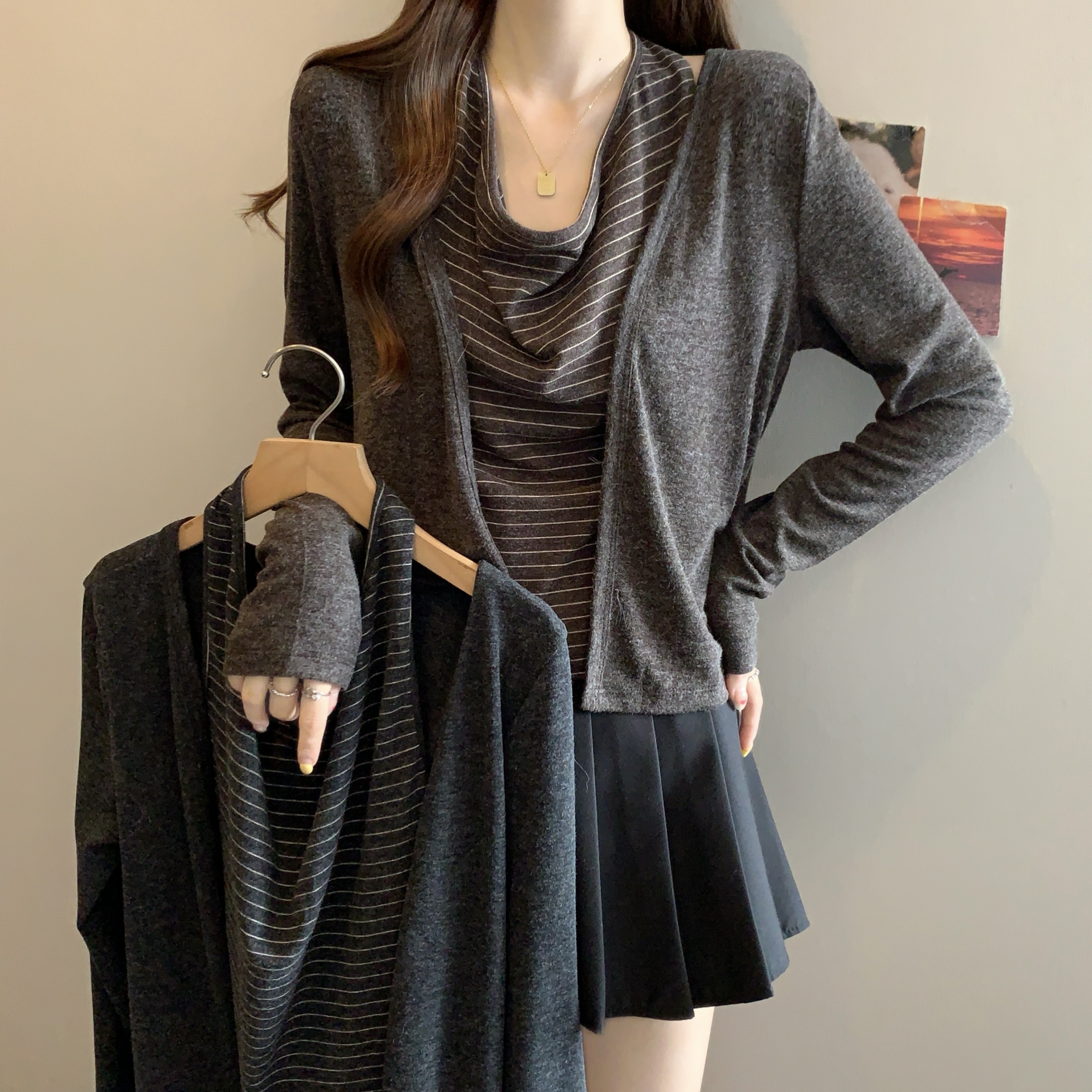 FA42523# 大码MM挂脖条纹拼接假两件显瘦长袖小衫设计感上衣女 服裝批發女裝批發服飾貨源