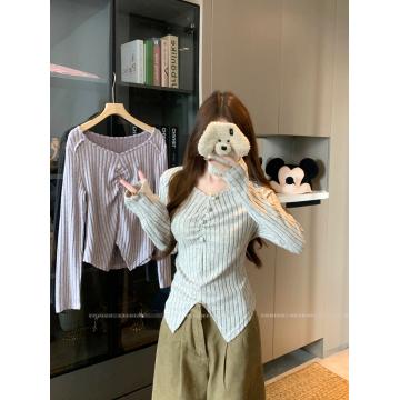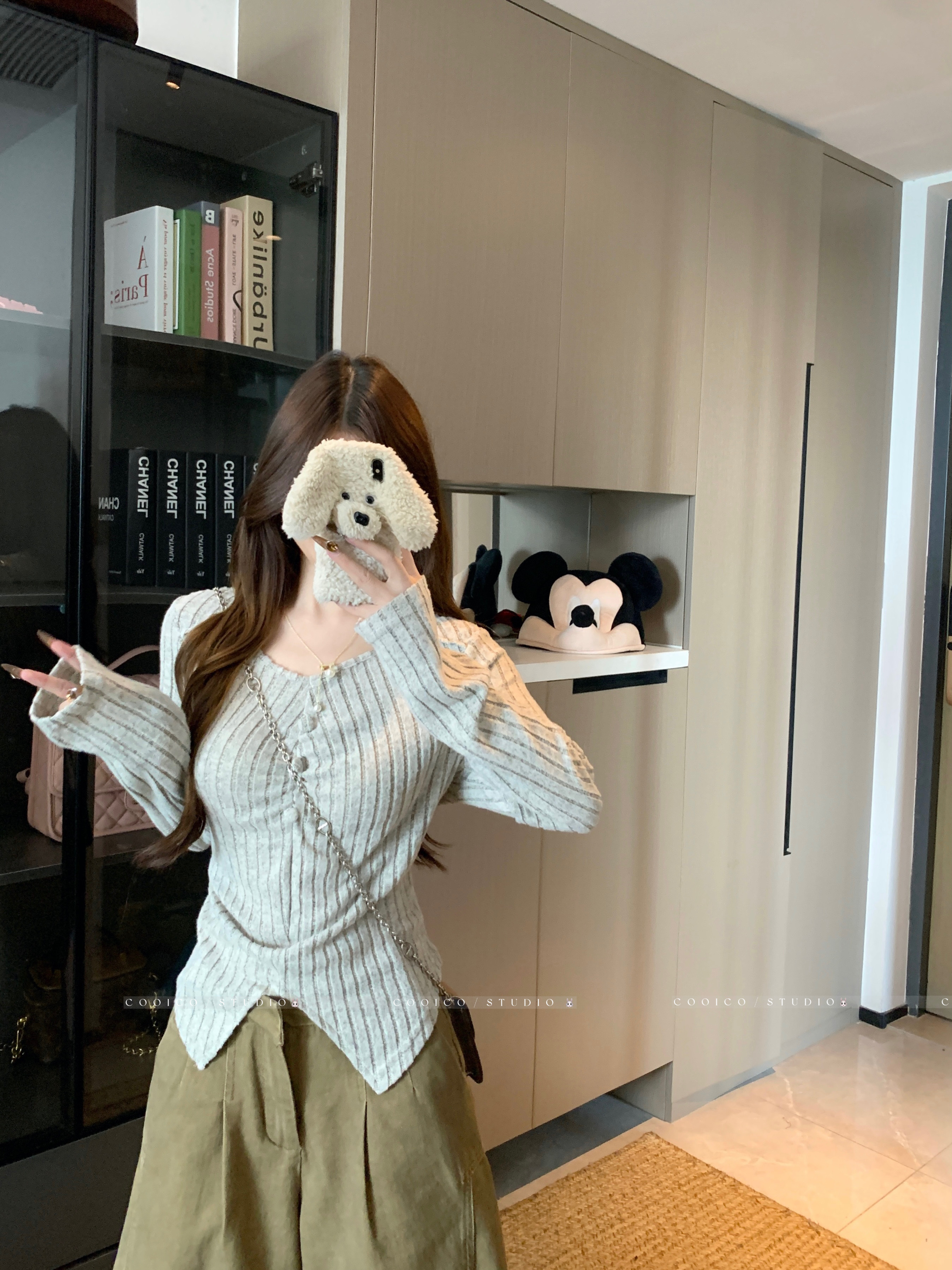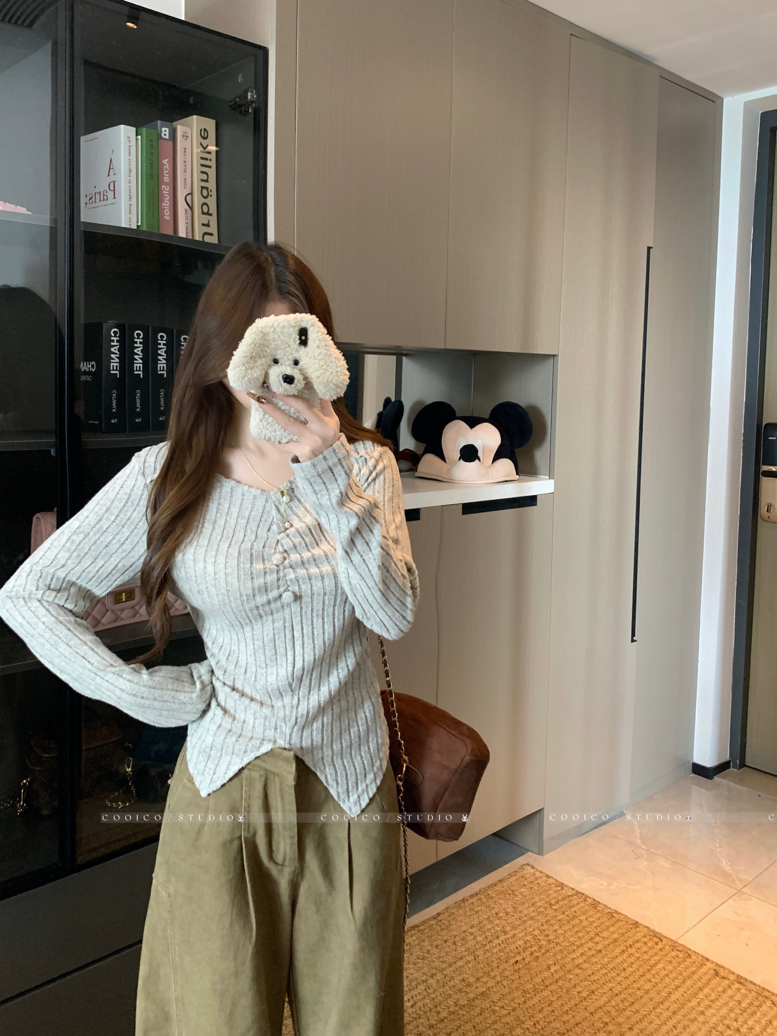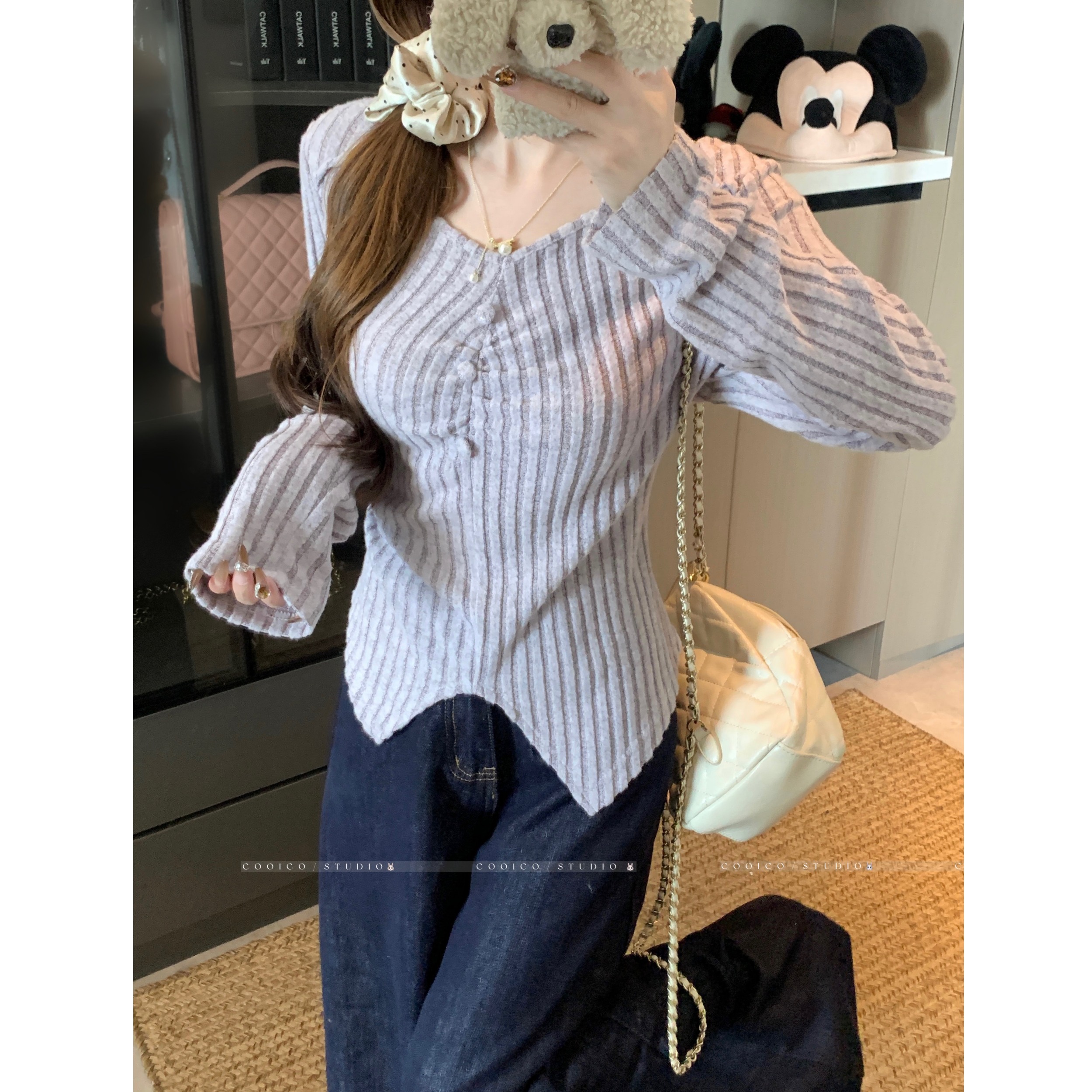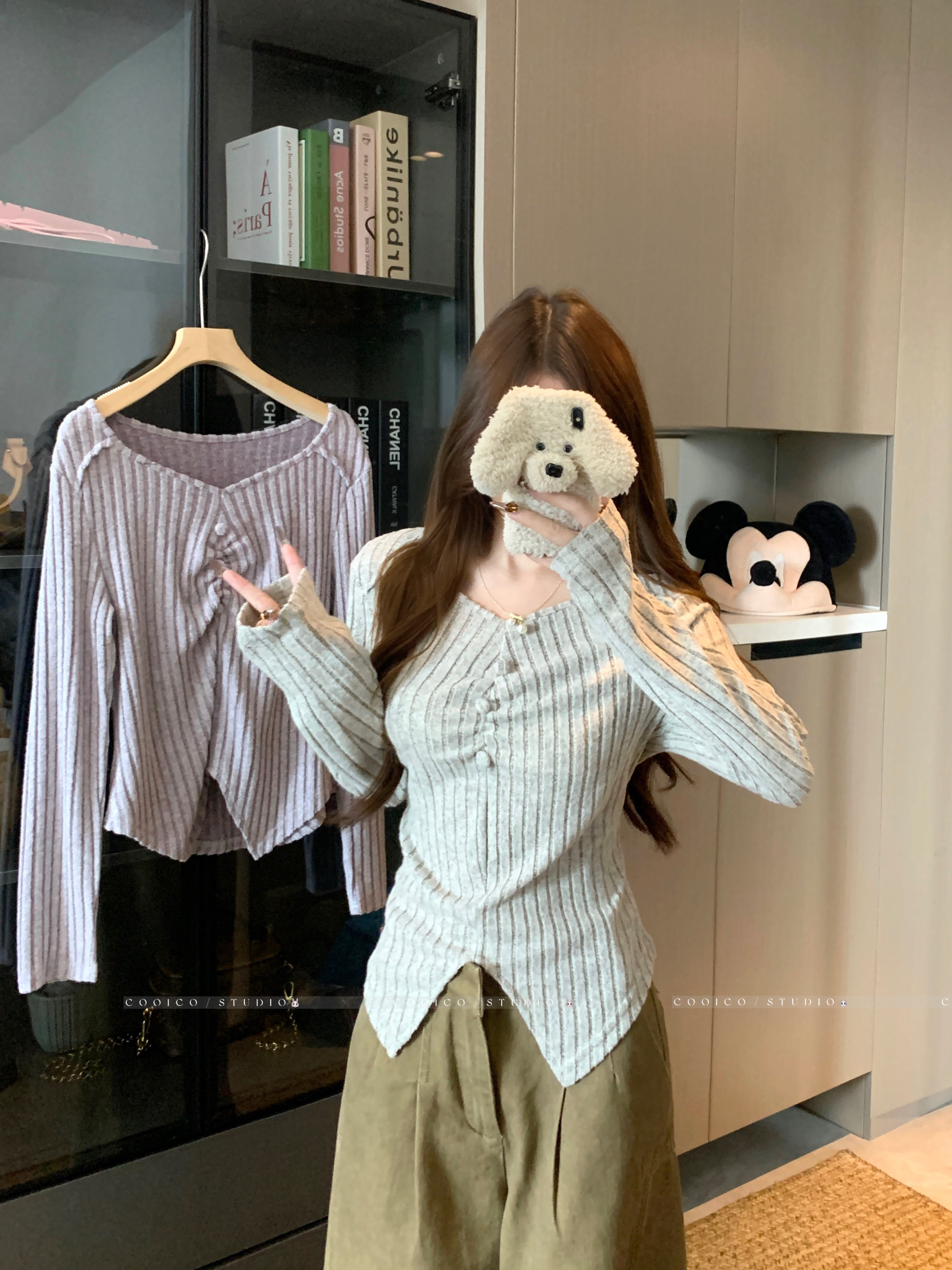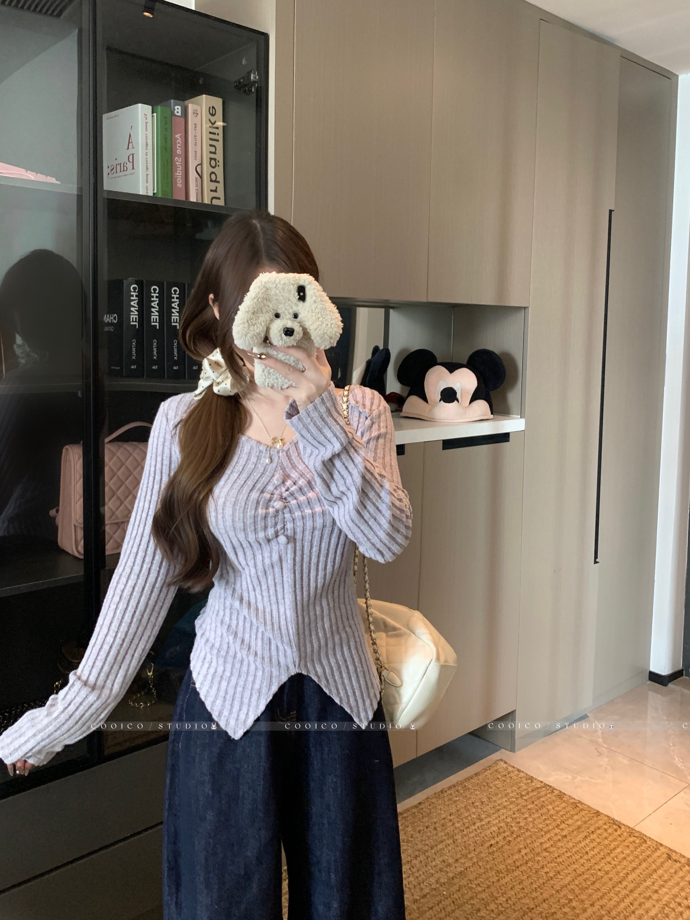 FA42525# 秋装新款胖mm大码纯欲修身v领长袖T恤褶皱不规则打底上衣 服裝批發女裝批發服飾貨源
