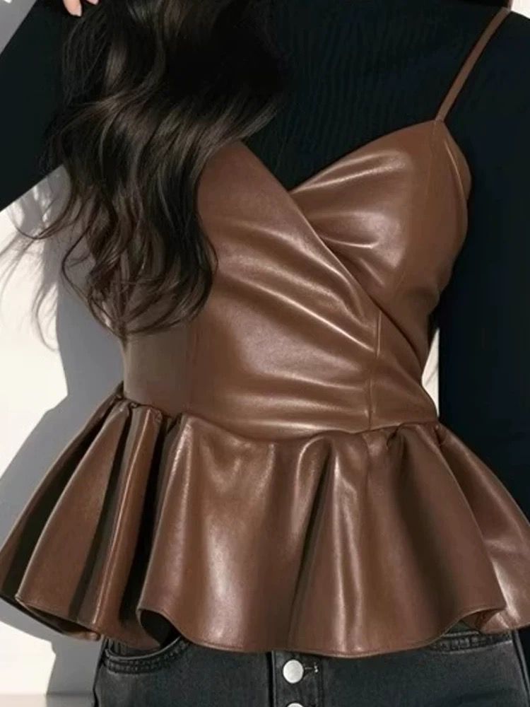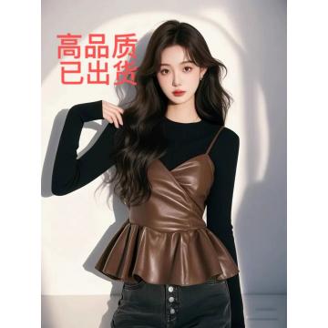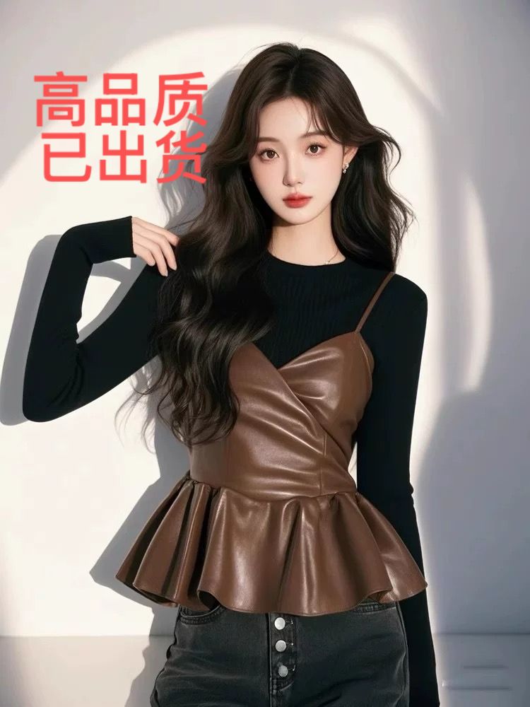 FA42529# 春秋复古辣妹咖色收腰真两件皮上衣女设计感超好看显瘦长袖打底衫 服裝批發女裝批發服飾貨源
