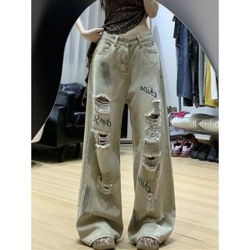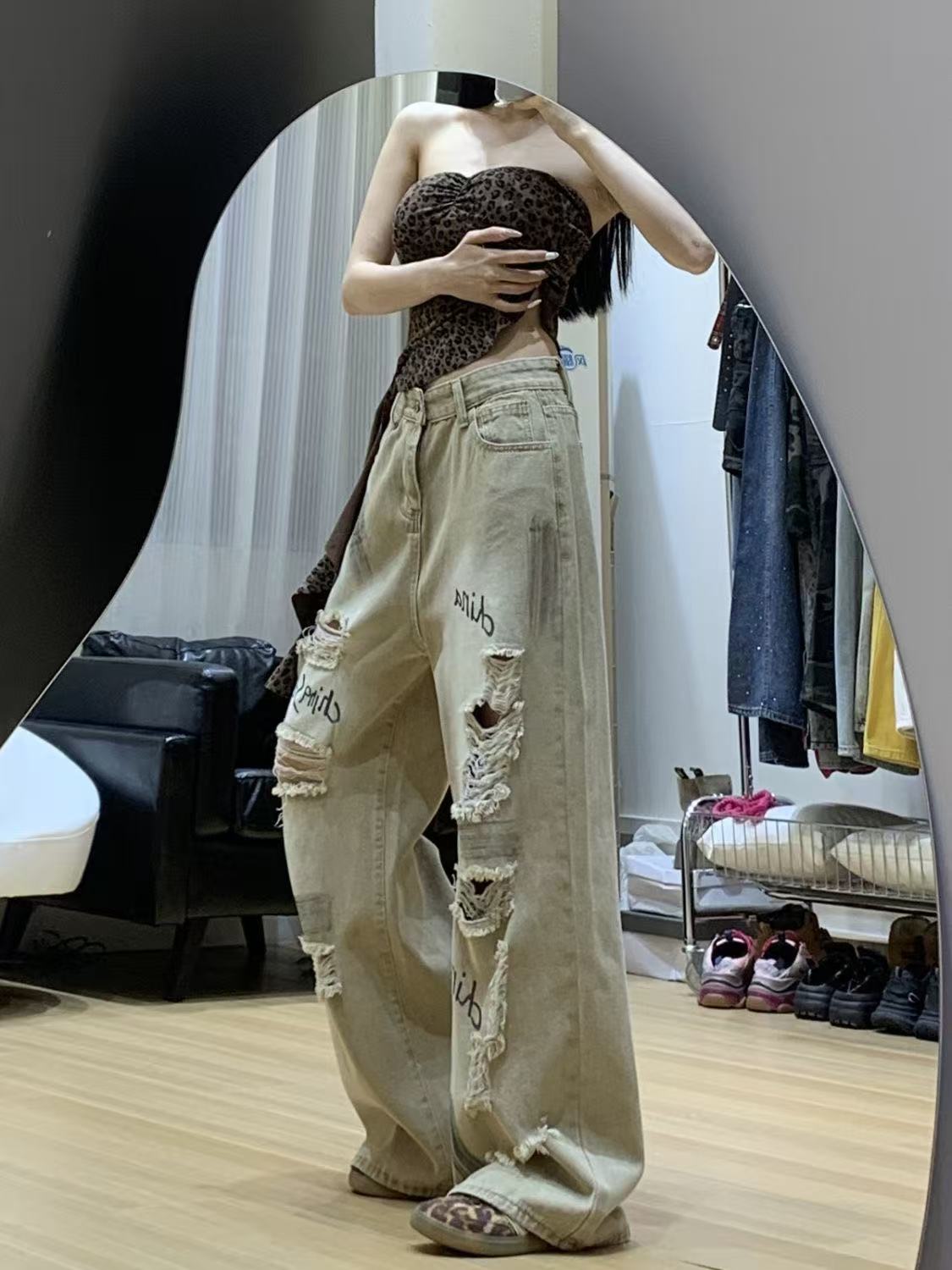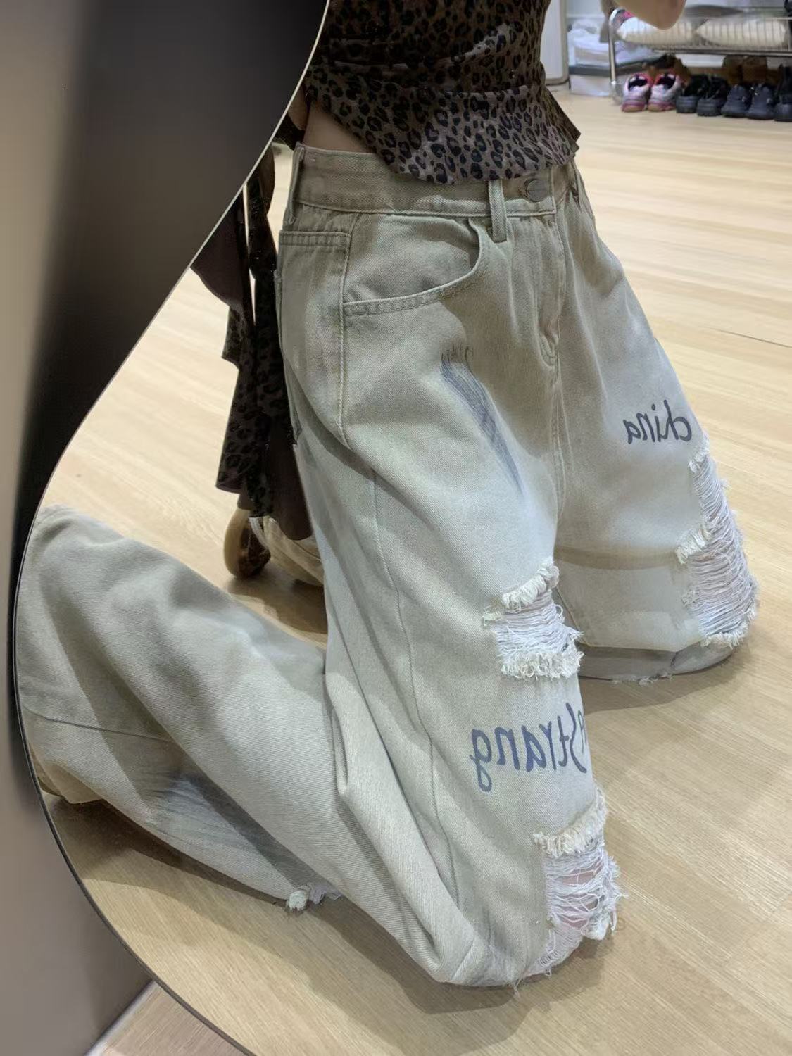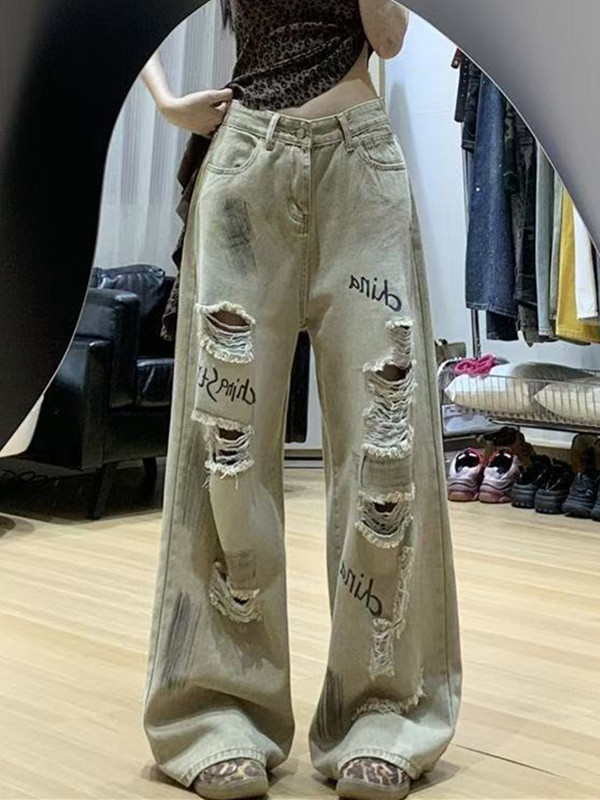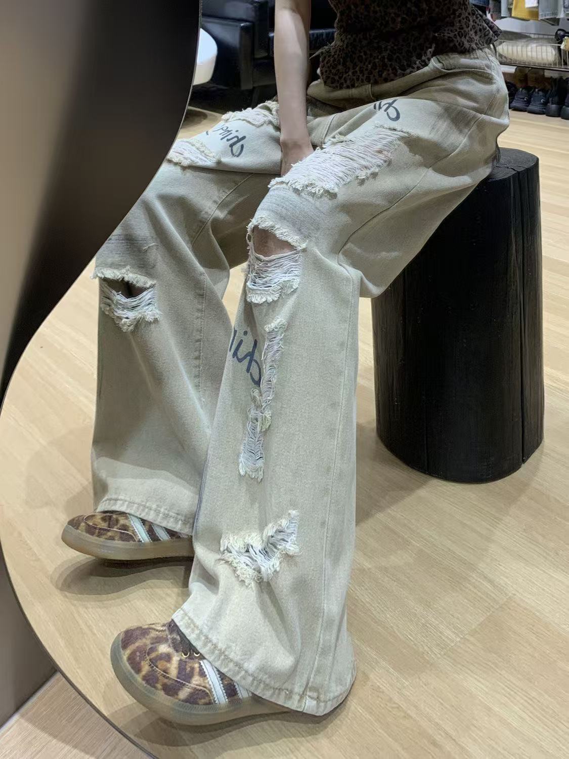 FA42535# 高个子加长美式复古杏色印花破洞牛仔裤女秋季高腰直筒阔腿拖地裤 服裝批發女裝批發服飾貨源