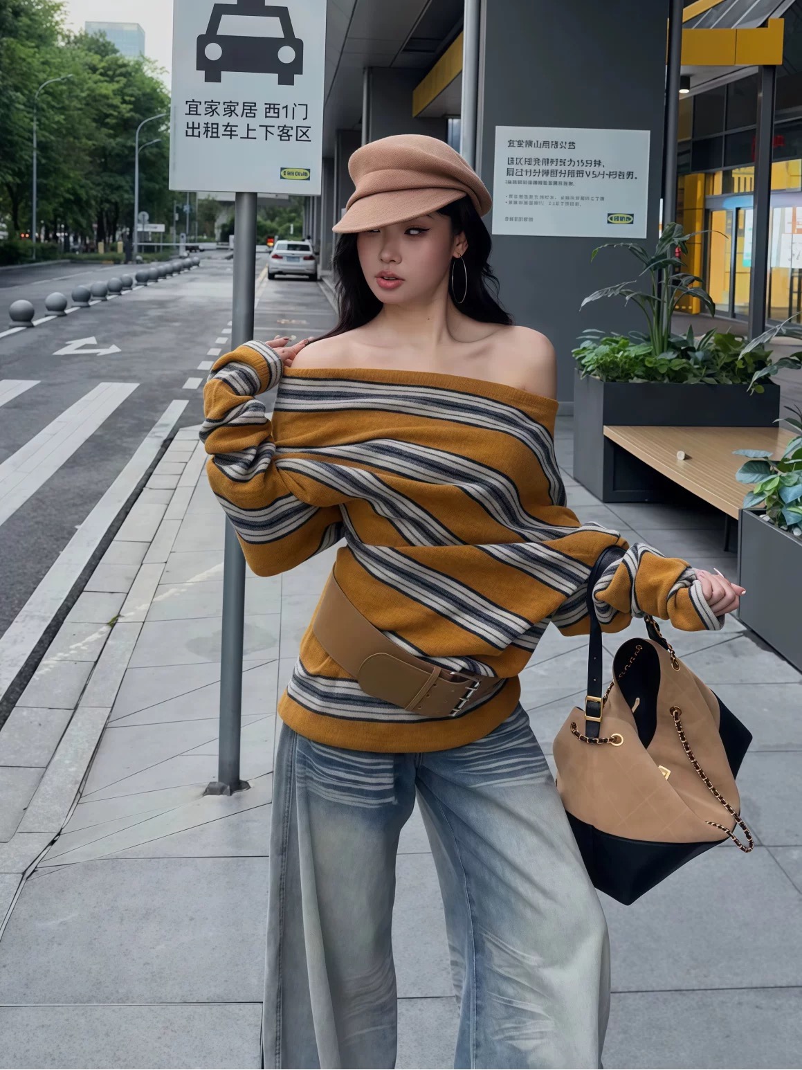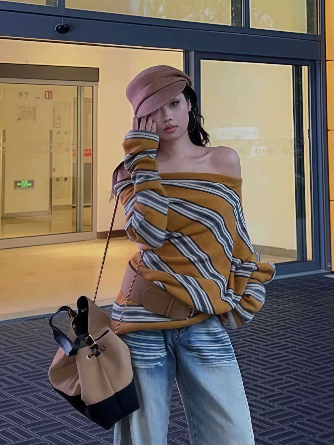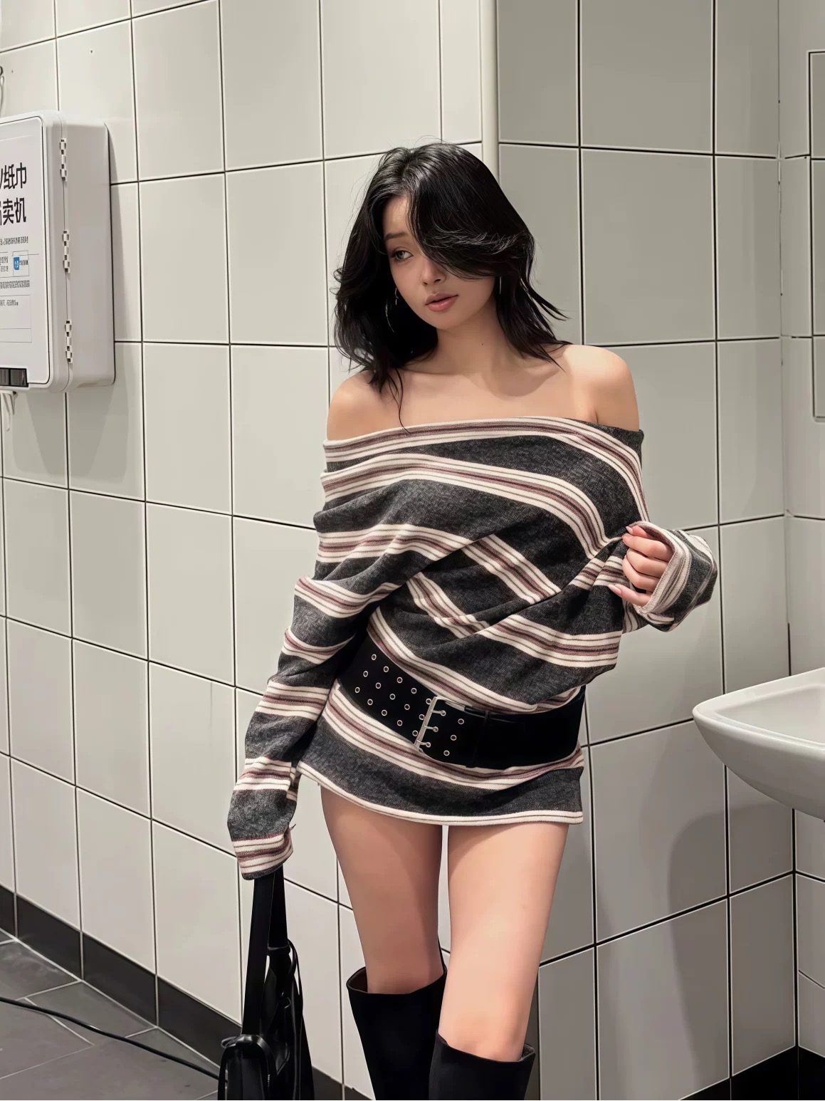 FA42538# 性感辣妹撞色条纹一字领露肩针织衫女装秋季新款宽松百搭长袖上衣 服裝批發女裝批發服飾貨源
