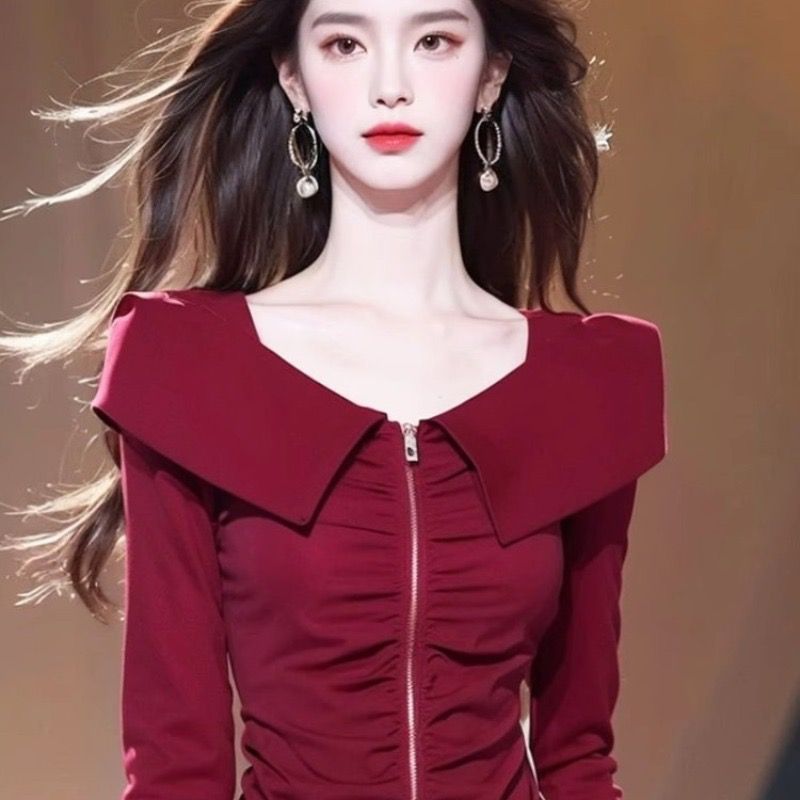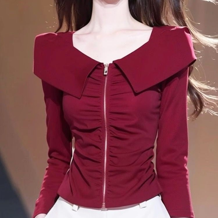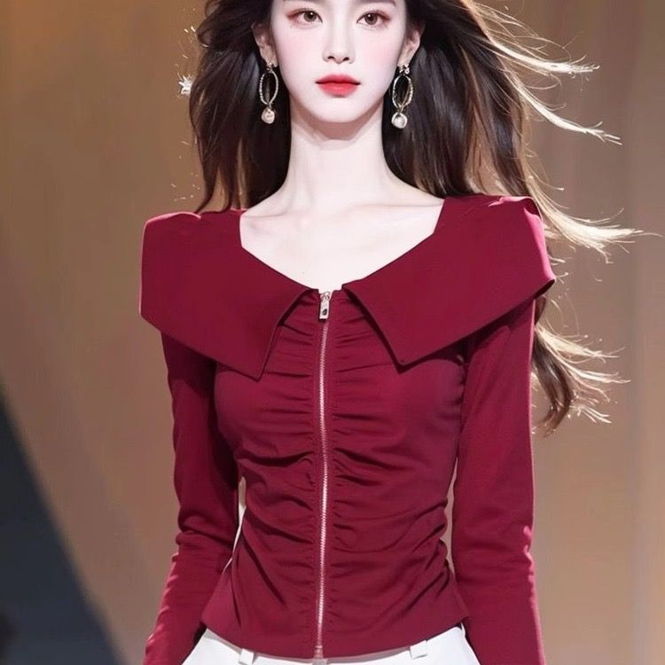 FA42541# 早秋新款洋气高端别致小衫气质法式高级感红色翻领衬衫上衣女 服裝批發女裝批發服飾貨源