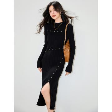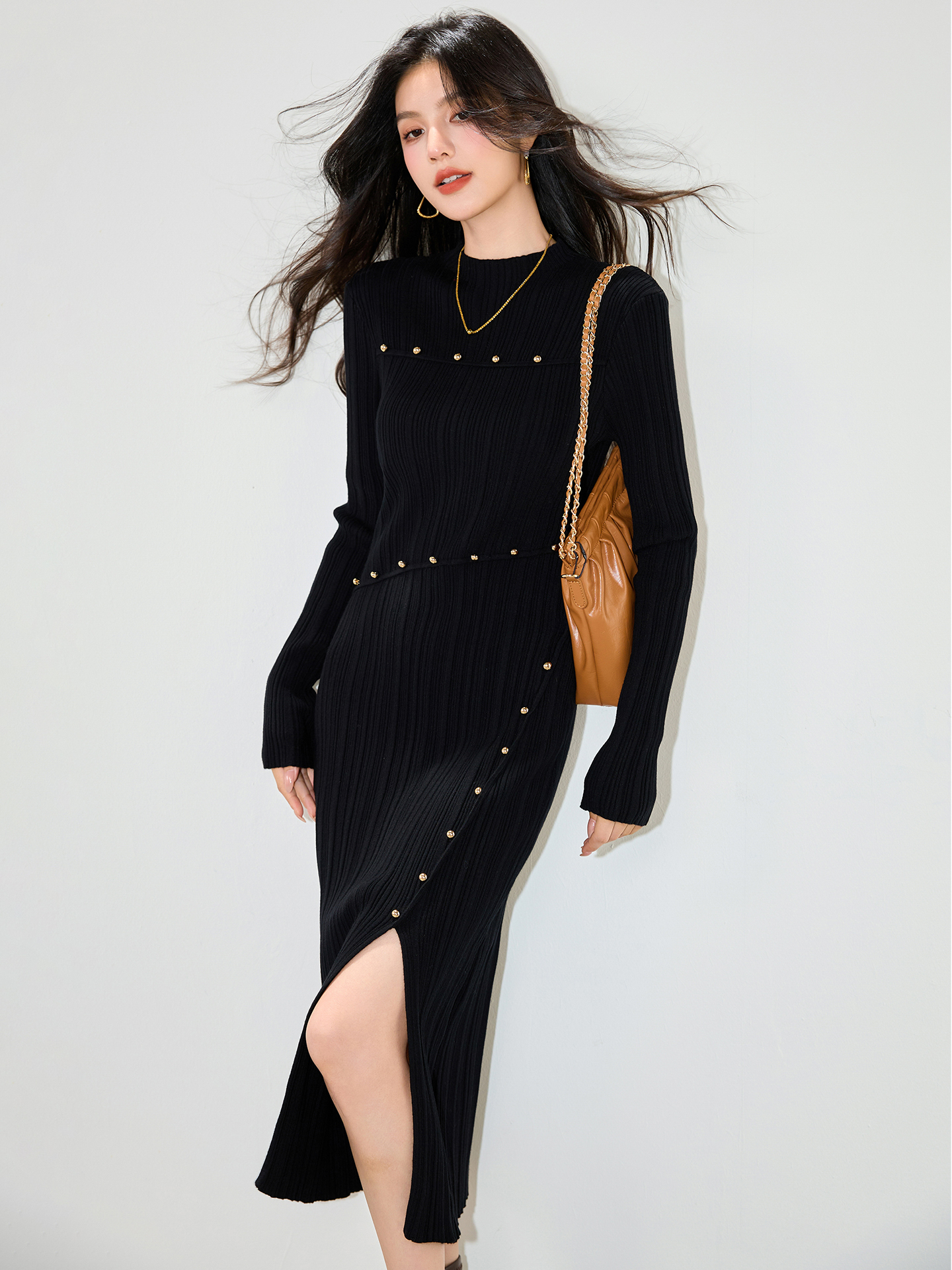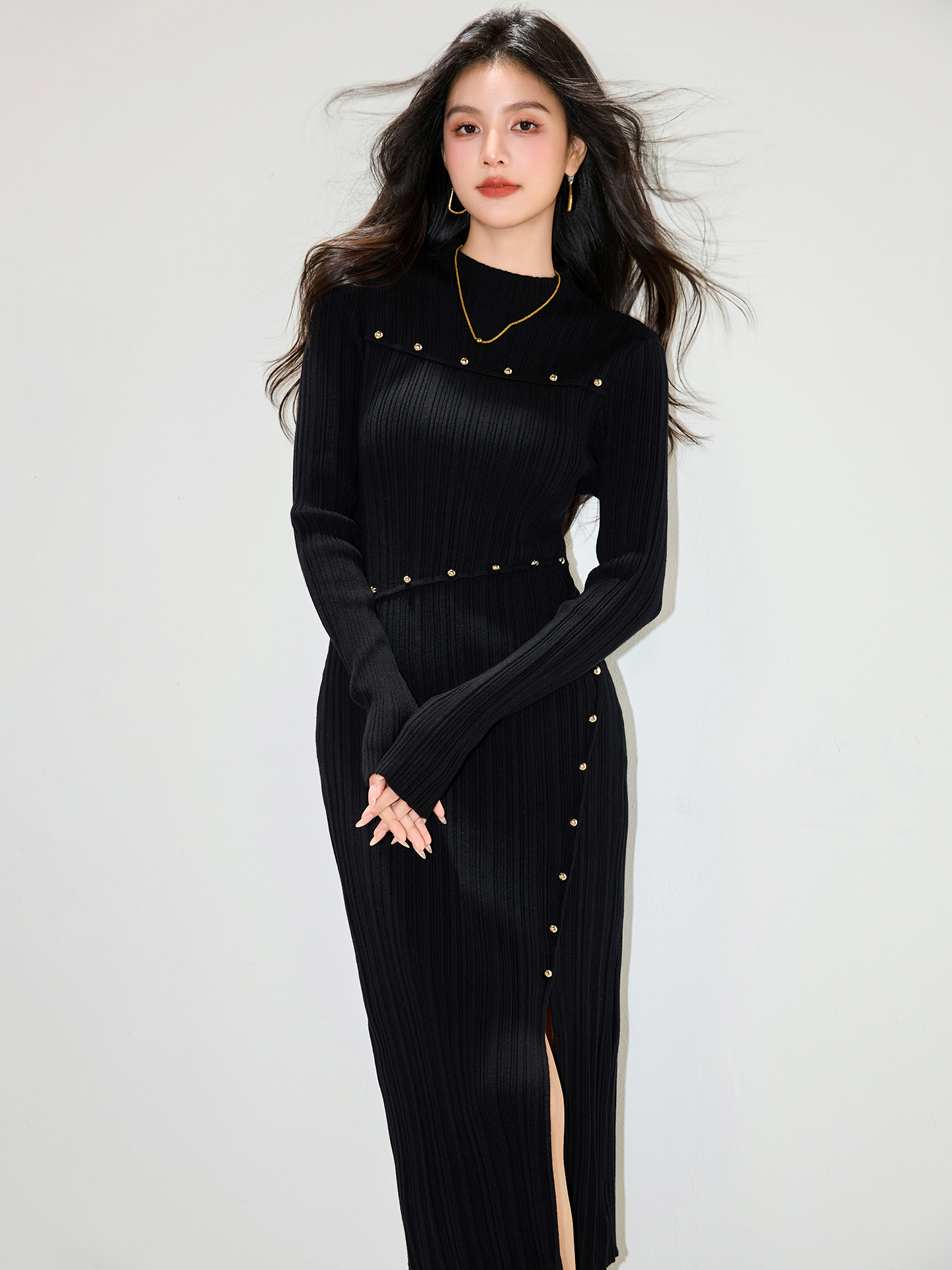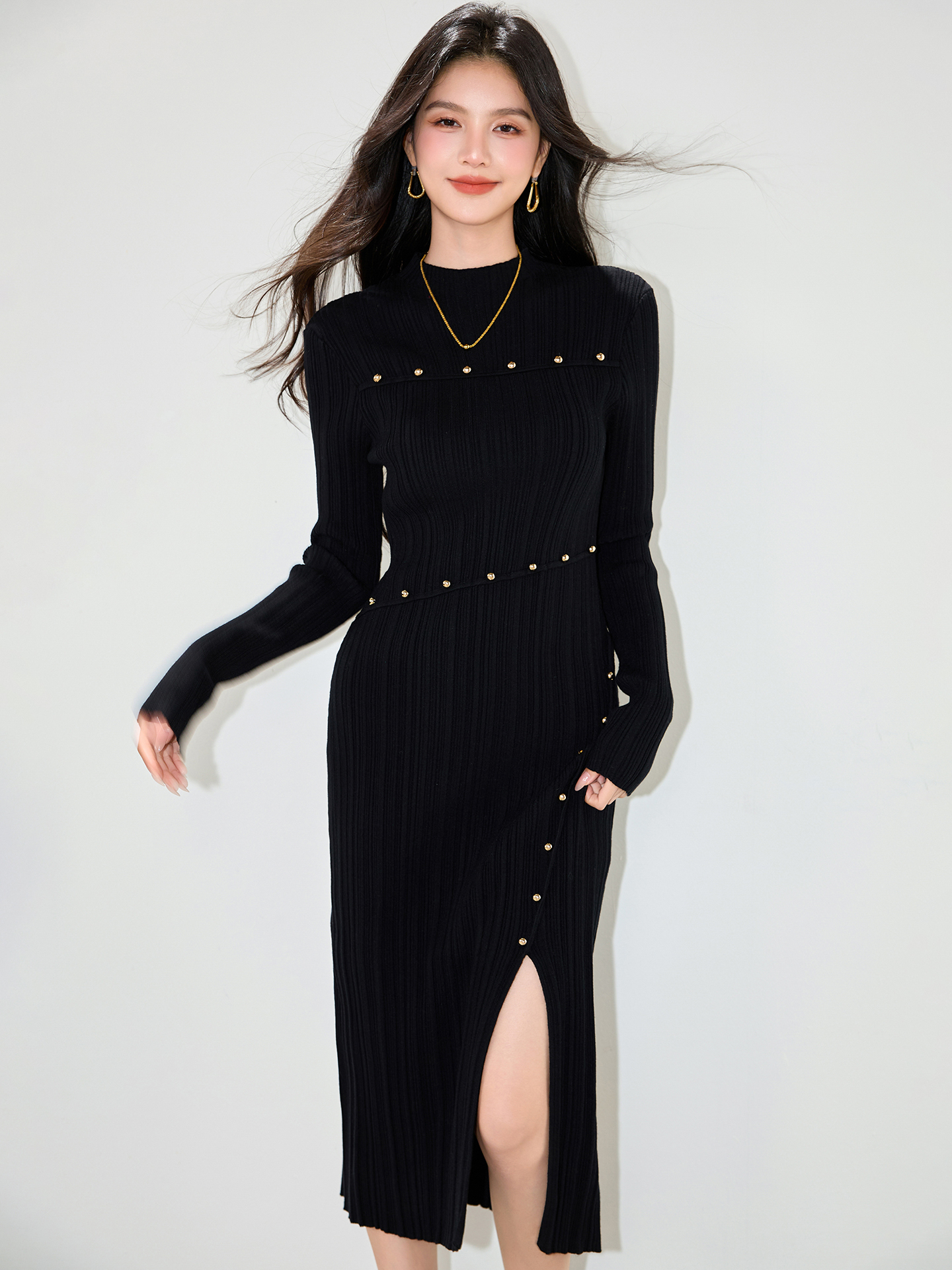 FA42562# 秋冬气质黑色连衣针织连衣裙设计感显瘦长裙女打底内搭 服裝批發女裝批發服飾貨源