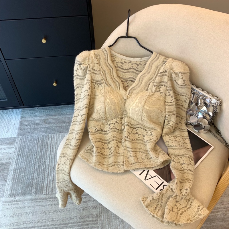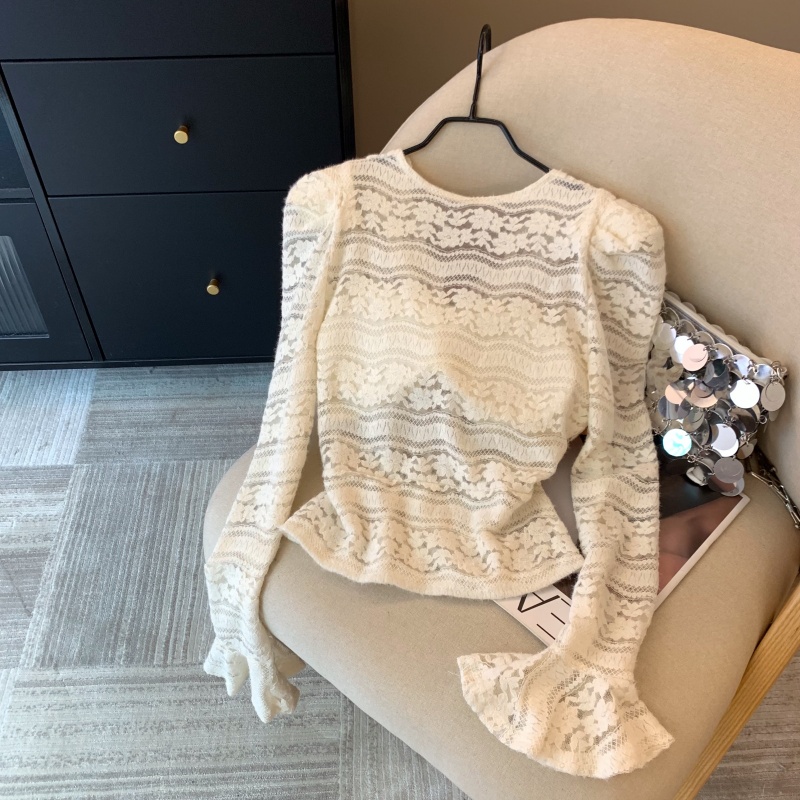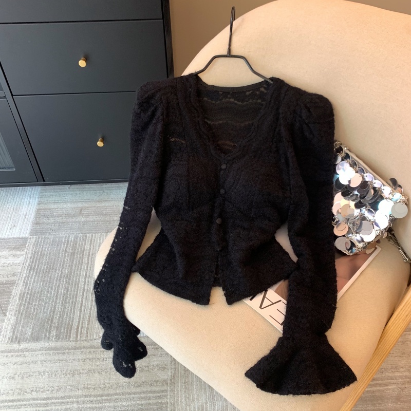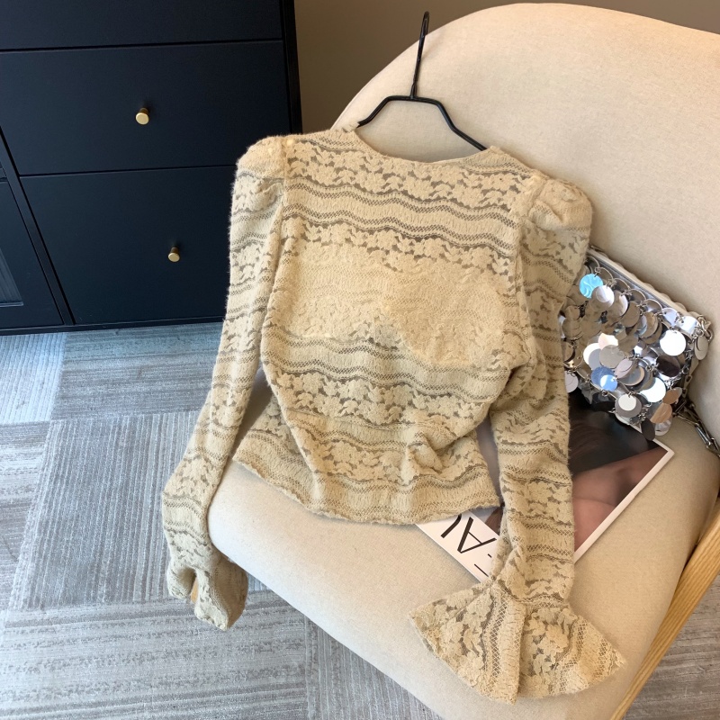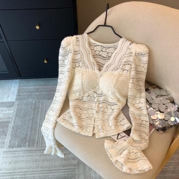 FA42563# 上不规则泡泡袖衬衫女秋纯欲v领喇叭袖上衣带胸垫蕾丝打底衫 服裝批發女裝批發服飾貨源