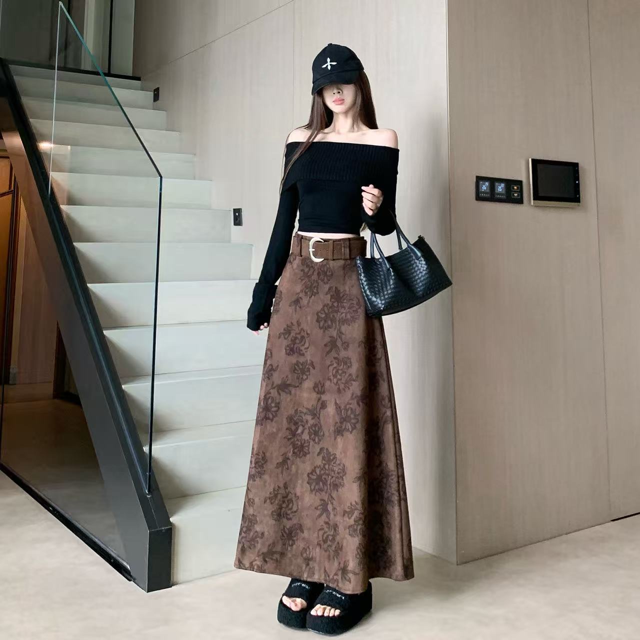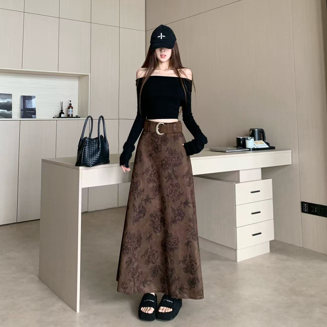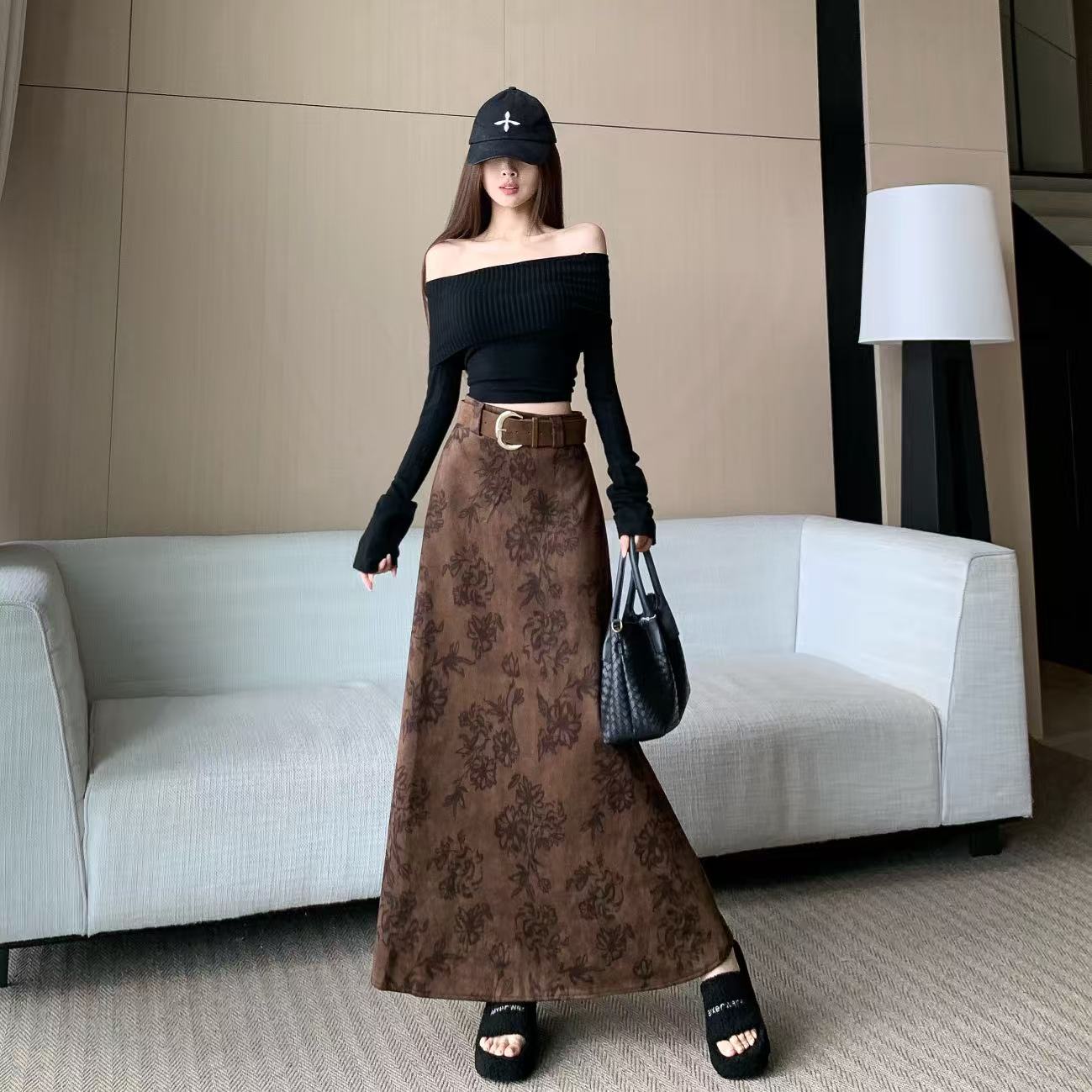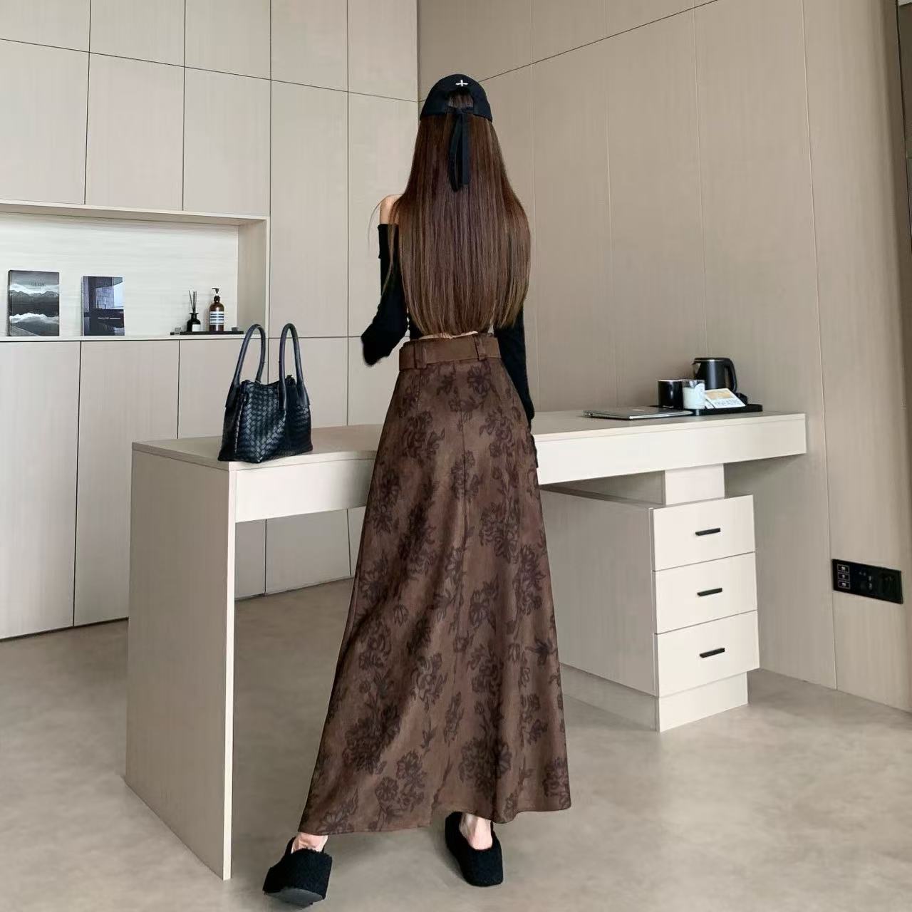 FA42567# 气质复古印花咖色半身裙女秋冬新款设计感高腰显瘦长时尚长裙 服裝批發女裝批發服飾貨源