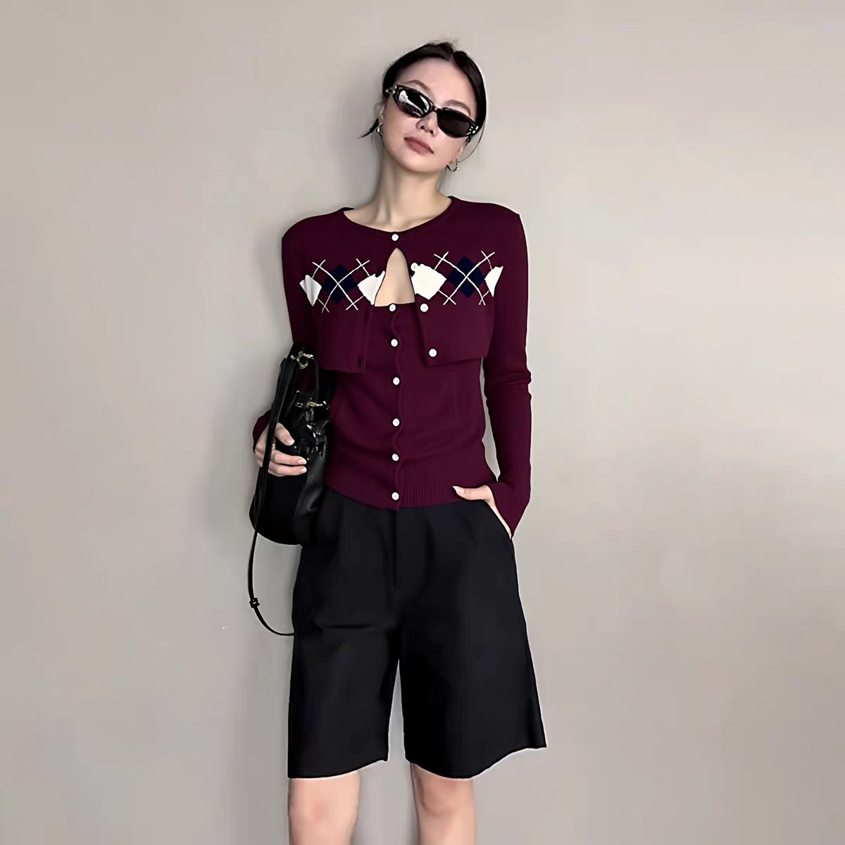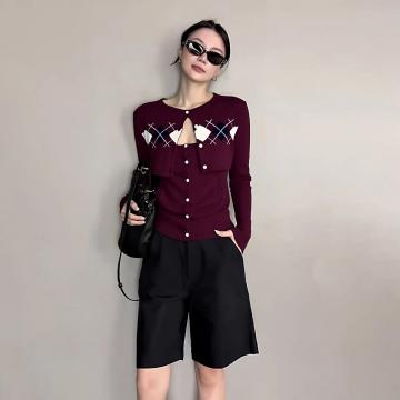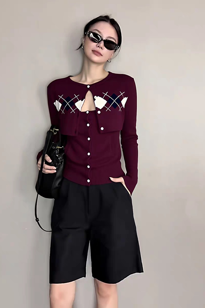 FA42571# 韩系秋季氛围感穿搭慵懒高级感红色菱格针织开衫配吊带两件套 服裝批發女裝批發服飾貨源