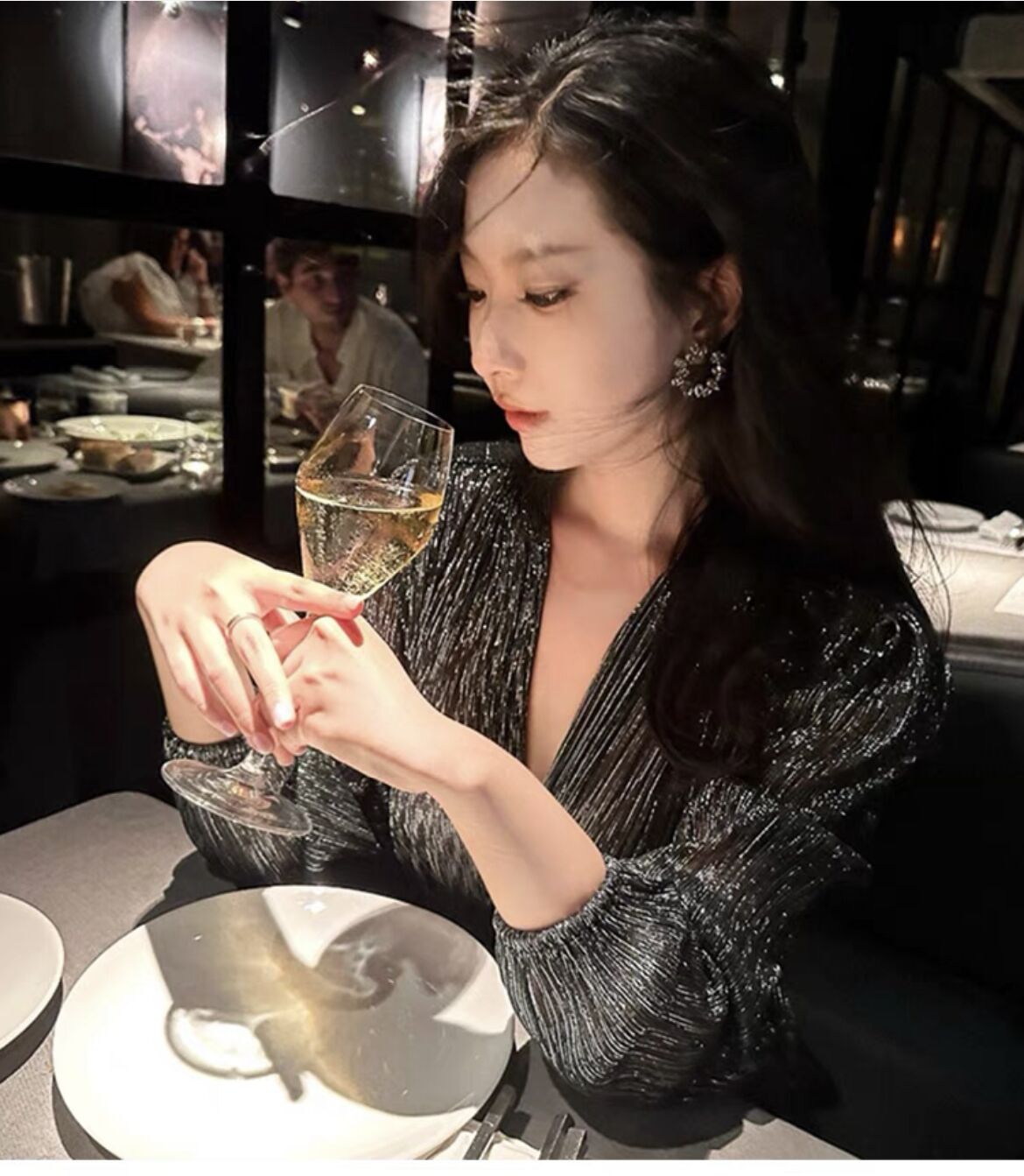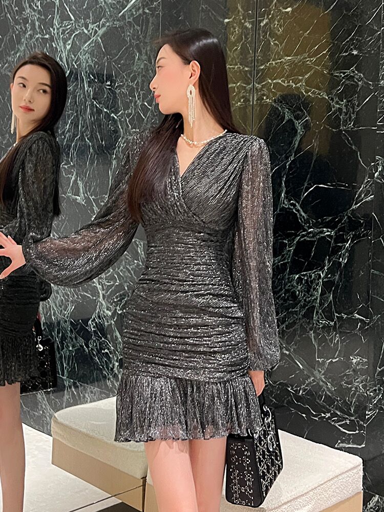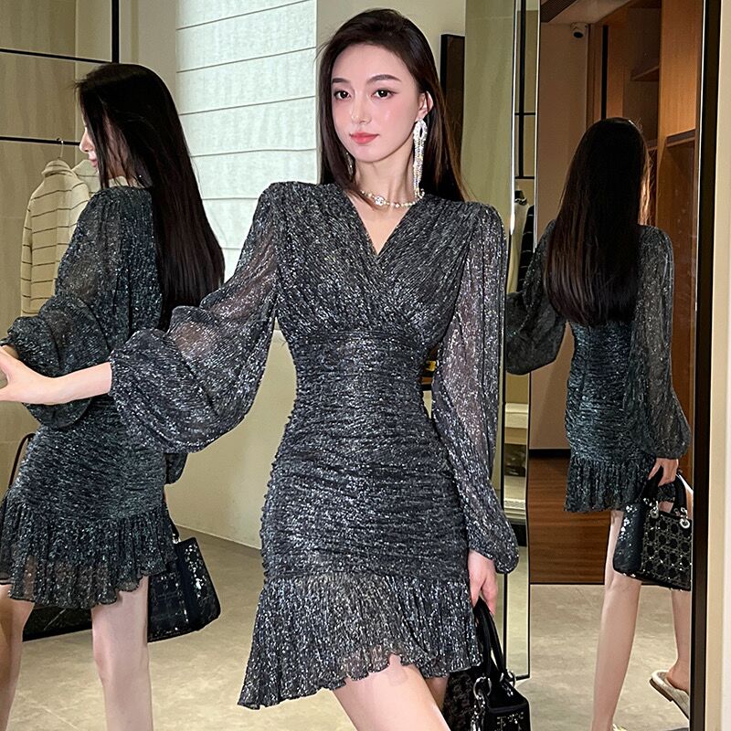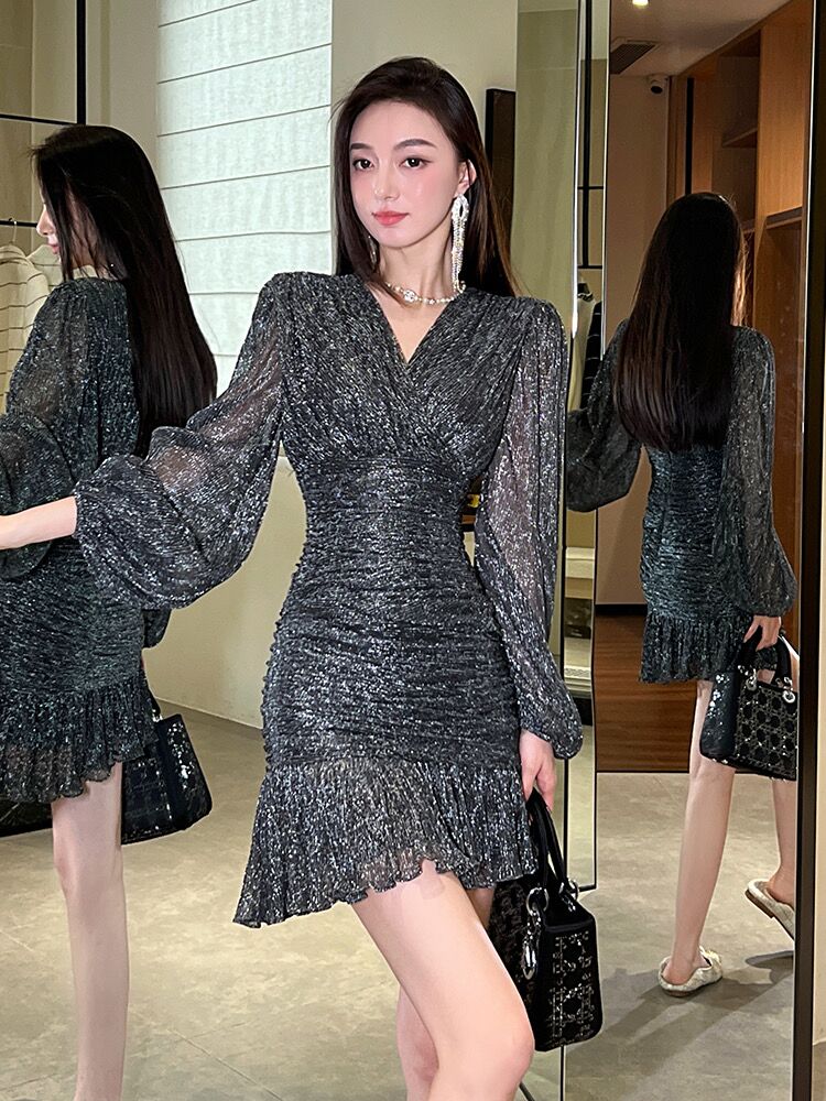 FA42574# 性感修身显身材V领亮丝连衣裙女独特别致名媛风高腰荷叶边短裙子 服裝批發女裝批發服飾貨源