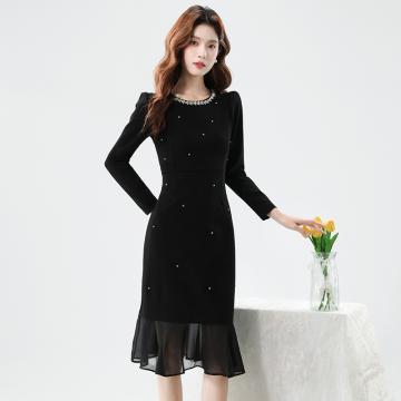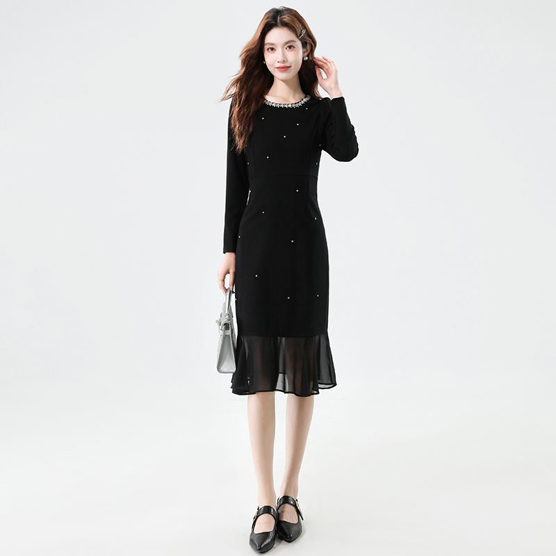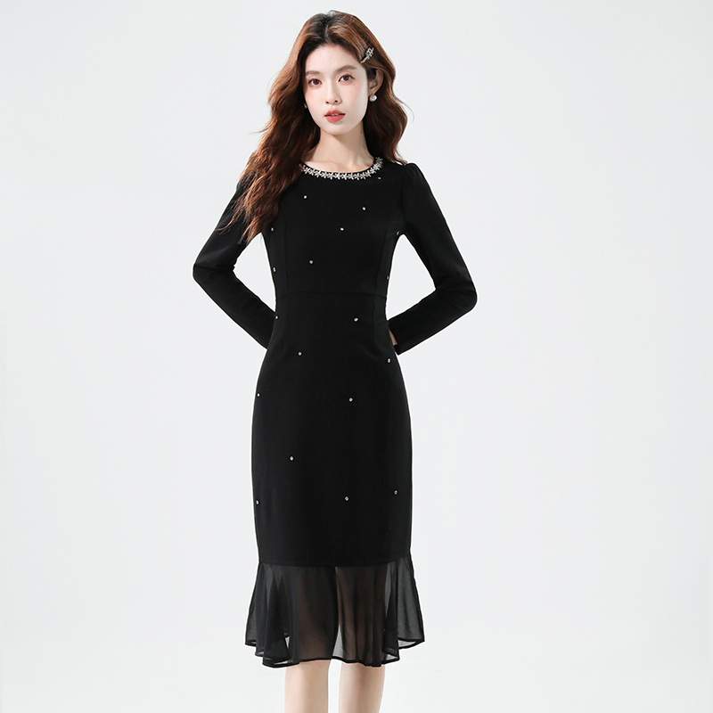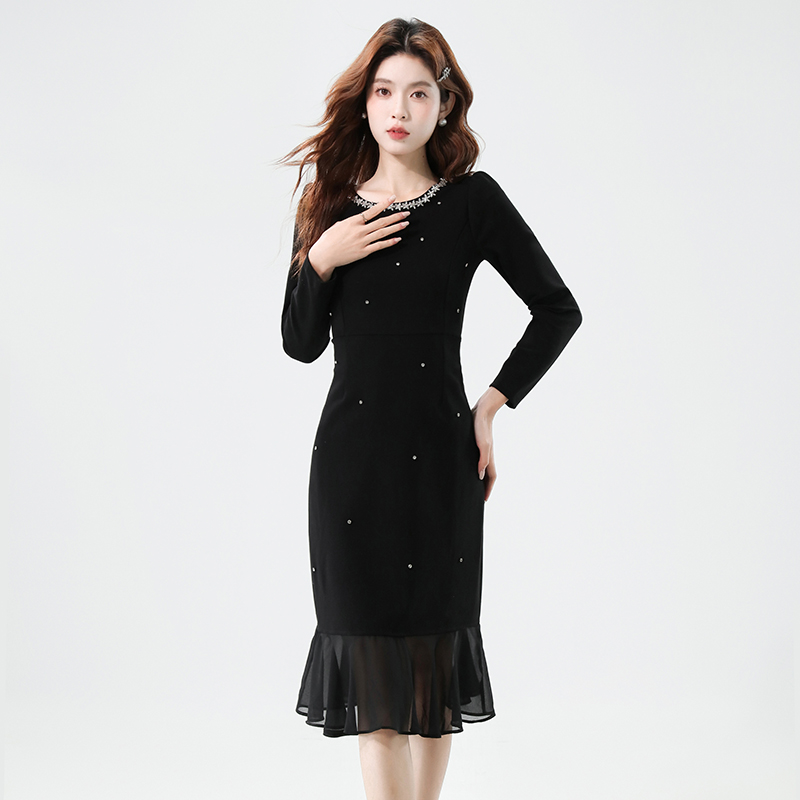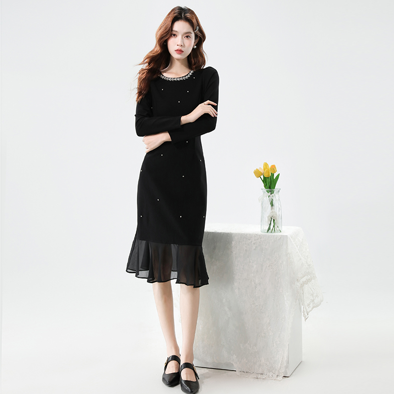FA42578# 秋季时尚钉钻重工气质显瘦雪纺拼接鱼尾连衣裙 服裝批發女裝批發服飾貨源