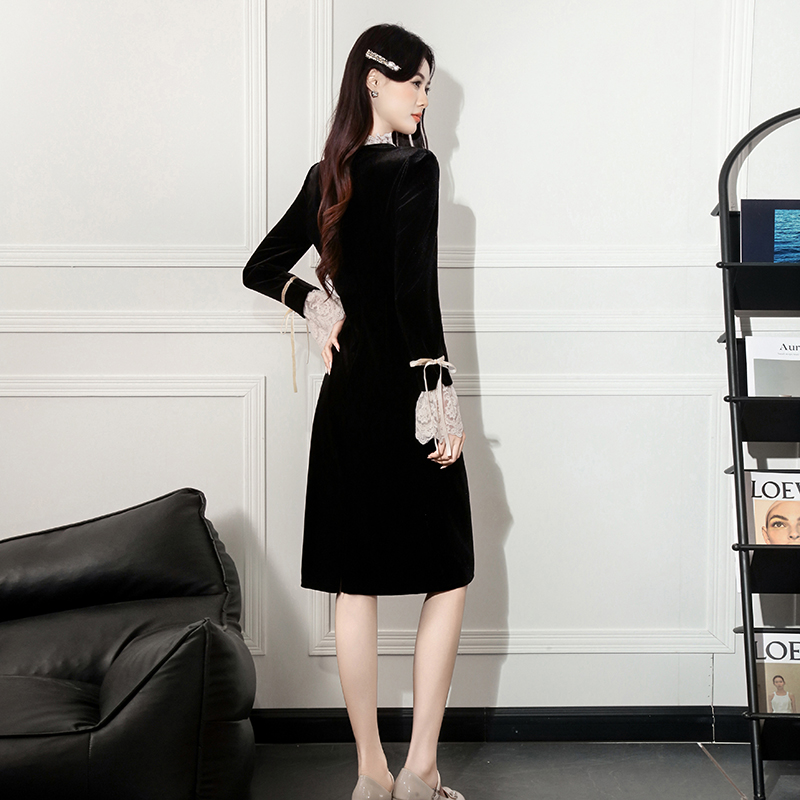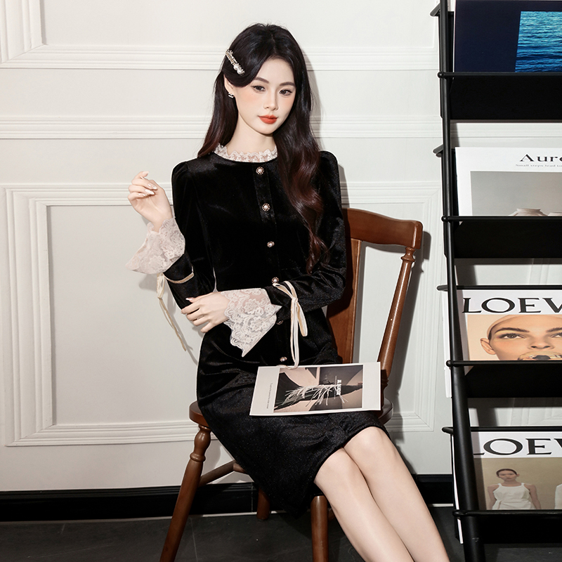 FA42581# 秋新款法式优雅蕾丝边名媛气质修身显瘦中长款丝绒连衣裙 服裝批發女裝批發服飾貨源