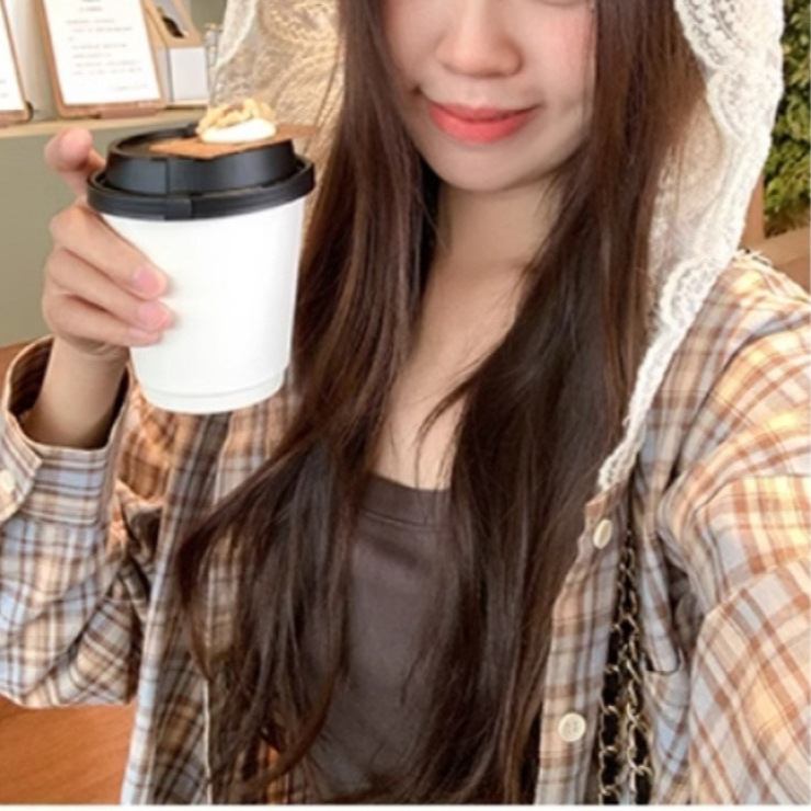 FA42793# 韩系慵懒风连帽上衣女春秋甜酷小个子格纹蕾丝拼接衬衫 服裝批發女裝批發服飾貨源