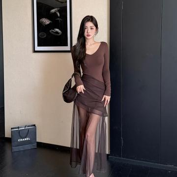 FA42802# 一纸云烟!V领修身针织天丝连衣裙女秋冬季气质收腰网纱长裙 服裝批發女裝批發服飾貨源