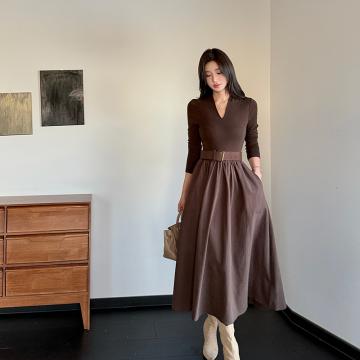 FA42805# 陌野复古卡其长袖连衣裙女高腰显瘦A字百褶裙长裙 服裝批發女裝批發服飾貨源