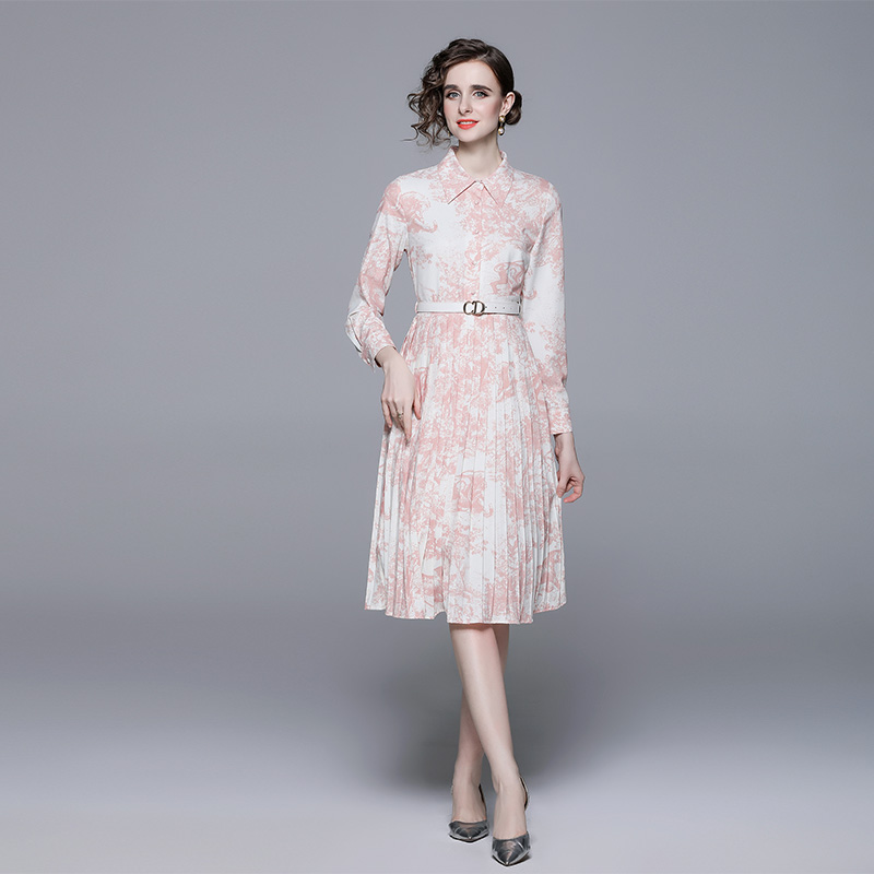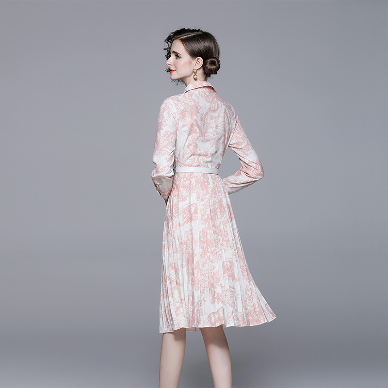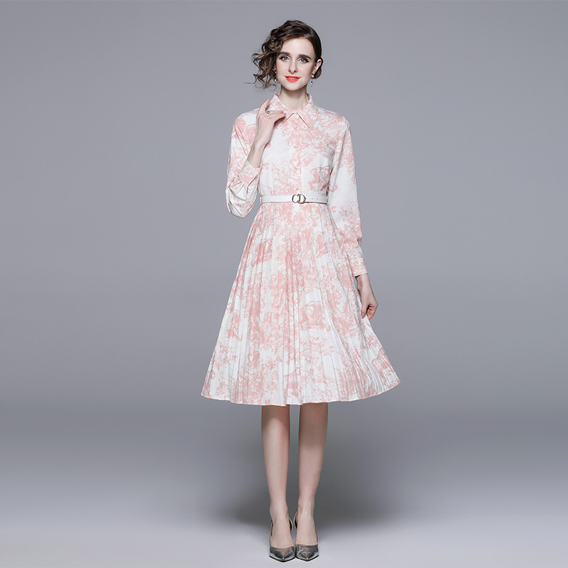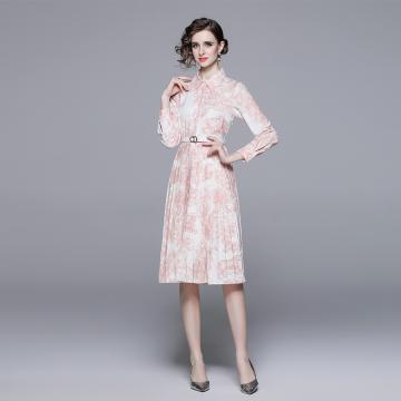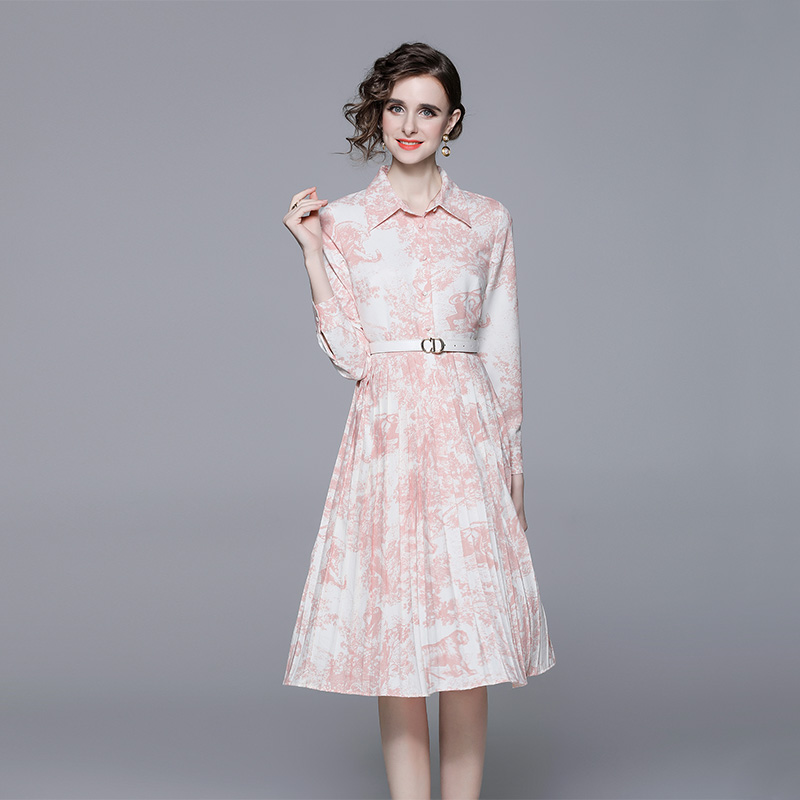 FA43061# 翻领长袖单排扣系带收腰印花中长款气质百褶连衣裙女秋季 服裝批發女裝批發服飾貨源