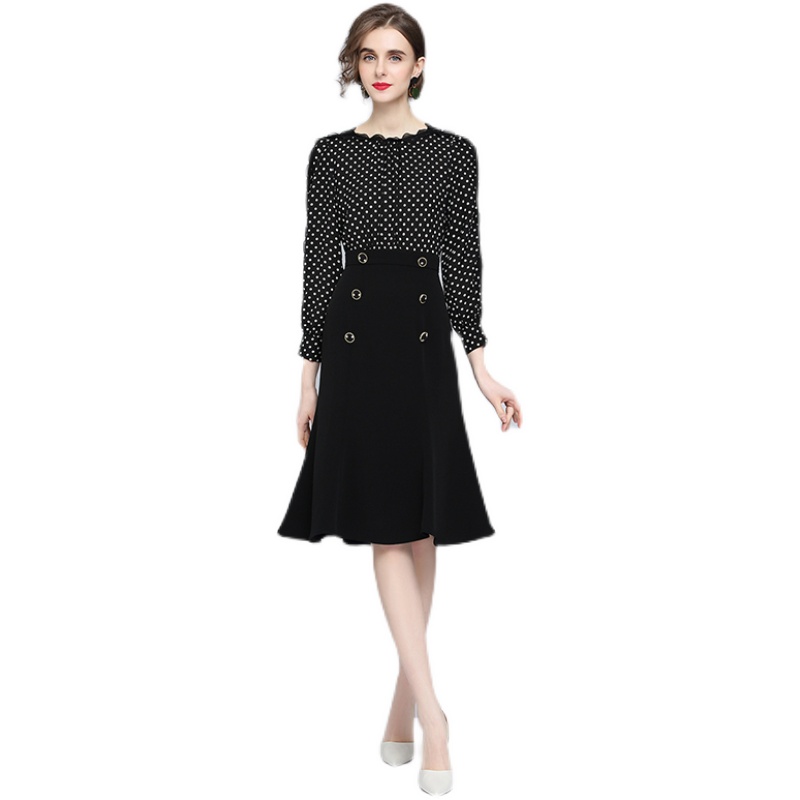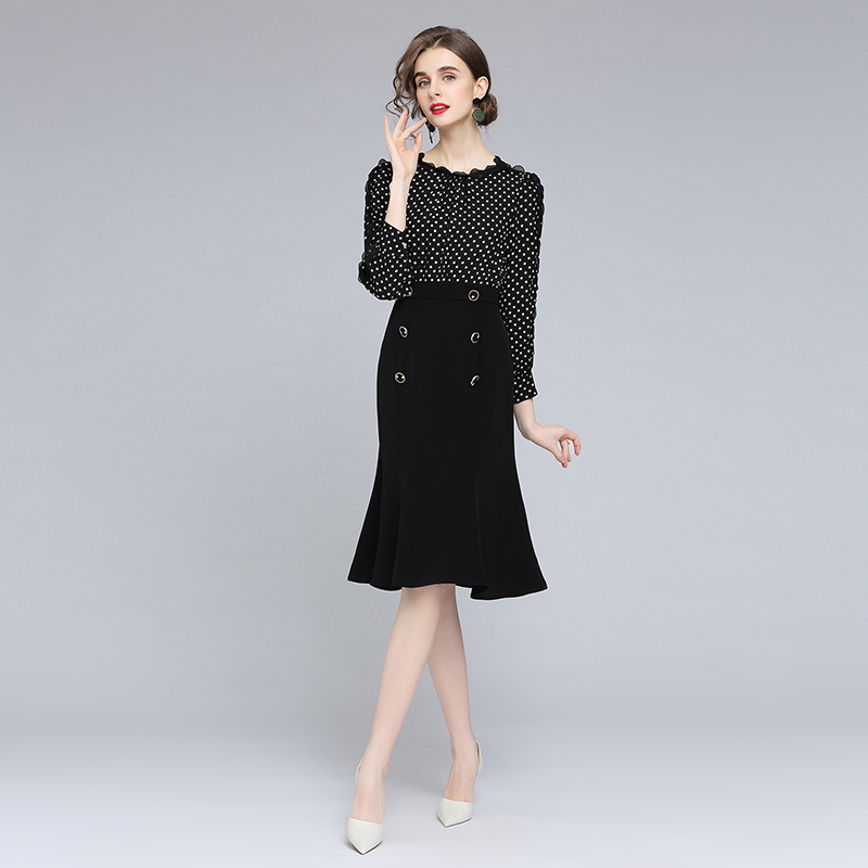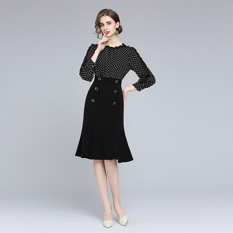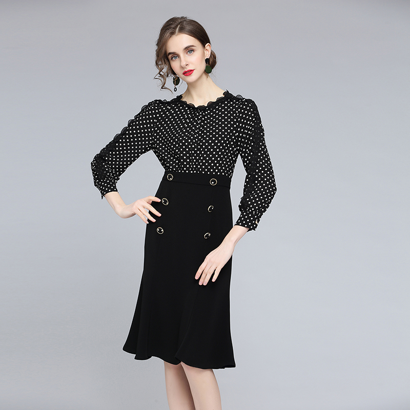 FA43062# -赫本风连衣裙女秋季新款高腰气质显瘦修身波点小黑裙 服裝批發女裝批發服飾貨源