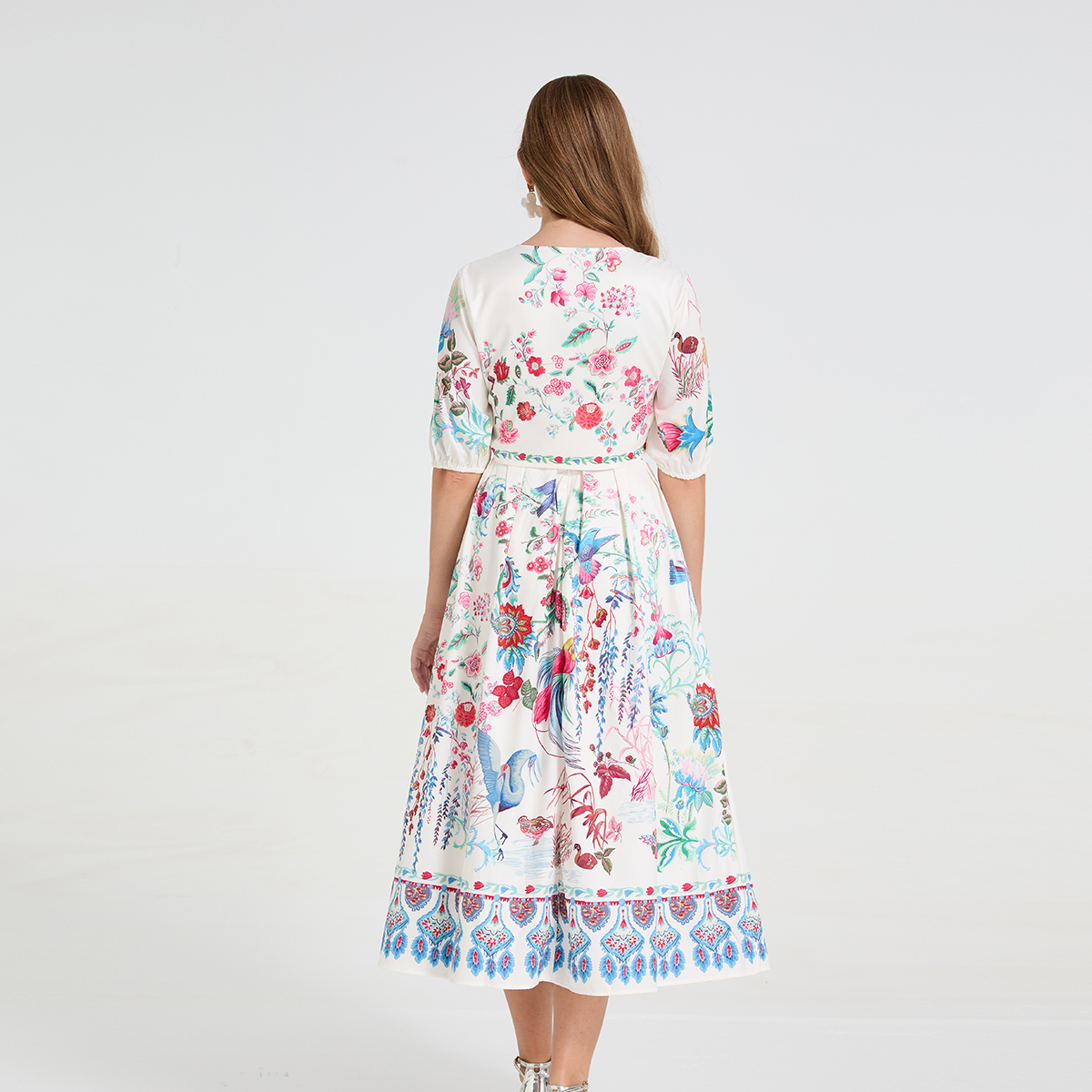 FA44137# 时尚印花镂空绑带圆领中袖上衣+高腰大摆半身裙两件套 服裝批發女裝批發服飾貨源