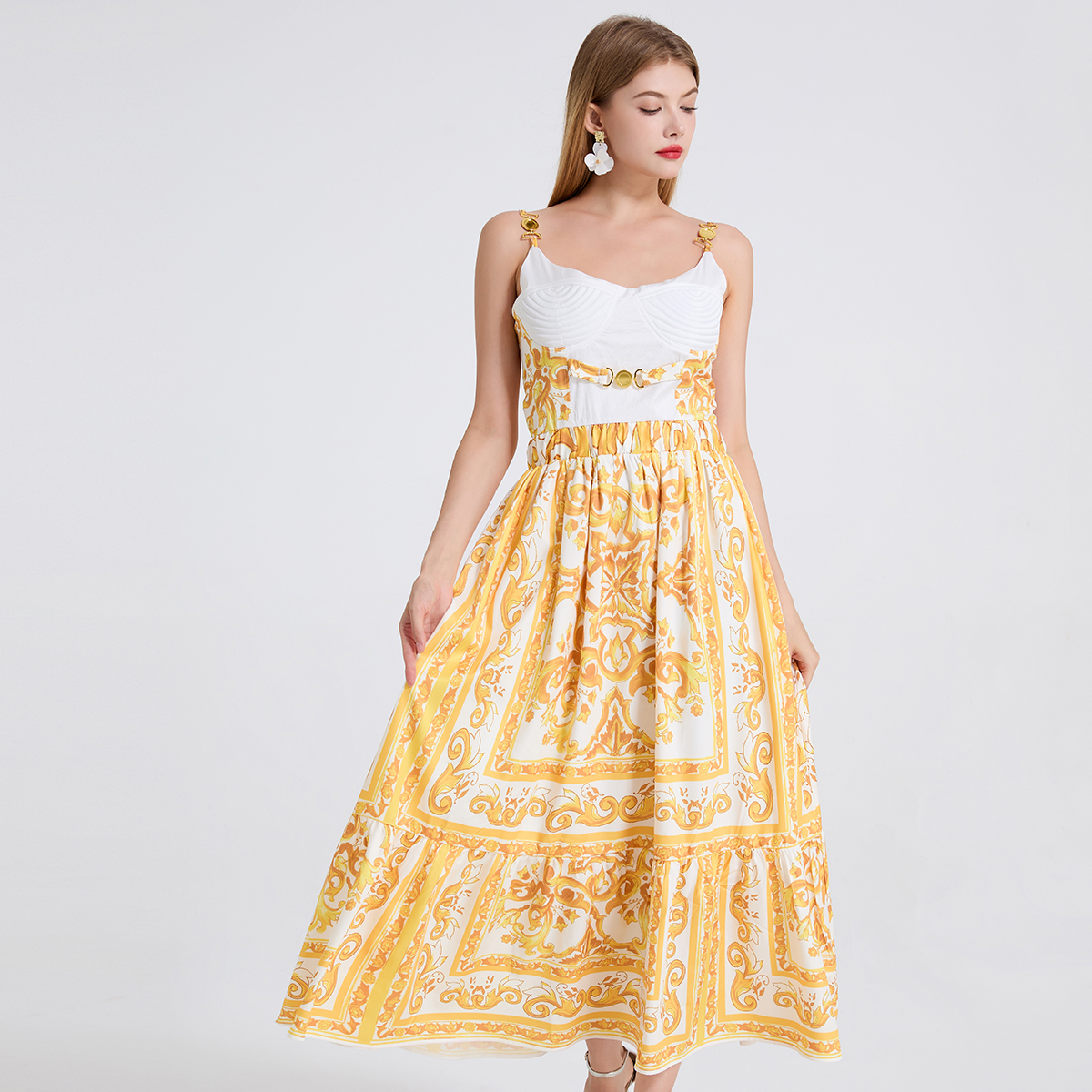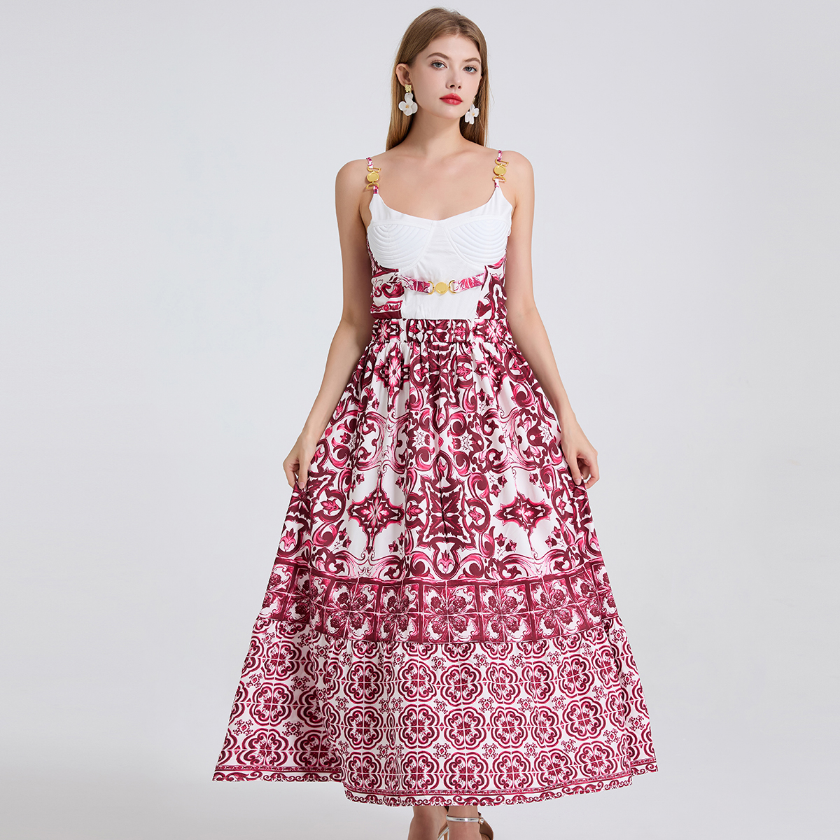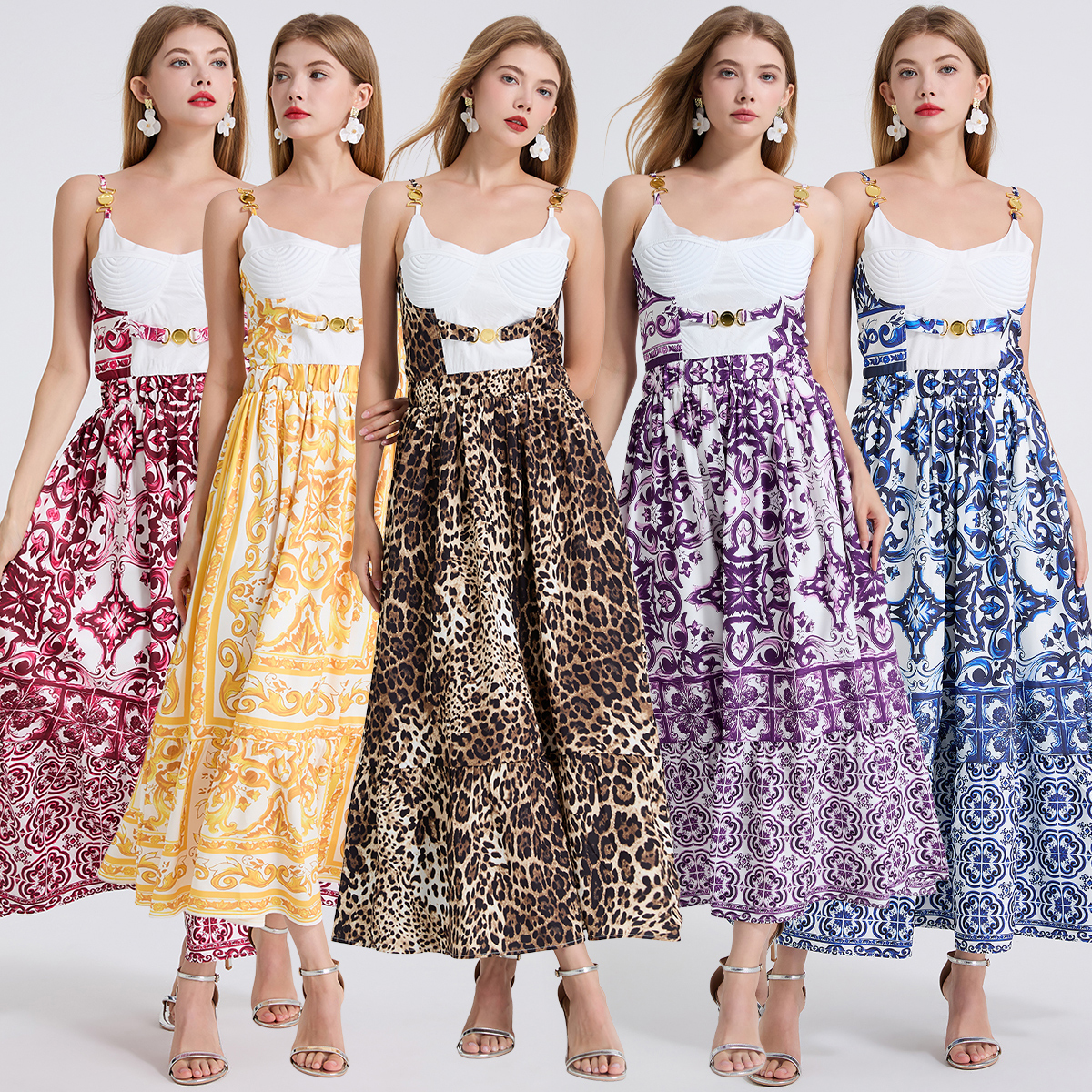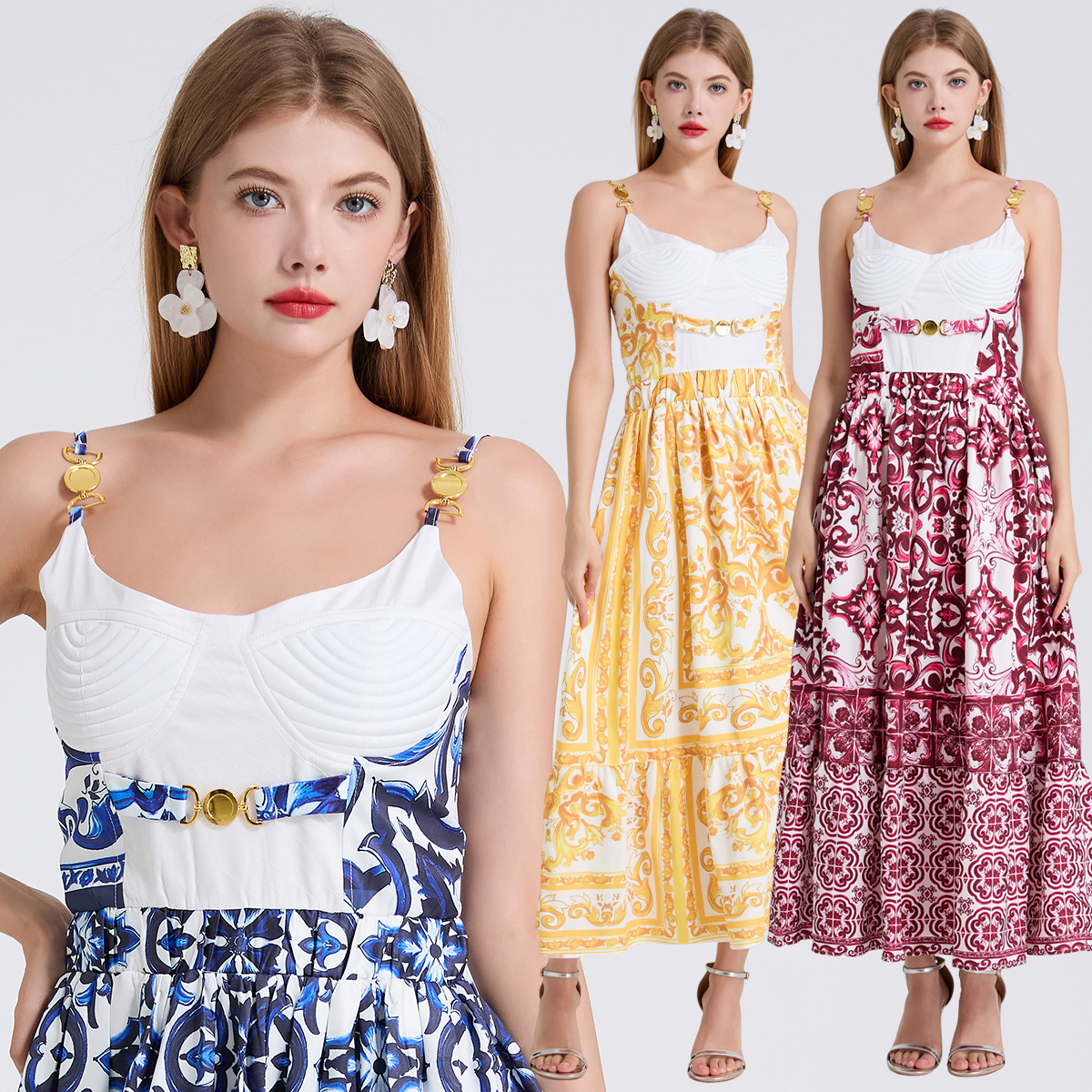 FA44141# 经典5色立体刺绣胸垫金属扣吊带橡筋修身高腰大摆连衣裙 服裝批發女裝批發服飾貨源