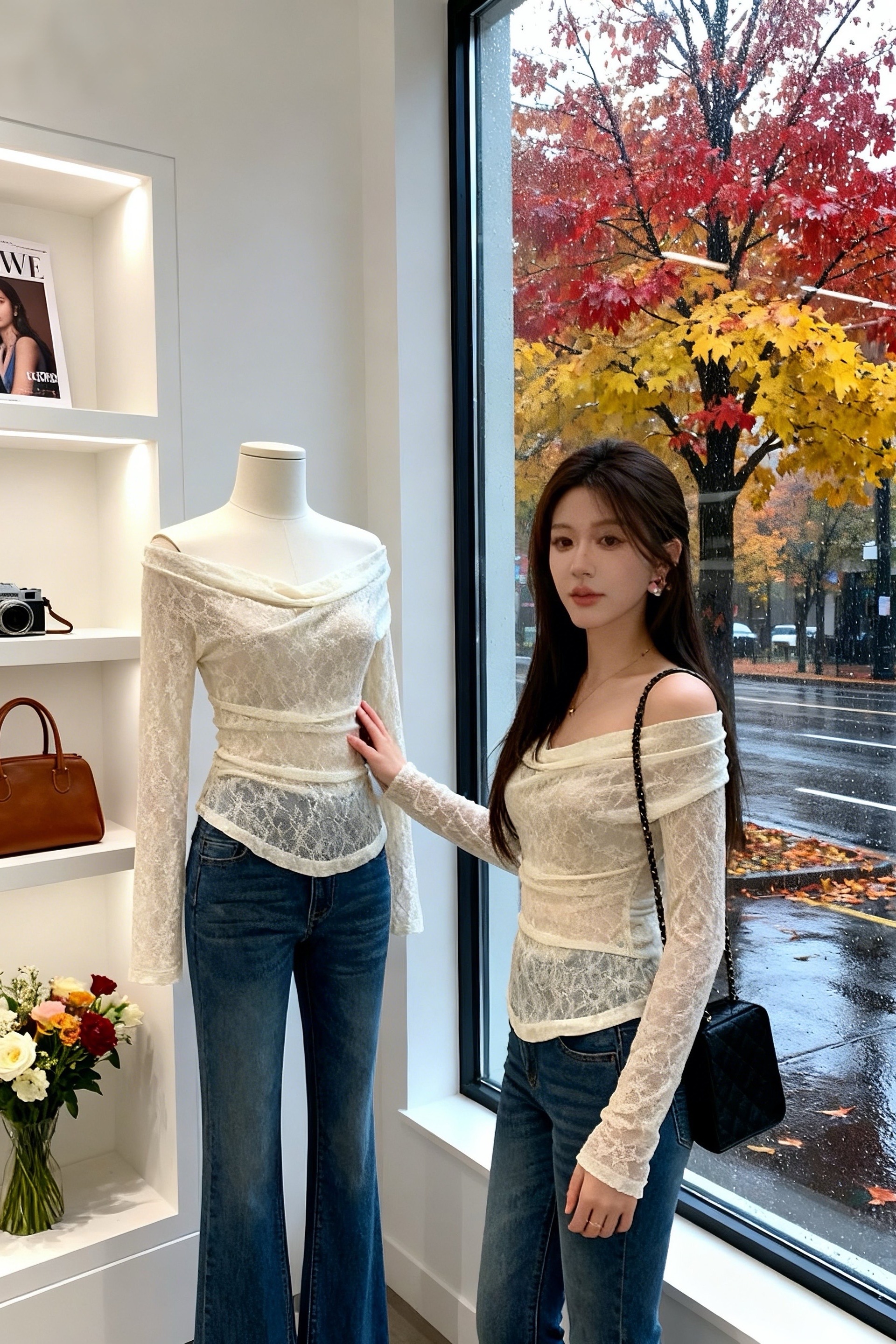 FA45089# 气质荡领斜肩长袖收腰镂空蕾丝衫修身显瘦上衣女秋装新款 服裝批發女裝批發服飾貨源